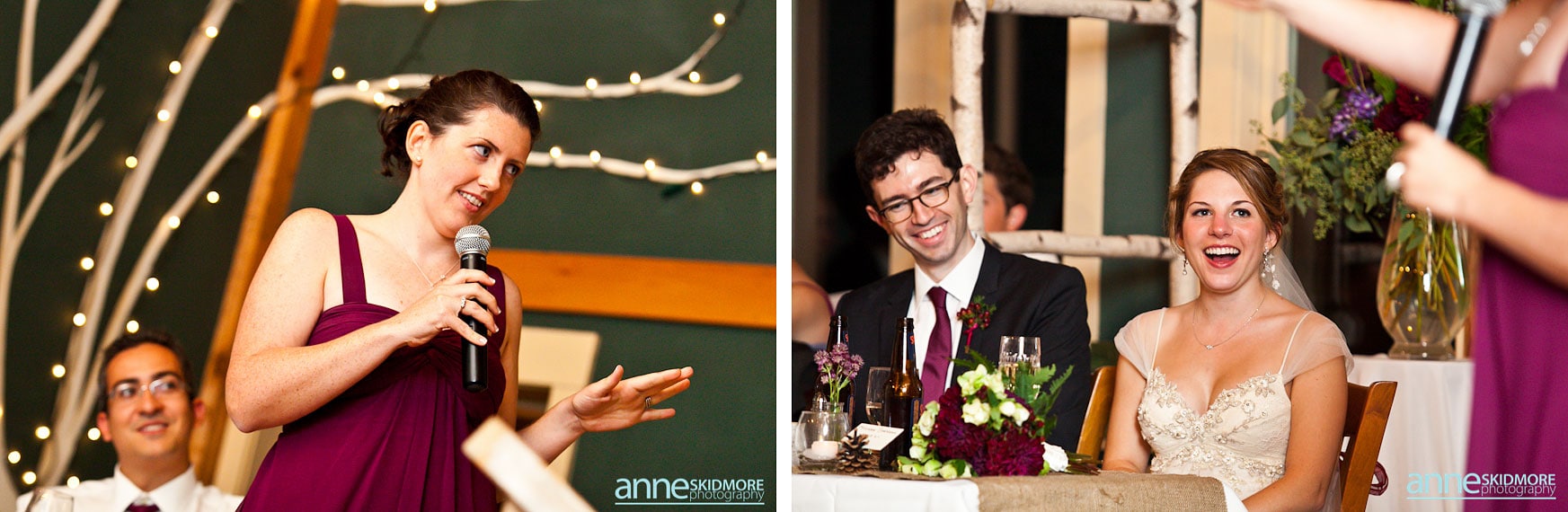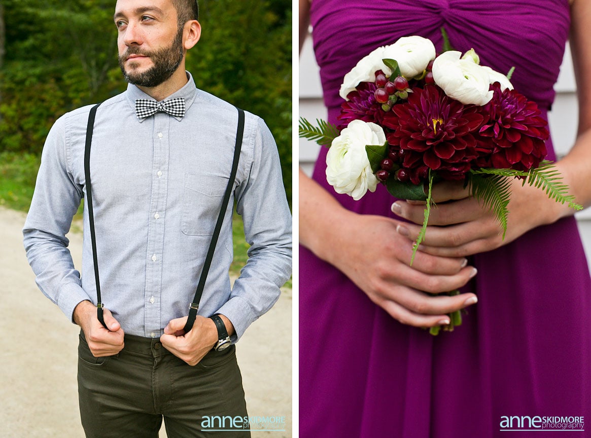 Christian and Meghan wed at the amazing Stone Mountain Arts Center on September 8th, 2012. The skies stayed dry all day, and only shed raindrops when night time fell. The Stone Mountain Arts Center (aka SMAC) is truly a unique place. It is set in the foothills of the White Mountains, and has two gorgeous barns to host the wedding day festivities. In addition there are backdrops galore including dirt roads, an old cape house, and an amazing weathered barn just down the road. Meghan and Christian were just so sweet, and opted to have an intimate first look moment before their ceremony. We drove to the barn just down the road for a few portraits, and then I found a logging road that seemed to compliment Meghan’s beautiful wedding dress perfectly. Guests arrived on school buses to the SMAC, and as friends and family entered the main barn there was a slideshow playing that instantly brought laughter and tears of joy. When everyone was seated Meghan walked down the aisle, and Christian met her halfway to accompany her down the remaining length. They had a wonderful ceremony, and the skies were still clear to do bridal and family portraits outside afterwards. They were welcomed back into the Quisana Barn with champagne confetti bottles exploding everywhere! So fun! The main barn was transformed into the dinner reception room, with lovely wild flower centerpieces and guests ready to eat the amazing food the Stone Mountain Arts Center is known for. Wonderful toasts were made, and dancing into the night was held back in the Quisana barn. What a day! Thank you Meghan and Christian, I loved capturing your wonderfully awesome and sweet wedding!