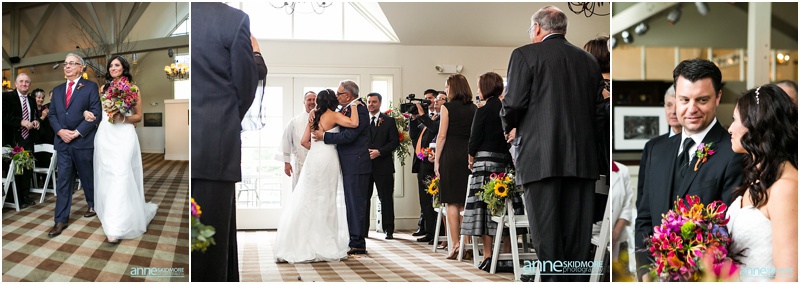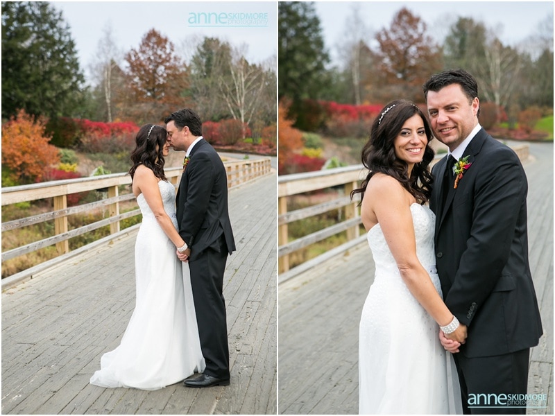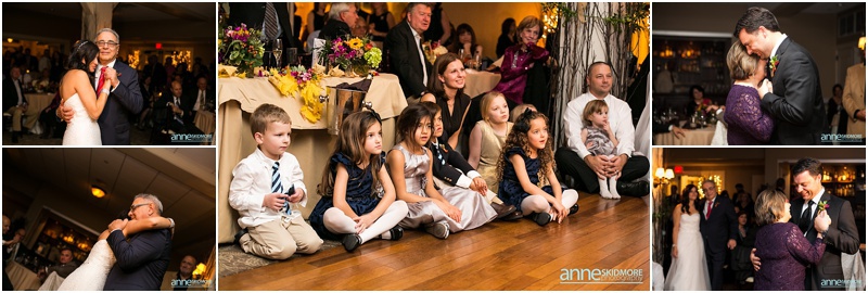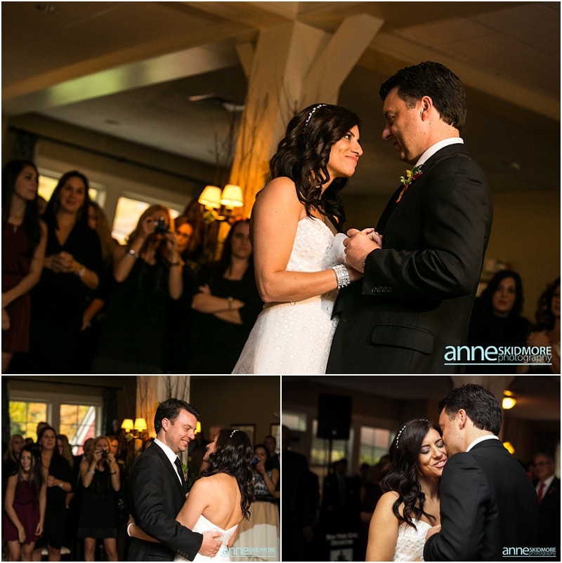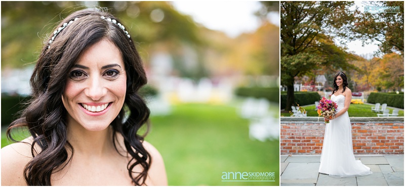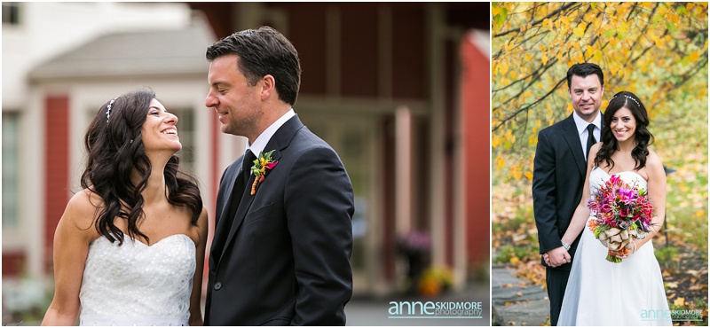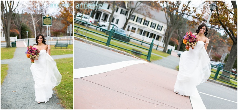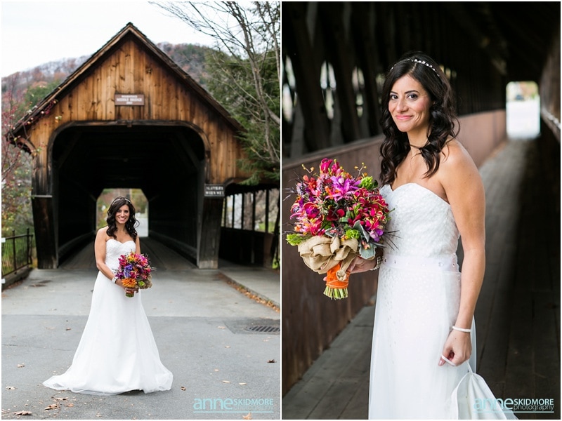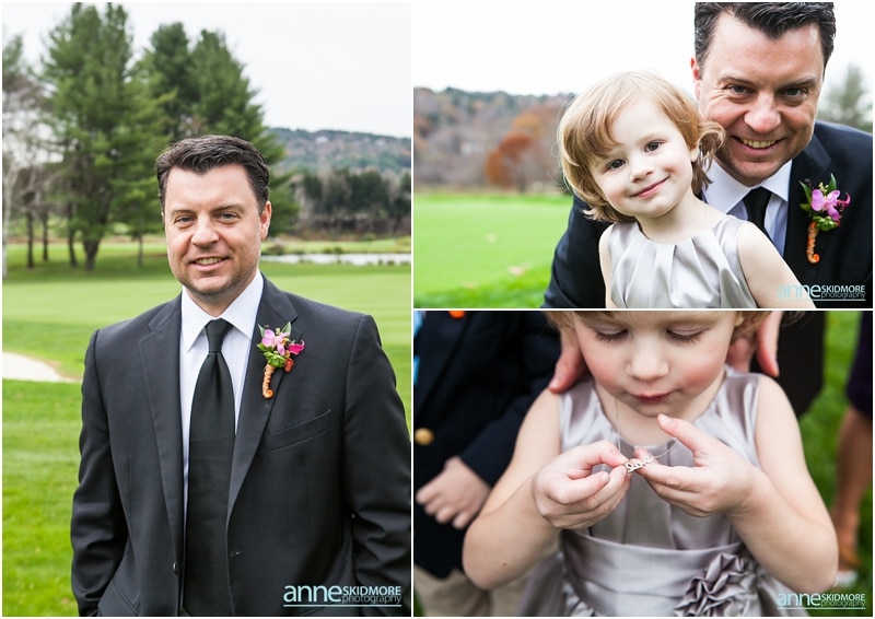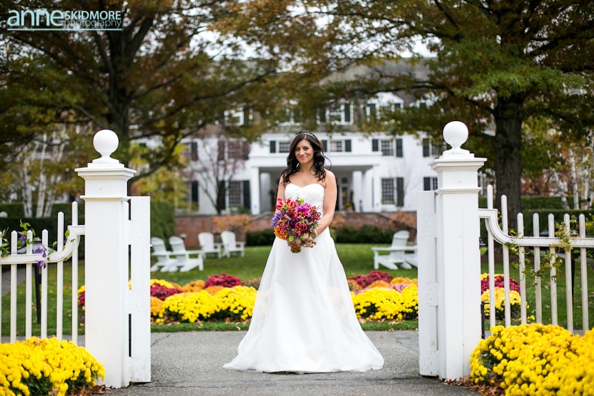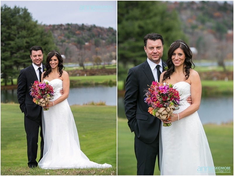 The 26th of October was a proper brisk fall day on Jeff & Kim’s wedding at the Quechee Club in Vermont. However, the day started at the Woodstock Inn, just a few miles down the road, where Kim got ready for her big day. This entire area of Vermont is just lovely. It is filled with so much character, charm and history! We took a few family photos at the Woodstock Inn and bopped around for a few special portraits of Kim in quaint Woodstock, Vermont. Jeff was back at the Quechee Club getting suited up for his big day. Soon Kim stepped into her limo and we were off to the Quechee Club for the ceremony. The ceremony room was filled with one hundred and eighty friends and family. They had a lovely ceremony with Kim’s nieces were her bridemaids, special family readings, and sealed it will a kiss! Family portraits were taken out on the porch of the Club, and then Kim and Jeff were ready to brave the cool temperatures for their intimate portraits. The Quechee Club is quite beautiful with the rolling Green Mountains in the background, and ponds and bridges and more surrounding you. After their portraits they were ready to warm up and join all their guests inside the club house. The evening was simply fantastic from there on out. Beautiful toasts, first dances, a special song sung by Kim’s dear friend Pam, and non stop fun and music by the band New York Edge Music. Thank you so much Kim & Jeff, it was such a beautiful way to say goodbye to October!