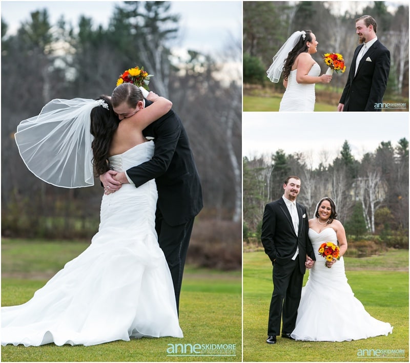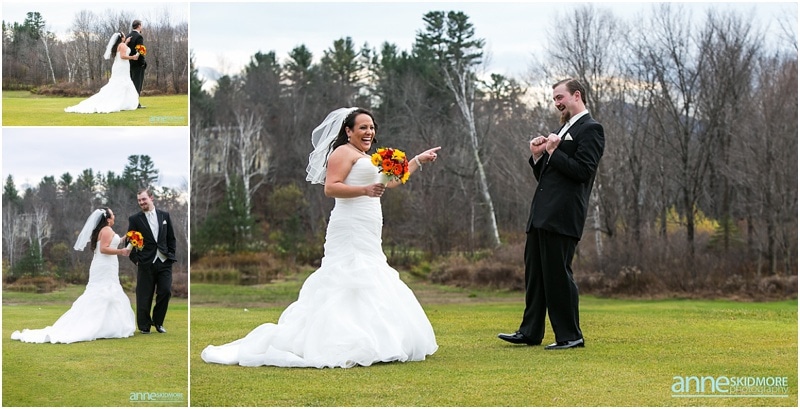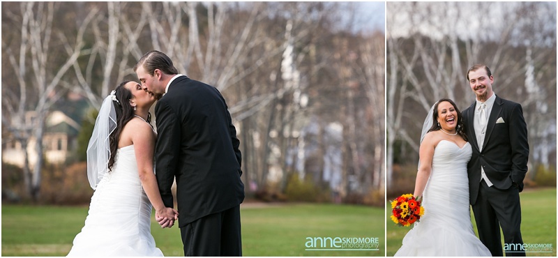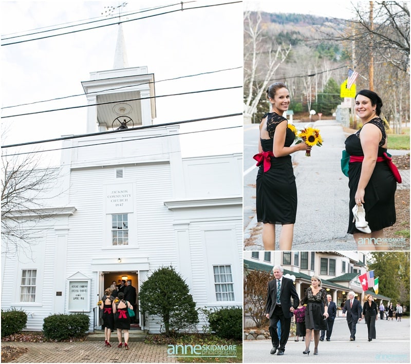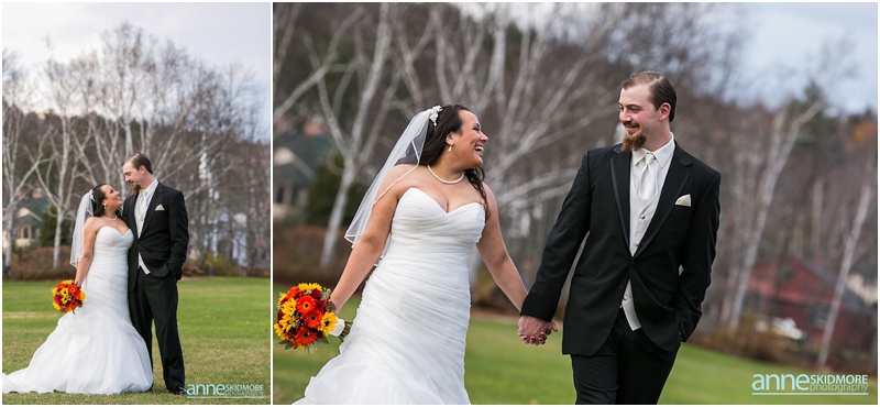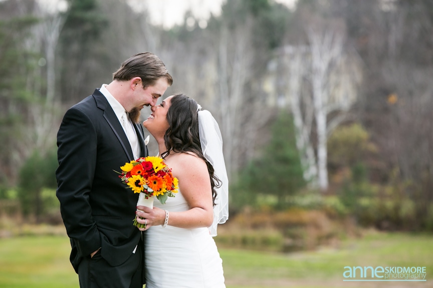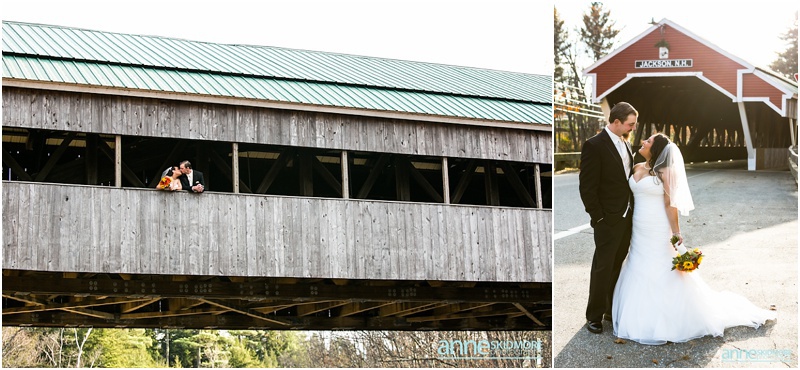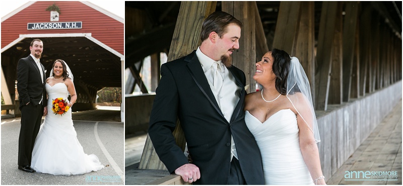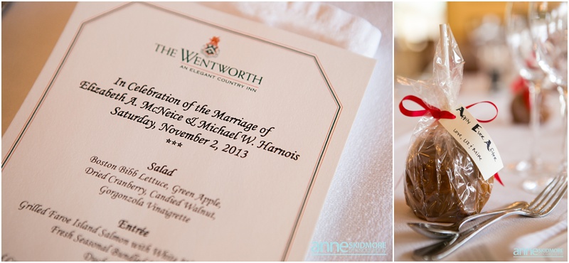 On November 2nd, 2013, Mike and Liz celebrated their wedding day in Jackson, New Hampshire at the Wentworth Inn. The temperatures were perfect for taking all their portraits outside. For early November it was unseasonably warm! So fun and lucky too! My gosh, we could have had snow on the ground. They both took time to dress for the day in the Amster Suite. Mike headed outside first and waited for his bride to tap him on the shoulder for their totally cute first look moment. Liz walked across the Wentworth green to her future husband, and gently tapped him on the shoulder. His reaction was so great and full of life! And it was right then I learned that Liz’s smile is completely contagious! It is so grand, sweet, and you just can’t help but smile yourself. By the end of the day my cheeks hurt from smiling as well! We bopped all around Jackson for their portraits. Mike and Liz were psyched to go just about anywhere and we were able to capture so many beautiful shots. Their ceremony was in the Little White Church in Jackson with Reverend Lee performing their ceremony. Reverend Lee’s services are always so full of life and passion. He is one of the best out there and a special man indeed. Their ceremony had very sweet and touching moments with Reverend Lee always making sure that everyone smiles and laughs a few times. Liz and Mike sealed it with a kiss, and we took a few dusk portraits before heading over to celebrate inside the beautiful Wentworth Inn. The whole bridal party was announced down into the main hall, and was followed by first dances, and naturally wonderful toasts were given by the bridal party and Liz’s father. A delicious meal followed, and then is was time to dance! There was fabulous music and lighting provided by Get Down Tonight and everyone danced their tail feathers off! Thank you Mike & Liz! We loved capturing your beautiful wedding! Take a peek below!