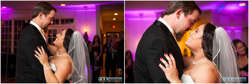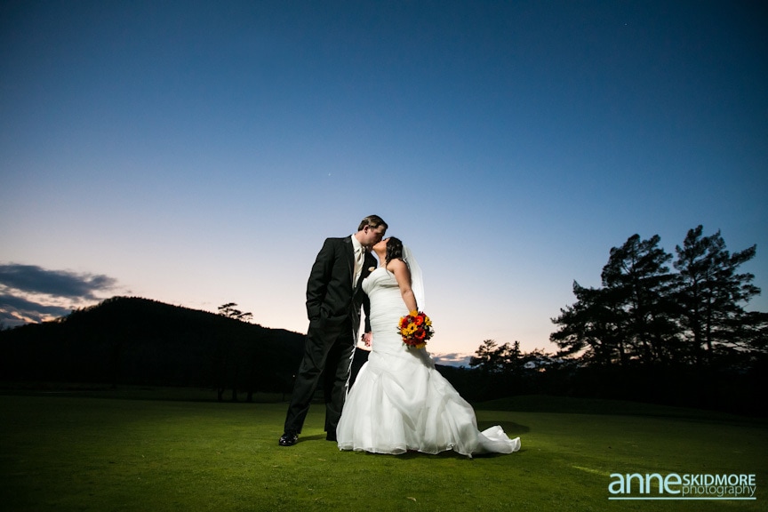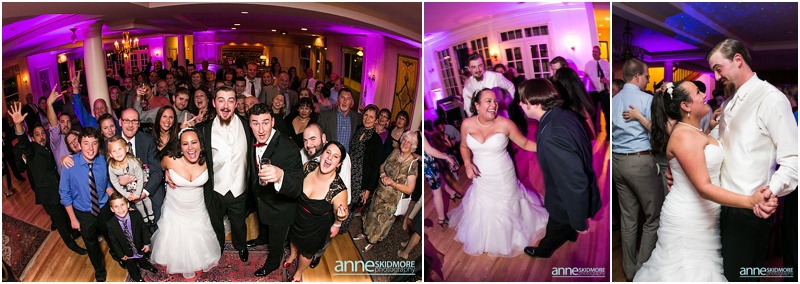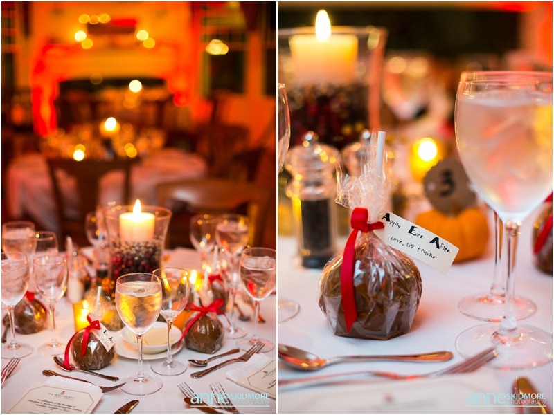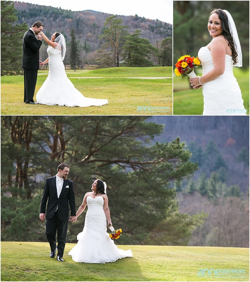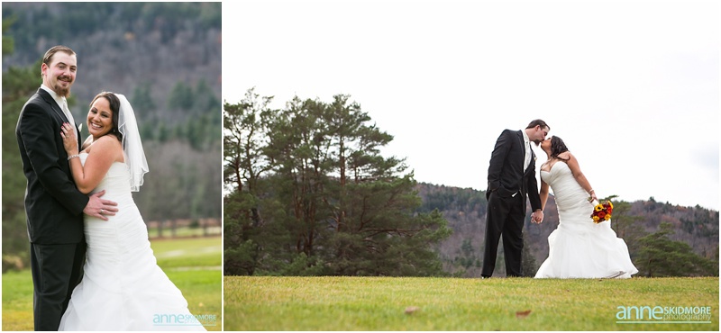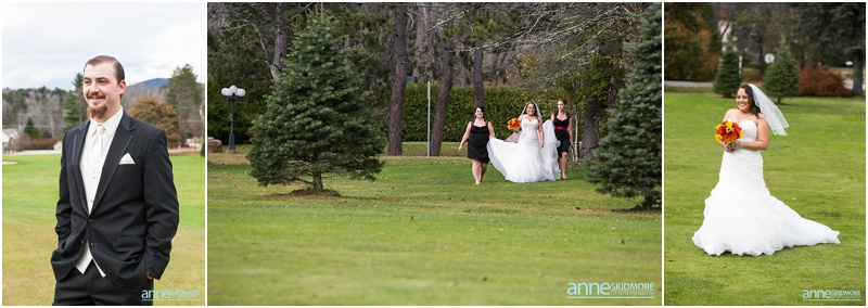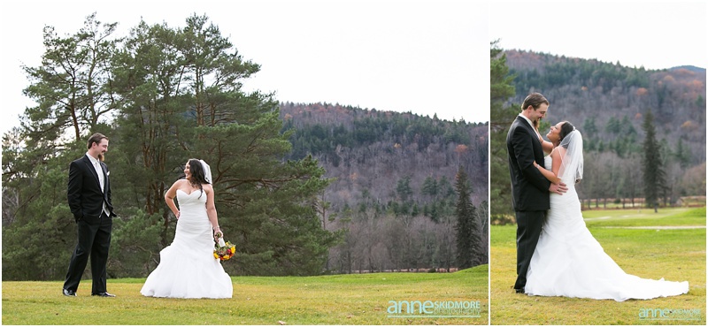 On November 2nd, 2013, Mike and Liz celebrated their wedding day in Jackson, New Hampshire at the Wentworth Inn. The temperatures were perfect for taking all their portraits outside. For early November it was unseasonably warm! So fun and lucky too! My gosh, we could have had snow on the ground. They both took time to dress for the day in the Amster Suite. Mike headed outside first and waited for his bride to tap him on the shoulder for their totally cute first look moment. Liz walked across the Wentworth green to her future husband, and gently tapped him on the shoulder. His reaction was so great and full of life! And it was right then I learned that Liz’s smile is completely contagious! It is so grand, sweet, and you just can’t help but smile yourself. By the end of the day my cheeks hurt from smiling as well! We bopped all around Jackson for their portraits. Mike and Liz were psyched to go just about anywhere and we were able to capture so many beautiful shots. Their ceremony was in the Little White Church in Jackson with Reverend Lee performing their ceremony. Reverend Lee’s services are always so full of life and passion. He is one of the best out there and a special man indeed. Their ceremony had very sweet and touching moments with Reverend Lee always making sure that everyone smiles and laughs a few times. Liz and Mike sealed it with a kiss, and we took a few dusk portraits before heading over to celebrate inside the beautiful Wentworth Inn. The whole bridal party was announced down into the main hall, and was followed by first dances, and naturally wonderful toasts were given by the bridal party and Liz’s father. A delicious meal followed, and then is was time to dance! There was fabulous music and lighting provided by Get Down Tonight and everyone danced their tail feathers off! Thank you Mike & Liz! We loved capturing your beautiful wedding! Take a peek below!