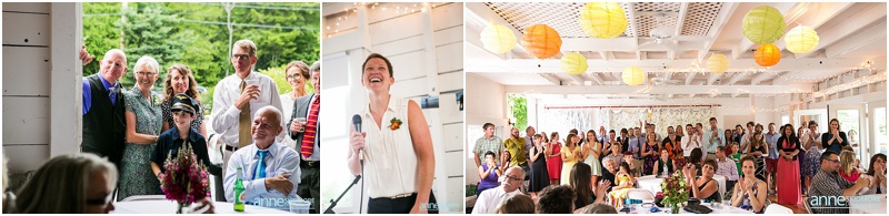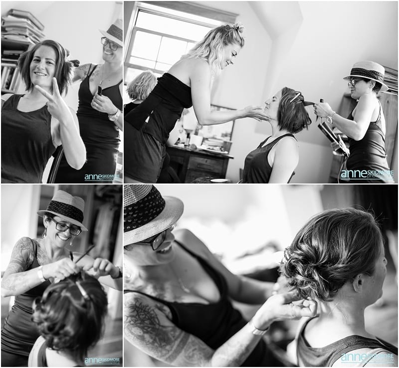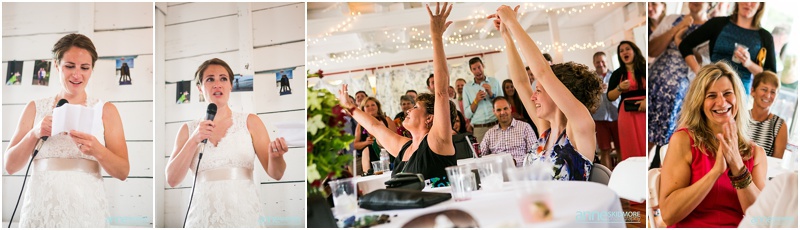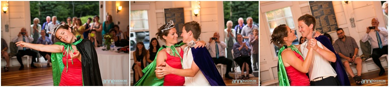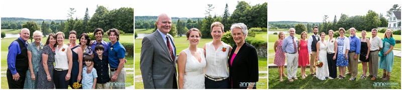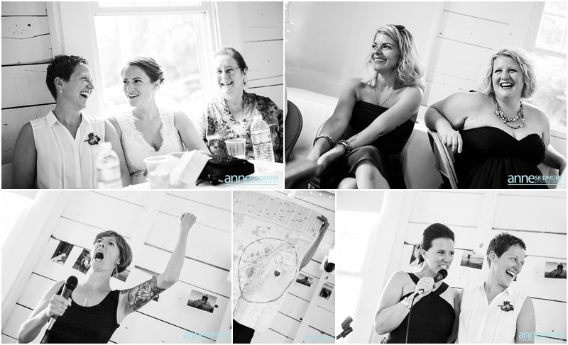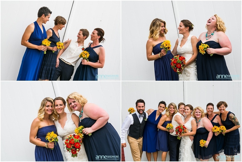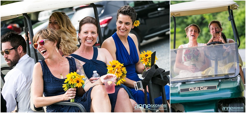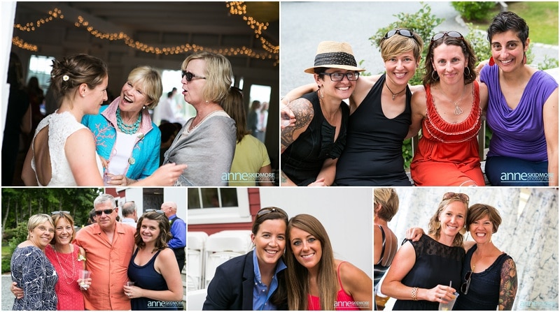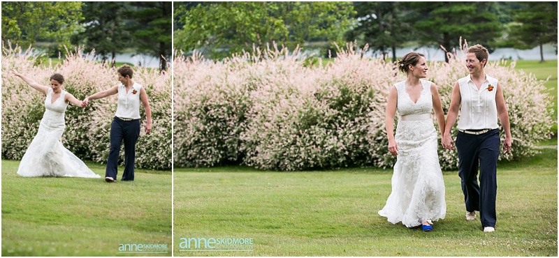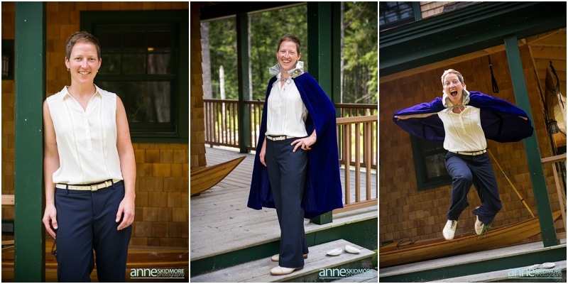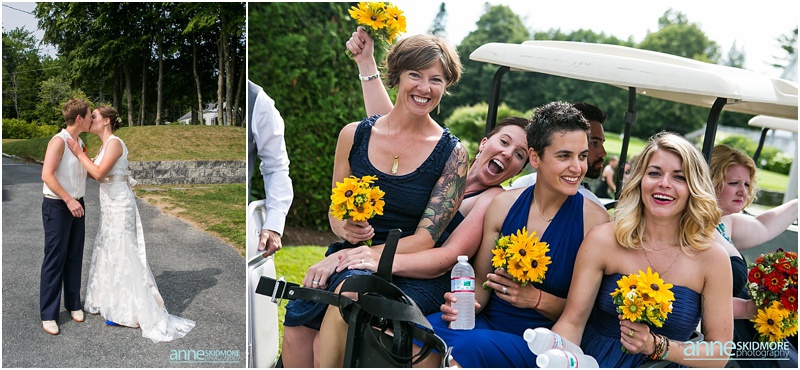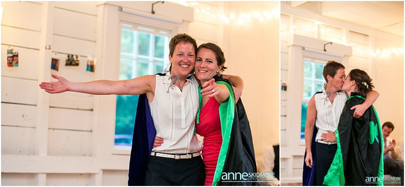 These two wonderful ladies chose to have their beautiful wedding day at the Causeway Club in Southwest Harbor in Acadia, Maine. The Causeway Club is a golf club near the water and they have an awesome barn perfectly lit for weddings. But before things were underway at the club, Emily and Heidi stayed at a friends house not far away to get ready. There was so much thought and connection put into the wedding.  Friends were helping them get ready- doing their hair and makeup, flowers, decorating the barn, catering the food and they actually found me through mutual friends!  Oh, and do you see capes?  Heidi’s amazing and talented mother makes those, and have become a “thing”, so hilarious!  But once these two ladies were all gussied up, they had a very short and sweet first look moment at their friends home. Then it was time to get married! They whisked off to the Causeway Club and, below the barn, is where everyone gathered for their nuptials. Their Justice of the Peace was a dear companion, and they had a very touching and beautiful wedding ceremony. The love between the two of them was felt by everyone, and everyone’s love for them was felt as well! They sealed it with a kiss, and then it was portrait time! We took some portraits right around the barn, and then we zoomed down the hill to the water via golf carts. The lighting couldn’t have been more perfect, and their whole bridal party was such a hoot! After their beautiful portraits were done it was time to celebrate with friends, family, yummy food, and great acoustic tunes. After several touching toasts were given it was time to dance, and did this crew dance! In between the beats we even found time to sneak down to the water right at sunset. We made it a quick portrait session as the mosquitos were attacking us down by the water and I was yelling “SLAP” (to slap mosquitos) in between photos! And despite all the bites, Emily and Heidi were laughing through it all. Wow, what a totally awesome day and I’m so excited for you two! It was a total pleasure, and hope you have fun reliving the day looking through these photos!