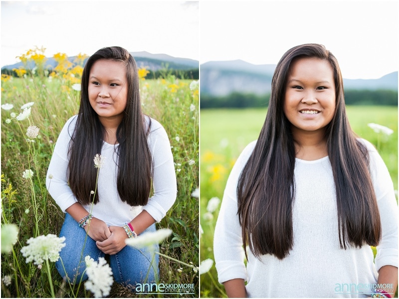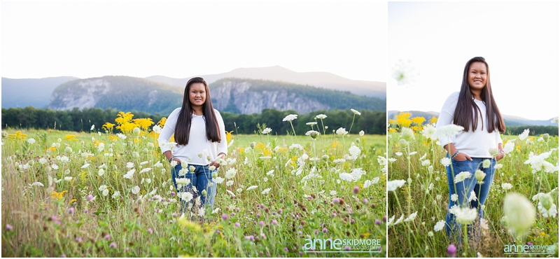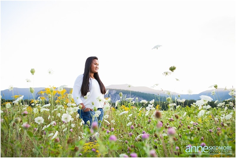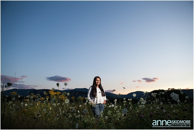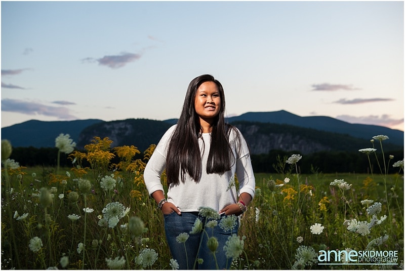 Mia and I met in one of my favorite locations for her senior portrait session last Friday evening. In the last hours of daylight, the lighting is really beautiful to work with as it sets over the Moat Mountain Range. We were able to capture so many different looks in only an hours time. Kym, Mia’s mom, stayed nearby and enjoyed the scenery while picking wildflowers. Kym was even kind enough to be my assistant and hold the light stand so we could capture some fun shots at the end of the evening. Mia, you are beautiful! Enjoy the last year of high school- it goes by so quickly.