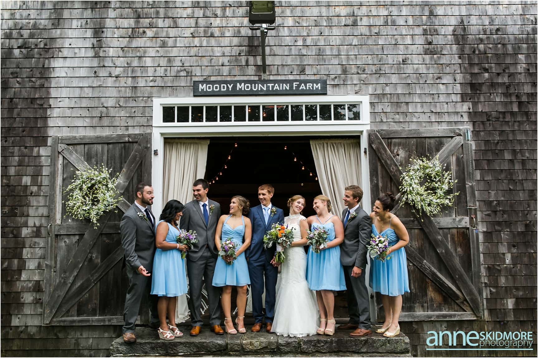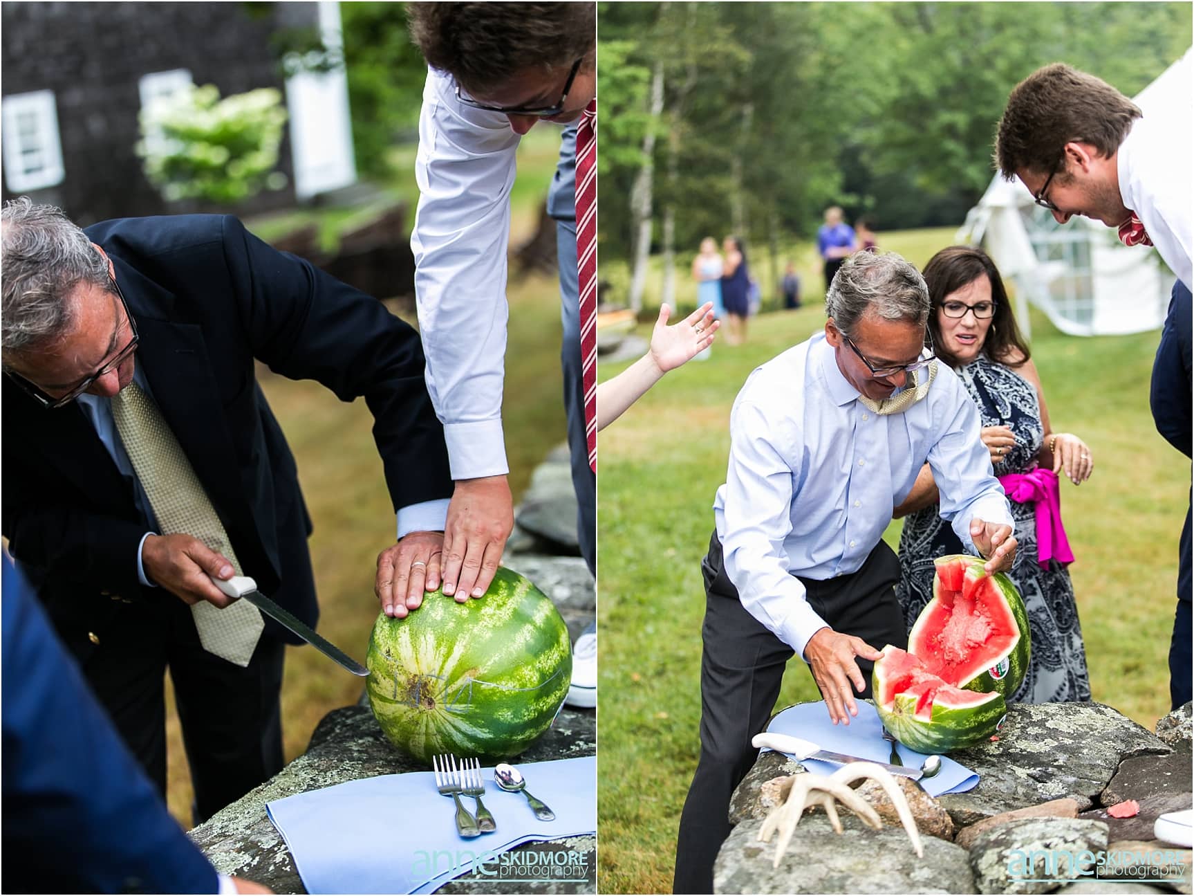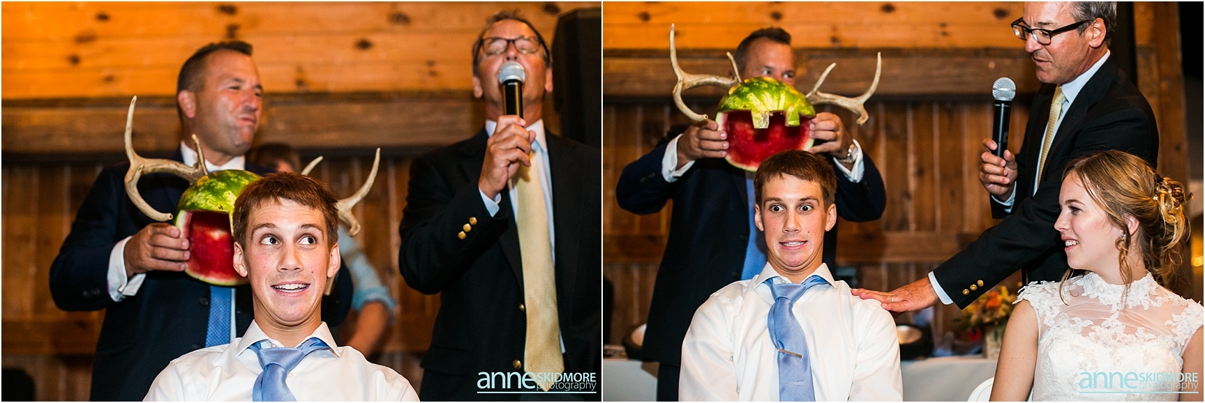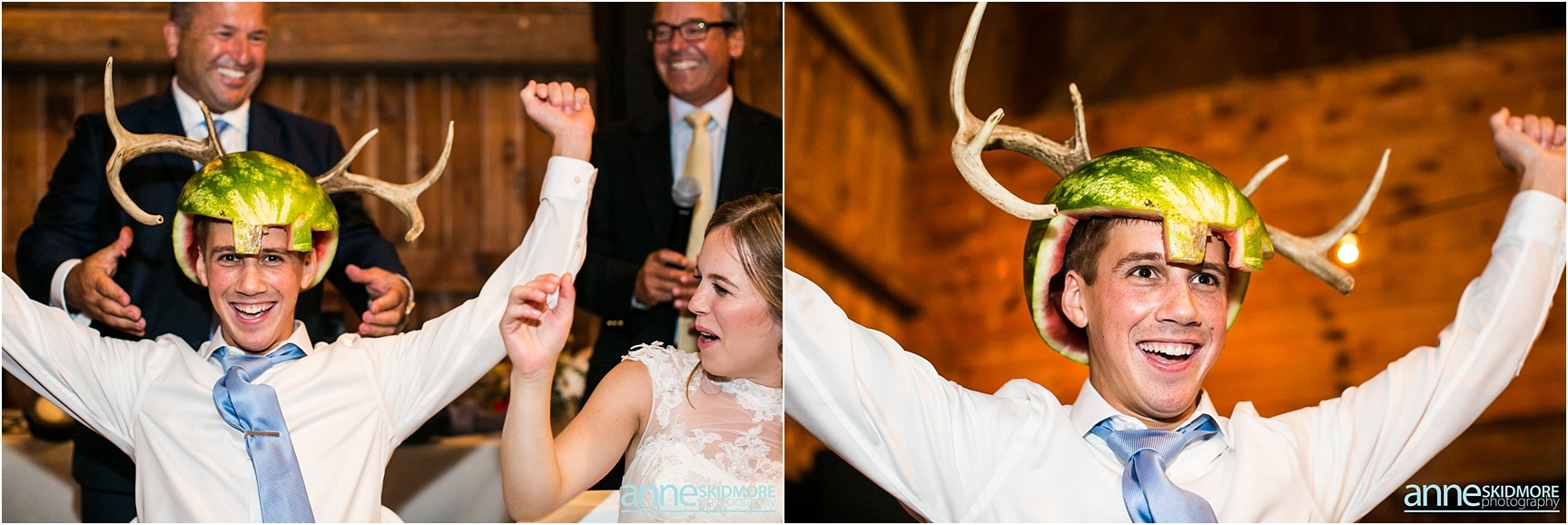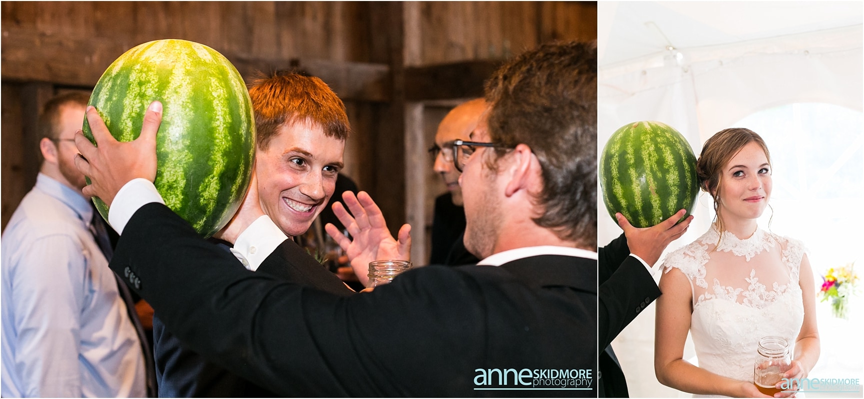 The Barn at Moody Mountain Farm is definitely a highlight of our summer when we get to photograph at this lovely venue.  We love it here!  Tucked into the fields of historic Wolfeboro, we can feel the history that lives with this place and it mixes a rustic barn (classic New Hampshire) wedding atmosphere with so much elegance.  We know Nick and Katrina because, not only are they locals to the Mount Washington Valley, but they are wonderful friends of ours and bring so much character and enthusiasm to our climbing community.  I’ve been chatting with Katrina all summer long at our evening cookouts getting the latest news on the details surrounding the wedding day.  I’ve been excited about this day since they booked last year!  Nick, being the goofy character of the two, brought so much fun and laughter to the day while Katrina was absolutely stunning and helped quite Nick up a bit with her looks.  The humor these two share is on another level.  They are one of those couples that are PERFECT for each other.  We lucked out with the rain holding off until the later evening hours and the misty foggy weather created a very cozy atmosphere.  The ceremony was moved into the barn and their friends and families casually lined the perimeter and cheered as they became husband and wife.  While guests enjoyed the cocktail hour on the back side of the barn, we were able to capture a ton of fun portraits of not only Nick and Katrina, but the bridal party and family as well.  Tuckerman Brewery filled many empty mason cups to the brim as well as some signature drinks.  The toasts were underway and dinner soon followed that in the barn.  Guests were free to roam the barn and the property and watch as the traditional watermelon was passed around outside to be perfectly carved into Nick’s crowning of the groom.  As the rain started to fall in the last evening minutes, Nick, Katrina, Austin (my awesome second photographer) and I all ran out into the rain to capture a few final portraits of the couple standing in the giant entrance to the barn.  We try our best to compensate for some fun portraits even if the sunset decides not to show that day.  There was so much dancing and it was so much fun to capture the party!  There is a tradition in Katrina’s family that at every wedding, they crown the groom with a custom watermelon helmet.  I’m so glad I was still around to document this craziness.  Katrina was even crowned with one too!  This was by far the funniest thing I’ve ever photographed at a wedding thus far.  You two are so lucky to have such fun families!  Keep on being you and we can’t wait to see your marriage and family grow!  You two are the best! xo!