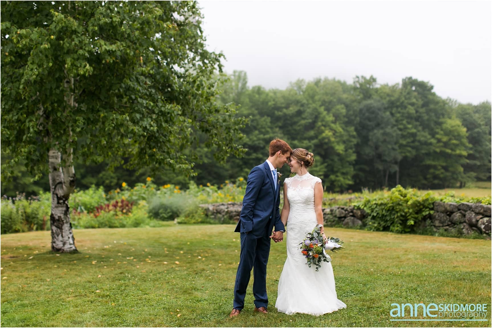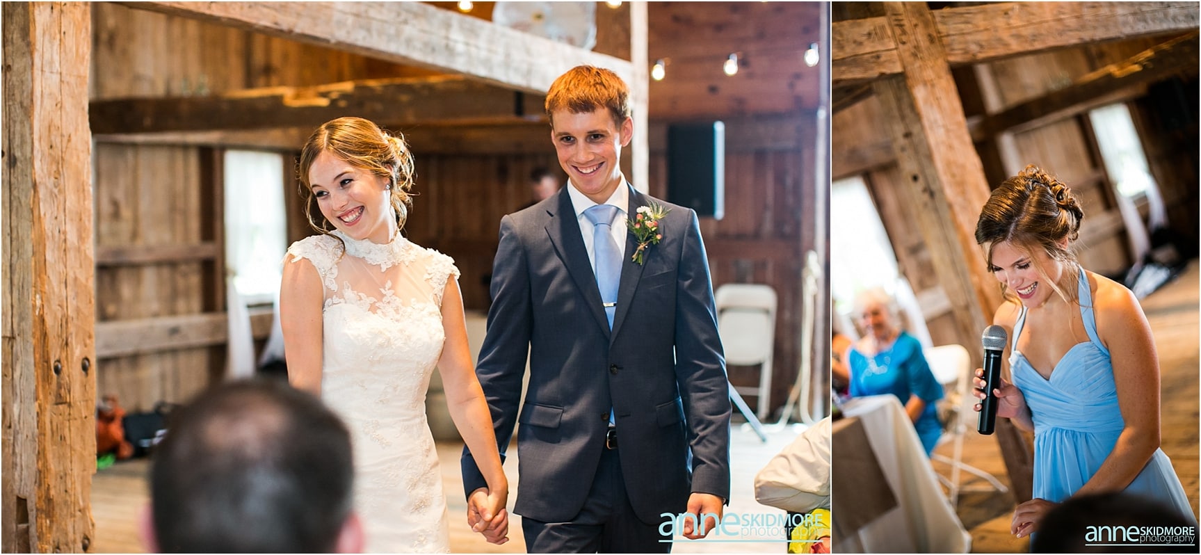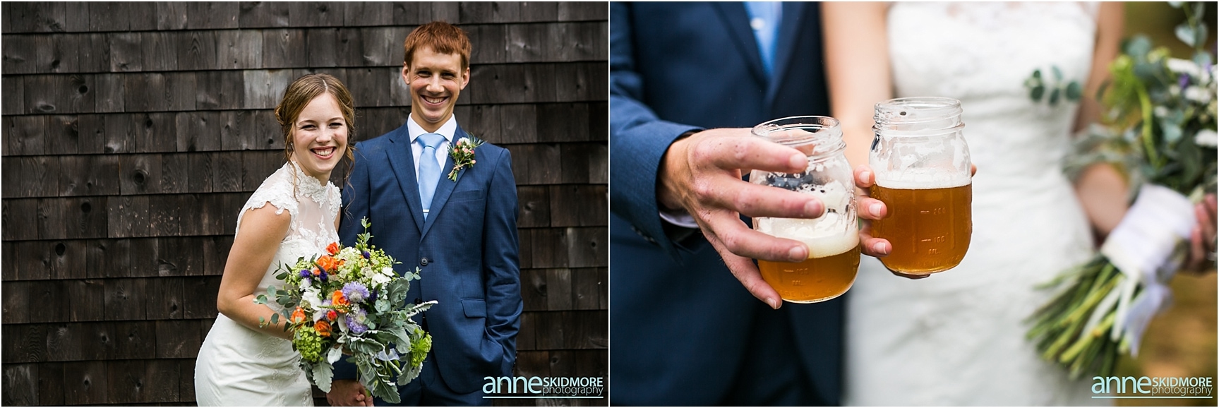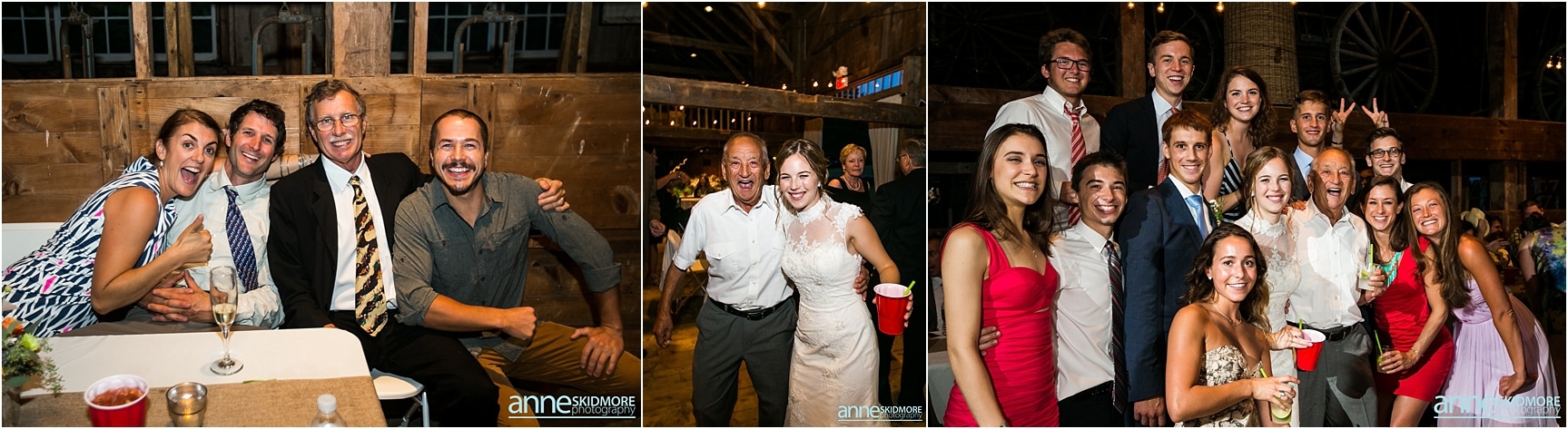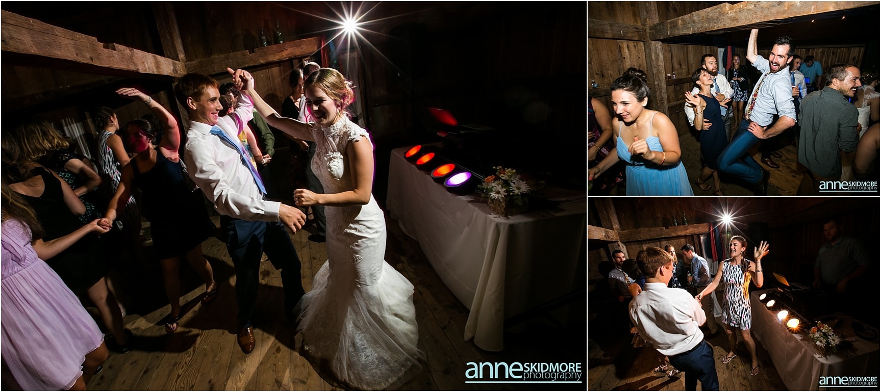 The Barn at Moody Mountain Farm is definitely a highlight of our summer when we get to photograph at this lovely venue.  We love it here!  Tucked into the fields of historic Wolfeboro, we can feel the history that lives with this place and it mixes a rustic barn (classic New Hampshire) wedding atmosphere with so much elegance.  We know Nick and Katrina because, not only are they locals to the Mount Washington Valley, but they are wonderful friends of ours and bring so much character and enthusiasm to our climbing community.  I’ve been chatting with Katrina all summer long at our evening cookouts getting the latest news on the details surrounding the wedding day.  I’ve been excited about this day since they booked last year!  Nick, being the goofy character of the two, brought so much fun and laughter to the day while Katrina was absolutely stunning and helped quite Nick up a bit with her looks.  The humor these two share is on another level.  They are one of those couples that are PERFECT for each other.  We lucked out with the rain holding off until the later evening hours and the misty foggy weather created a very cozy atmosphere.  The ceremony was moved into the barn and their friends and families casually lined the perimeter and cheered as they became husband and wife.  While guests enjoyed the cocktail hour on the back side of the barn, we were able to capture a ton of fun portraits of not only Nick and Katrina, but the bridal party and family as well.  Tuckerman Brewery filled many empty mason cups to the brim as well as some signature drinks.  The toasts were underway and dinner soon followed that in the barn.  Guests were free to roam the barn and the property and watch as the traditional watermelon was passed around outside to be perfectly carved into Nick’s crowning of the groom.  As the rain started to fall in the last evening minutes, Nick, Katrina, Austin (my awesome second photographer) and I all ran out into the rain to capture a few final portraits of the couple standing in the giant entrance to the barn.  We try our best to compensate for some fun portraits even if the sunset decides not to show that day.  There was so much dancing and it was so much fun to capture the party!  There is a tradition in Katrina’s family that at every wedding, they crown the groom with a custom watermelon helmet.  I’m so glad I was still around to document this craziness.  Katrina was even crowned with one too!  This was by far the funniest thing I’ve ever photographed at a wedding thus far.  You two are so lucky to have such fun families!  Keep on being you and we can’t wait to see your marriage and family grow!  You two are the best! xo!