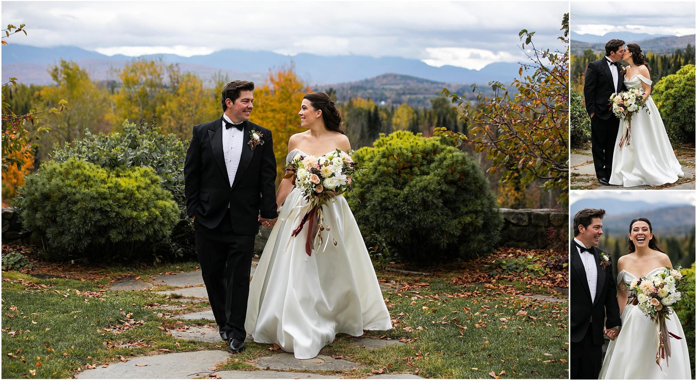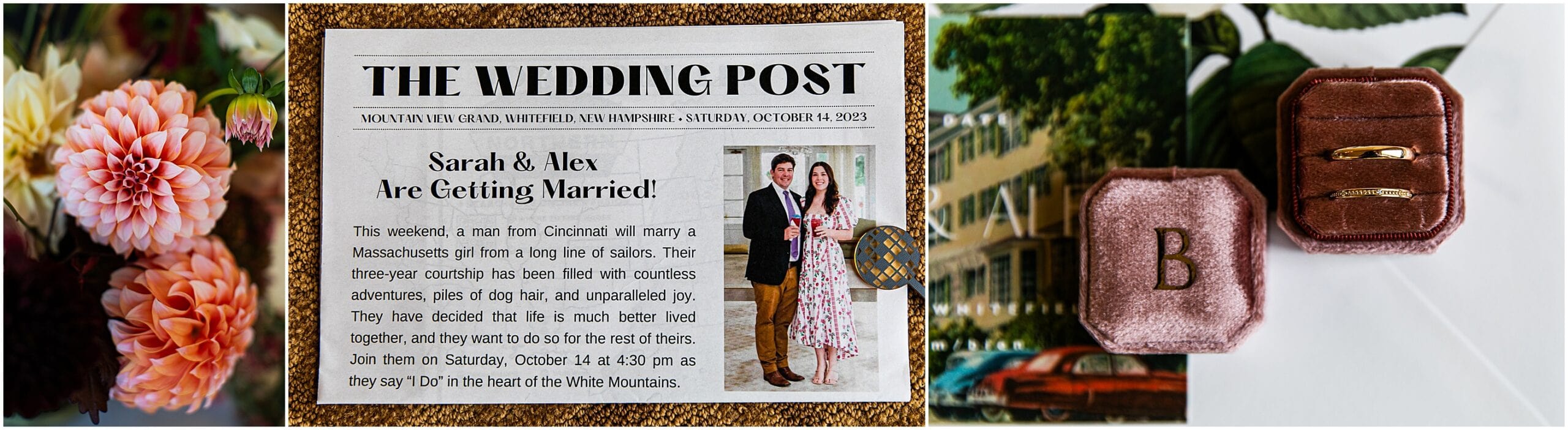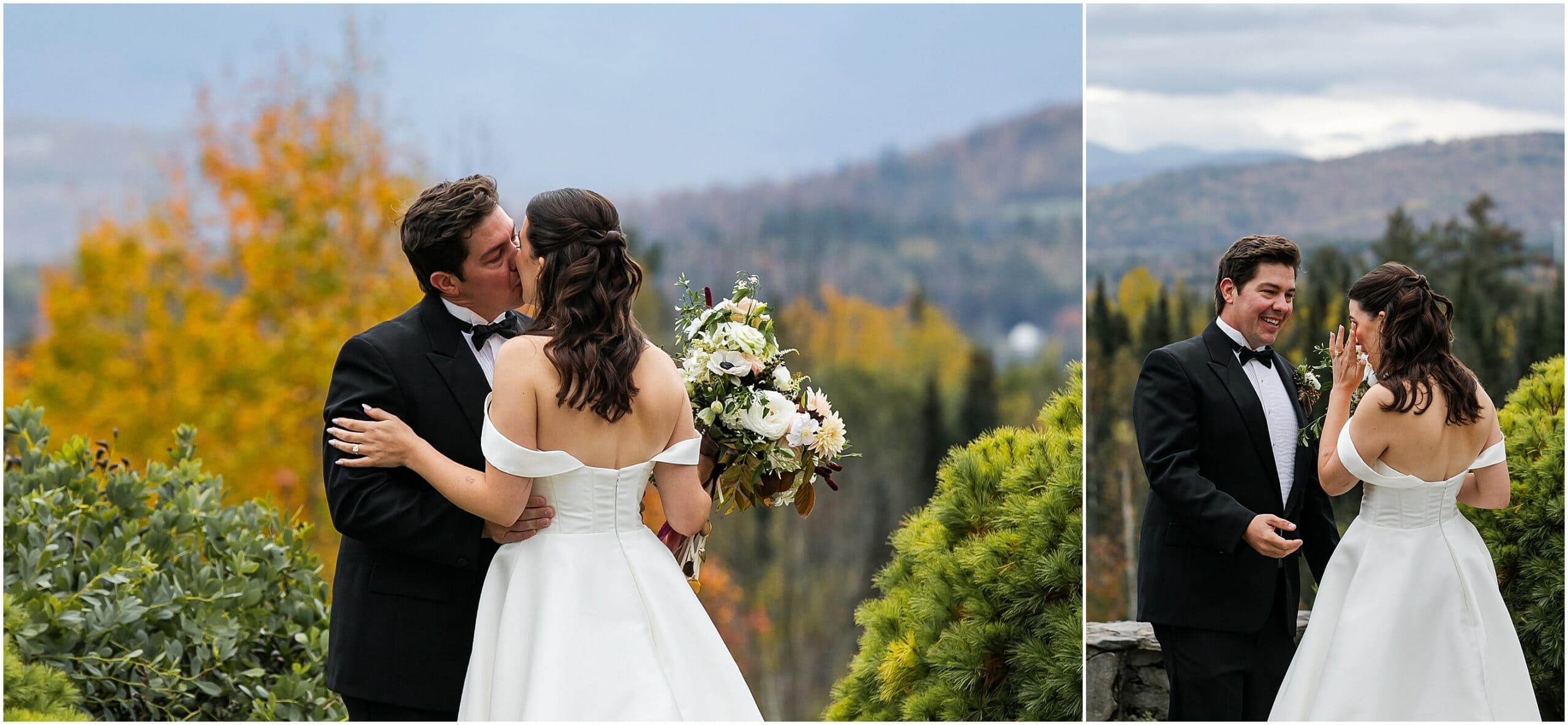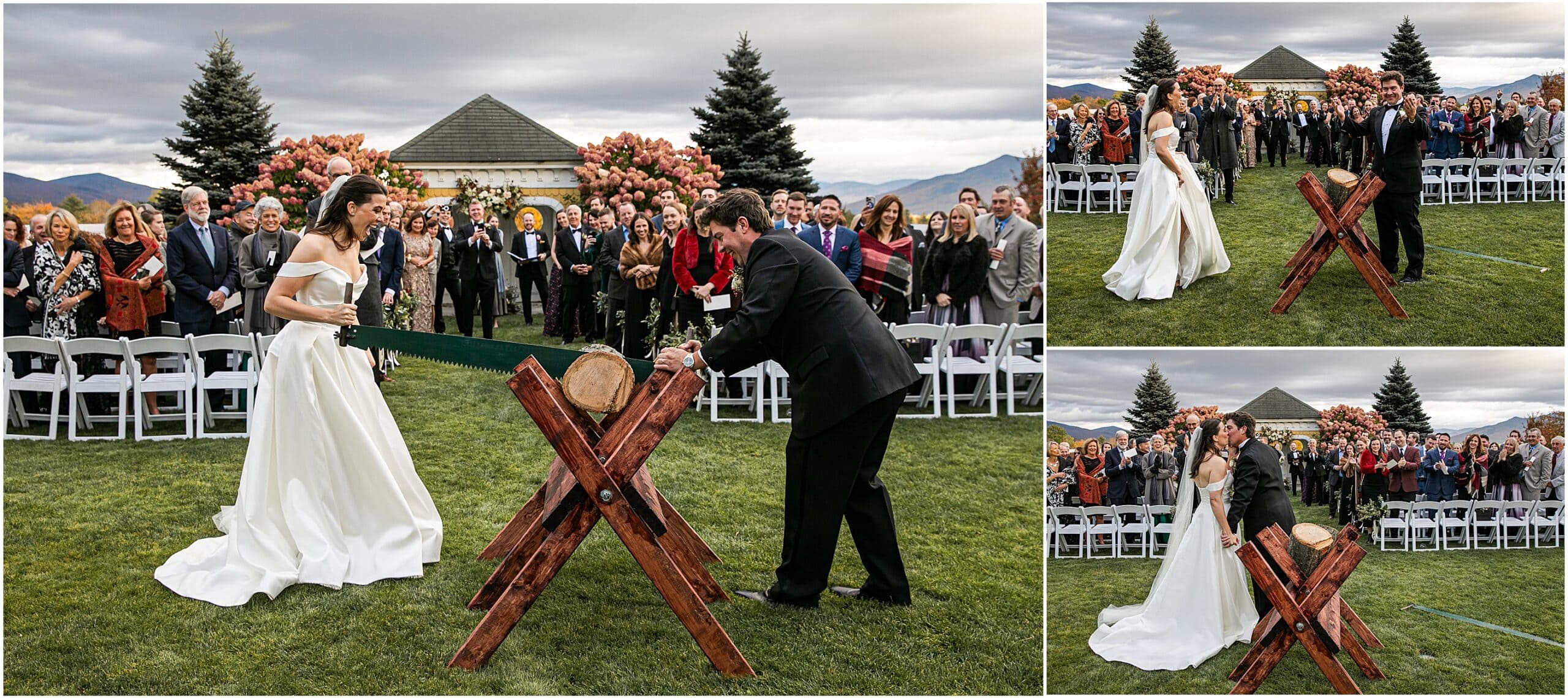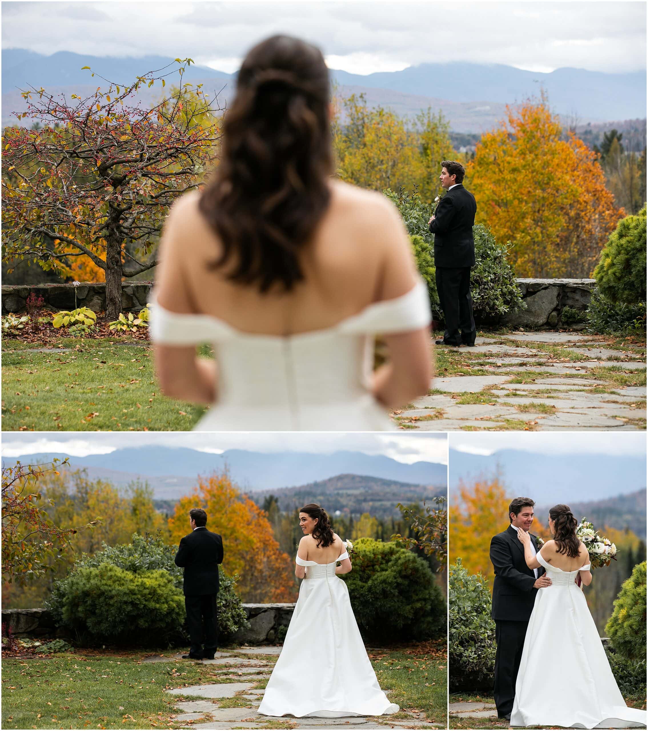We just love the Mountain View Grand so much- especially during foliage season here in New England. With vast views of the White Mountains, on a clear day we can see much of the presidential range as well as Mount Washington. With the most beautiful ballroom, this venue is just top notch. Sarah and Alex expressed how much they wanted their wedding to feel unique to them. They opted to not have a bridal party and invited their immediate families to walk down the aisle instead. They held a German log cutting unity ceremony. Alex even suprised Sarah by having her bouquet draped with antique lockets with pictures of their loved ones. It was really such a special day and I feel so honored to have photographed it! Take a peek below at this beautiful Mountain View Grand Wedding!