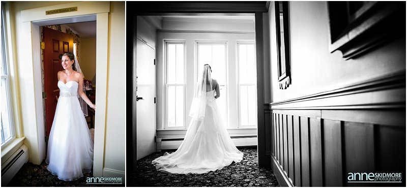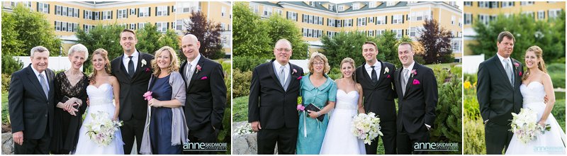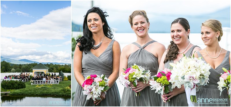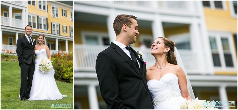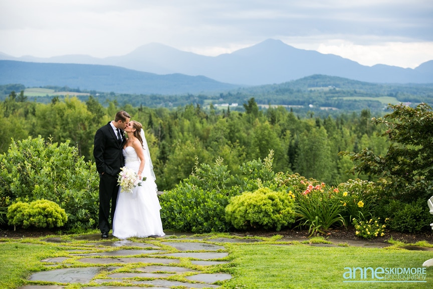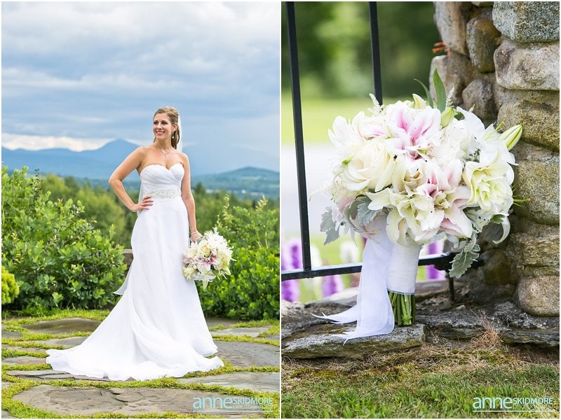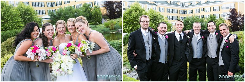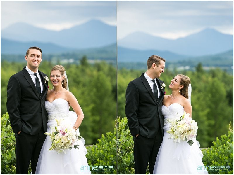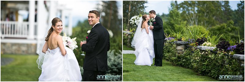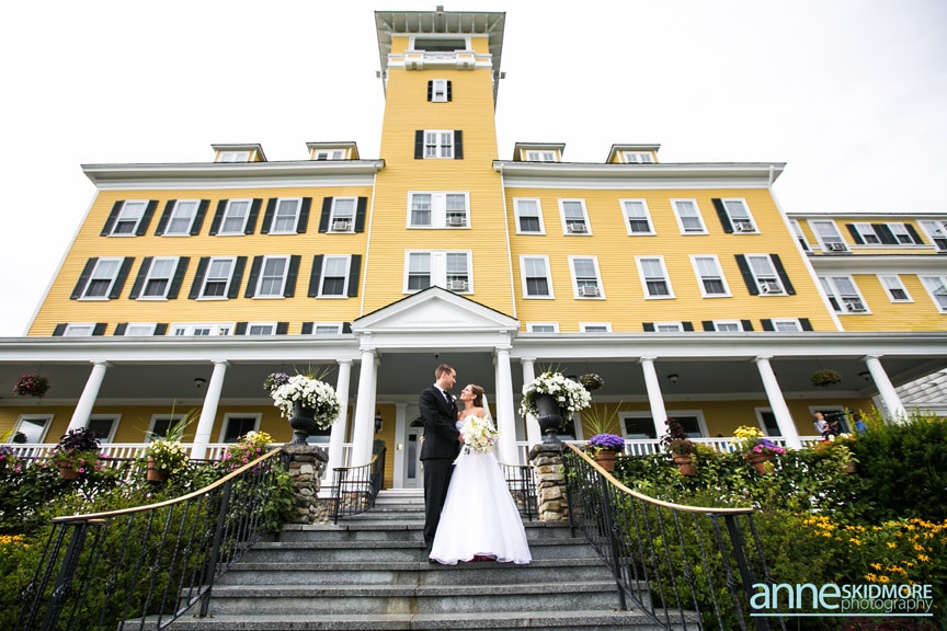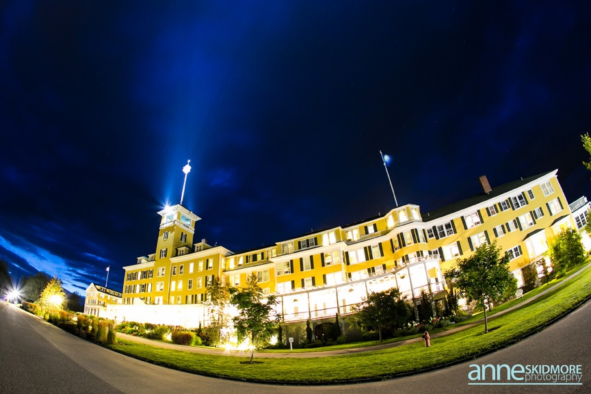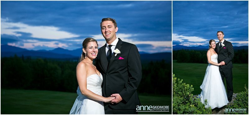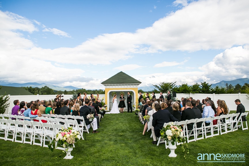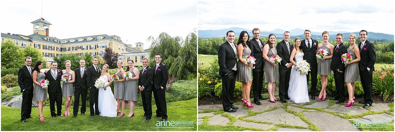 There are a few things I love about the Mountain View Grand Resort & Spa. To begin, the hotel and the grounds are immaculate and simply stunning. Secondly, the view of the White Mountains is breathtaking; it never gets old! Finally, the hotel is intimate, unique and historic without feeling overwhelmingly large in size. Truly a New Hampshire gem! Amy and Jefferson wed there on August 3rd, 2013, and were the classic bride and groom. Jefferson looked dashing in his modern tux, and Amy glowed in her sweetheart neckline wedding gown. The timeless flower arrangements were designed by the talented Emily Herzig. A few small rain showers appeared seconds before their first look moment, so they opted to have the first look on the front porch with a few guests getting a peek! Miraculously, the rain stopped and the dramatic skies and mountains became an incredible backdrop for the two of them. For portraits, we wandered the property for a bit, and a few of them took place in the library room, since Amy has such a huge passion for reading! So fun! Their ceremony was held amongst the blooming gardens where Amy’s father and step father escorted her to Jefferson. They had a unique rose ceremony for their mothers as they gave each a rose to honor them. They sealed their vows with a kiss and we were off to do family and bridal party portraits. It was then time for their formal announcement into the grand Crystal Ballroom! They danced their first dance as husband and wife, and wonderfully hilarious toasts followed. At dusk we slipped outside to take a few final portraits- the sky was just glowing! Bella! The band, Rare Form, kept things rocking all night long. What an incredible day it was! Thank you Amy & Jefferson, it was a pleasure being apart of it!