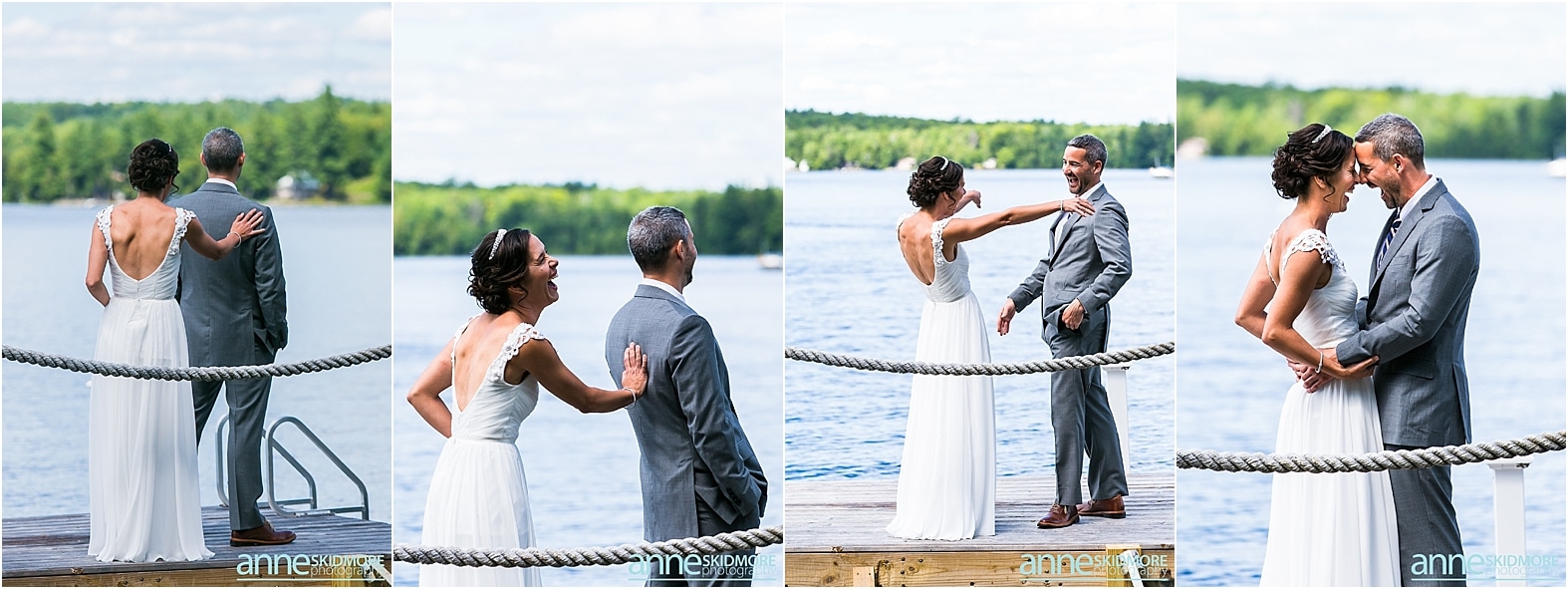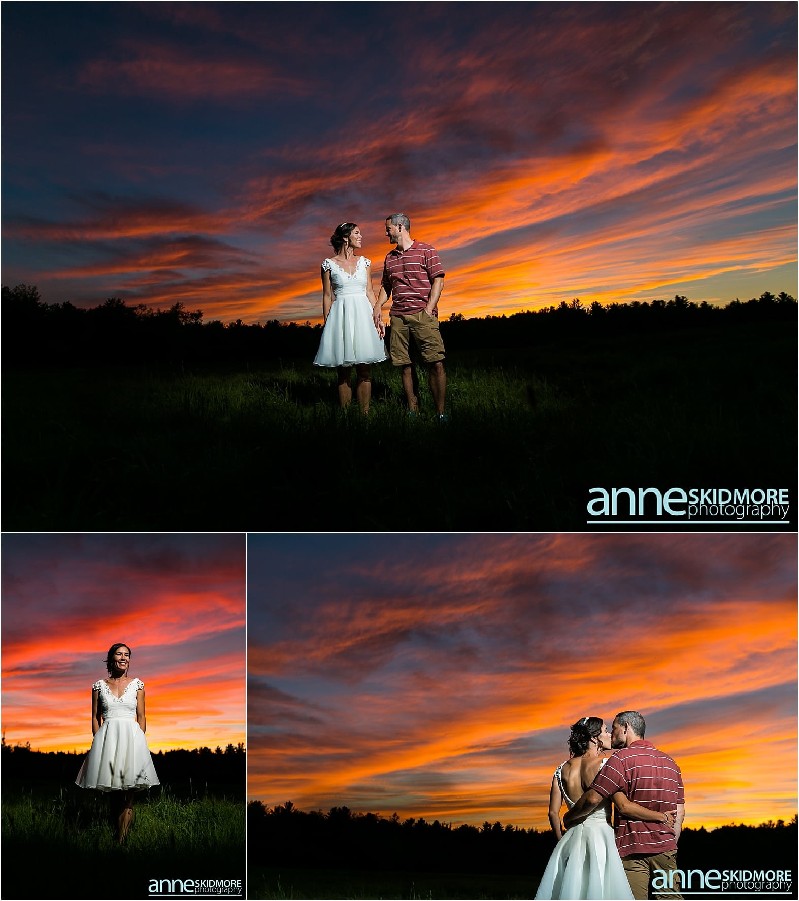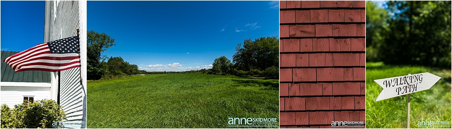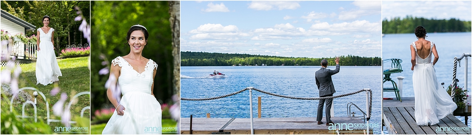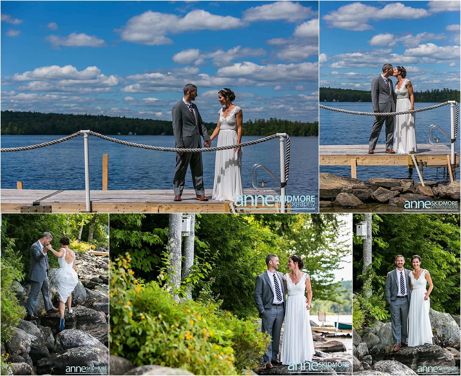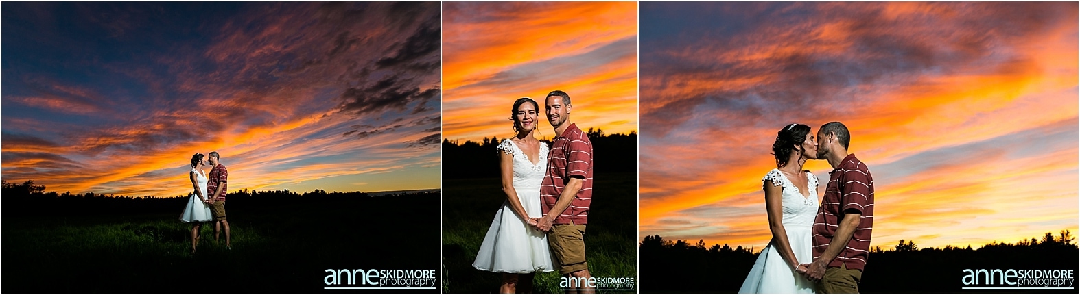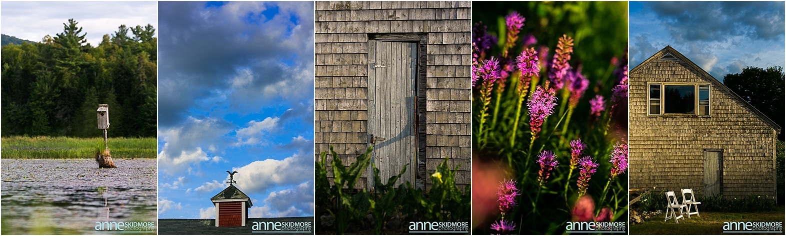 We love this wedding! It was a true family farm barn wedding in Maine! Jamie’s grandmother has an absolutely charming farm in New Vineyard, Maine and this was the perfect and very personal place for Kimberly and Jamie to have their special day. In addition to the beautiful farm, Jamie’s folks live in a stunning lake house just down the road. Jamie got ready at his parents lake house while Kimberly and her ladies got ready at a rented lake house just a little further down. We loved Kimberly’s stunning Michal Motil dress, which was a two piece top and skirt! The best part? She started in an elegant long skirt to start the day, and then later changed into an adorable short skirt for dinner and dancing! These two opted for a first look moment so they could spend lots of time with friends and family after their ceremony. Jamie waited for Kimberly on the dock of his parents lake house, and their reaction to seeing each other for the first time is one of the most expressive and amazing we’ve ever captured! After their first look we took portraits at the lake house and also back at the family farm! I mean we had the best of both worlds! Before we knew it, it was time for these two love birds to get married. They wed across the street from the family farm, right by the family pond. Yes, they even had a family pond, so adorable! After the ceremony everyone walked back to the farm for cocktail hour in the barn. Dinner was under the tent with warm, sweet and funny toasts filling the air. After dinner we scooted to the fields to take portraits under the most incredible sunset we’ve seen all year! It was on FIRE! When we returned everyone was back in the barn dancing the night away. What a totally awesome day! Congrats Jamie & Kimberly, we loved capturing your beautifully rustic chic Maine family farm and barn wedding!