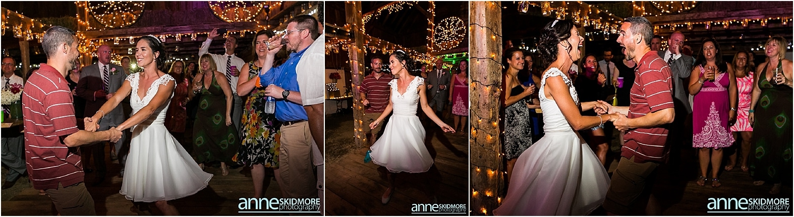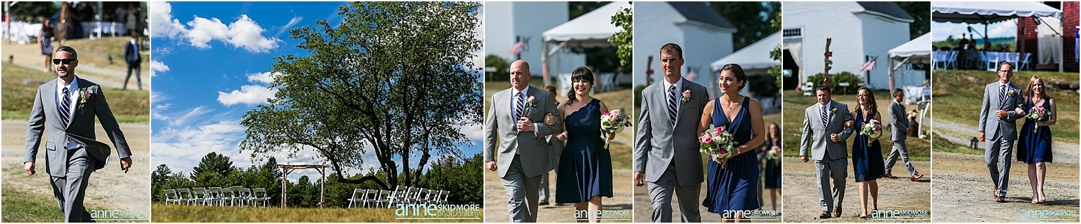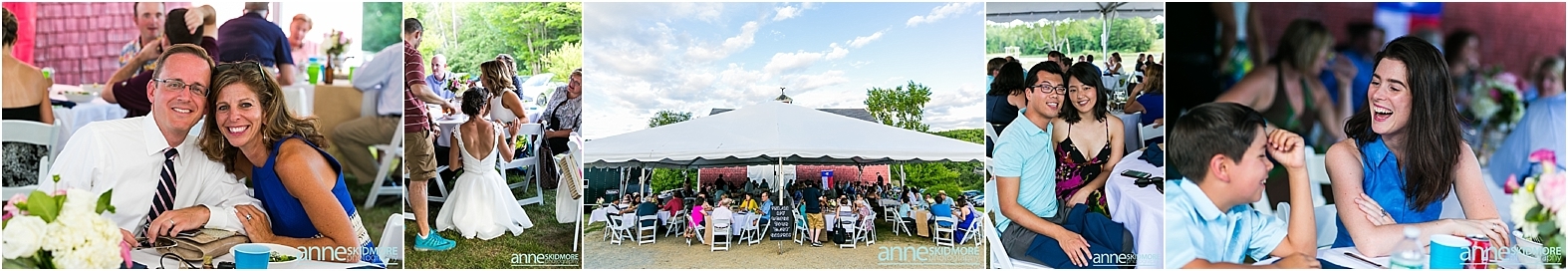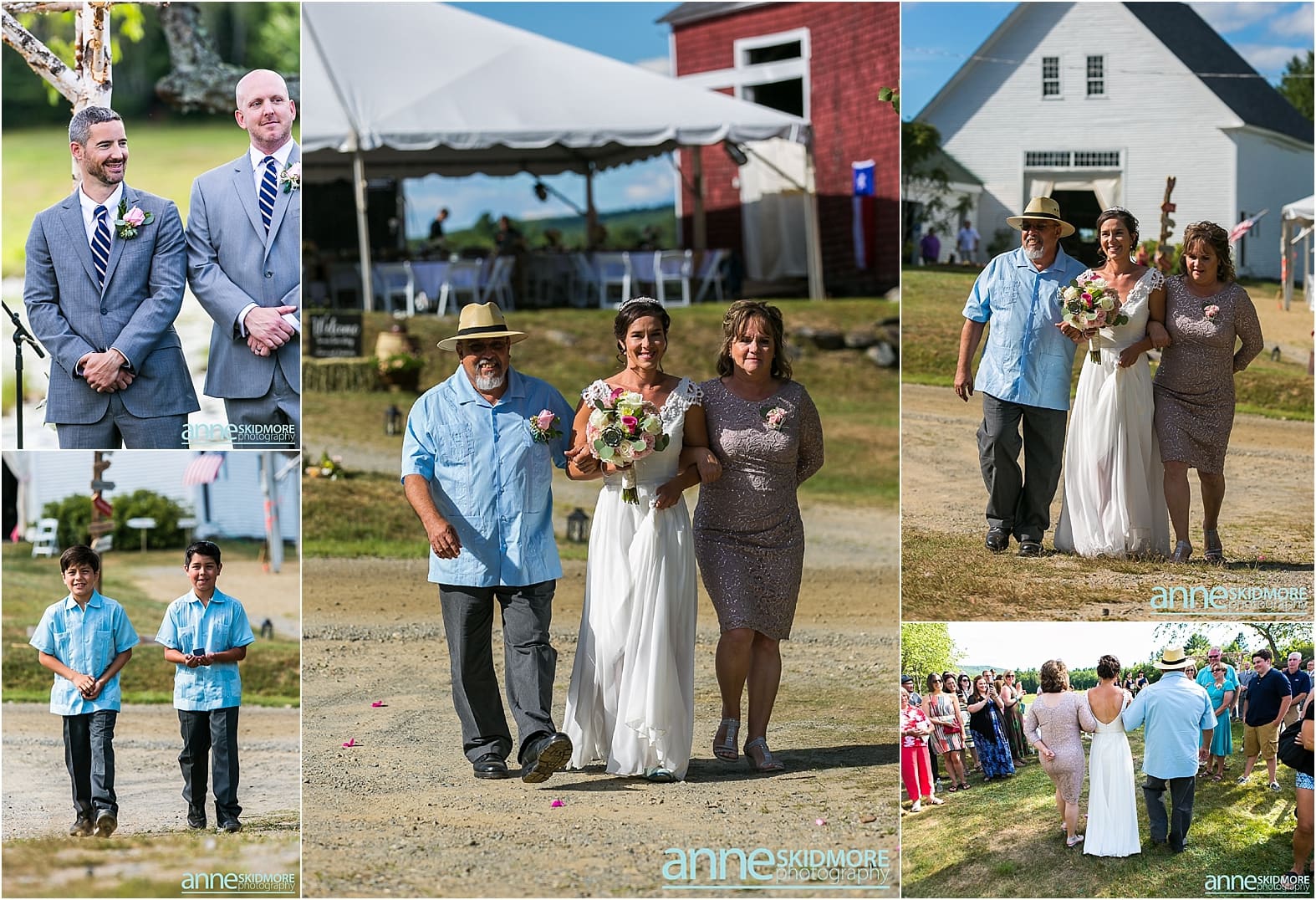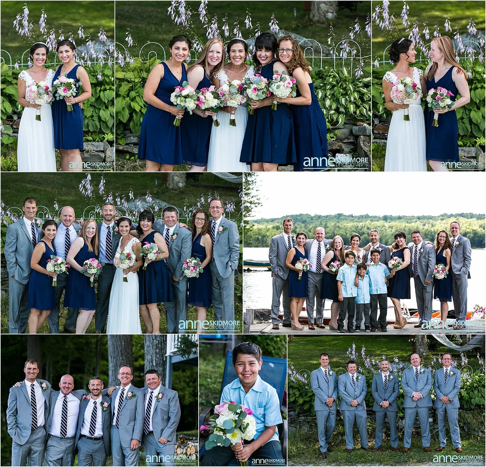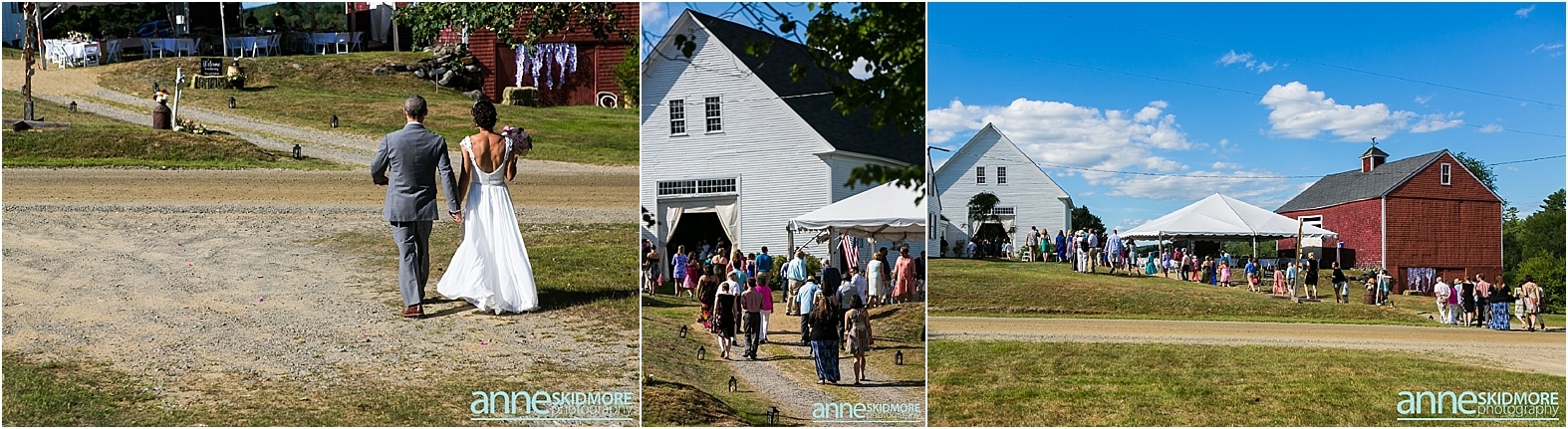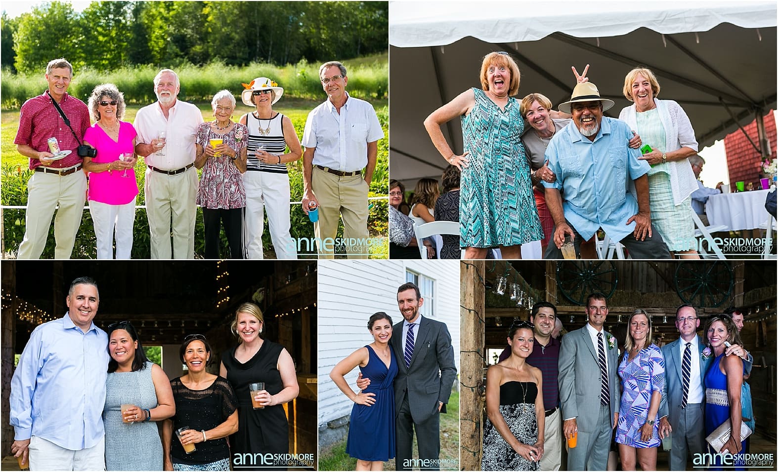We love this wedding! It was a true family farm barn wedding in Maine! Jamie’s grandmother has an absolutely charming farm in New Vineyard, Maine and this was the perfect and very personal place for Kimberly and Jamie to have their special day. In addition to the beautiful farm, Jamie’s folks live in a stunning lake house just down the road. Jamie got ready at his parents lake house while Kimberly and her ladies got ready at a rented lake house just a little further down. We loved Kimberly’s stunning Michal Motil dress, which was a two piece top and skirt! The best part? She started in an elegant long skirt to start the day, and then later changed into an adorable short skirt for dinner and dancing! These two opted for a first look moment so they could spend lots of time with friends and family after their ceremony. Jamie waited for Kimberly on the dock of his parents lake house, and their reaction to seeing each other for the first time is one of the most expressive and amazing we’ve ever captured! After their first look we took portraits at the lake house and also back at the family farm! I mean we had the best of both worlds! Before we knew it, it was time for these two love birds to get married. They wed across the street from the family farm, right by the family pond. Yes, they even had a family pond, so adorable! After the ceremony everyone walked back to the farm for cocktail hour in the barn. Dinner was under the tent with warm, sweet and funny toasts filling the air. After dinner we scooted to the fields to take portraits under the most incredible sunset we’ve seen all year! It was on FIRE! When we returned everyone was back in the barn dancing the night away. What a totally awesome day! Congrats Jamie & Kimberly, we loved capturing your beautifully rustic chic Maine family farm and barn wedding!