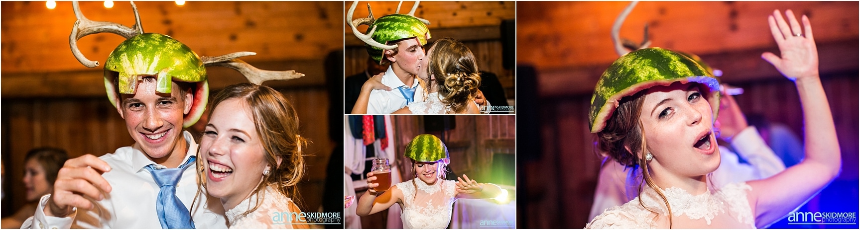 The Barn at Moody Mountain Farm is definitely a highlight of our summer when we get to photograph at this lovely venue. We love it here! Tucked into the fields of historic Wolfeboro, we can feel the history that lives with this place and it mixes a rustic barn (classic New Hampshire) wedding atmosphere with so much elegance. We know Nick and Katrina because, not only are they locals to the Mount Washington Valley, but they are wonderful friends of ours and bring so much character and enthusiasm to our climbing community. I’ve been chatting with Katrina all summer long at our evening cookouts getting the latest news on the details surrounding the wedding day. I’ve been excited about this day since they booked last year! Nick, being the goofy character of the two, brought so much fun and laughter to the day while Katrina was absolutely stunning and helped quite Nick up a bit with her looks. The humor these two share is on another level. They are one of those couples that are PERFECT for each other. We lucked out with the rain holding off until the later evening hours and the misty foggy weather created a very cozy atmosphere. The ceremony was moved into the barn and their friends and families casually lined the perimeter and cheered as they became husband and wife. While guests enjoyed the cocktail hour on the back side of the barn, we were able to capture a ton of fun portraits of not only Nick and Katrina, but the bridal party and family as well. Tuckerman Brewery filled many empty mason cups to the brim as well as some signature drinks. The toasts were underway and dinner soon followed that in the barn. Guests were free to roam the barn and the property and watch as the traditional watermelon was passed around outside to be perfectly carved into Nick’s crowning of the groom. As the rain started to fall in the last evening minutes, Nick, Katrina, Austin (my awesome second photographer) and I all ran out into the rain to capture a few final portraits of the couple standing in the giant entrance to the barn. We try our best to compensate for some fun portraits even if the sunset decides not to show that day. There was so much dancing and it was so much fun to capture the party! There is a tradition in Katrina’s family that at every wedding, they crown the groom with a custom watermelon helmet. I’m so glad I was still around to document this craziness. Katrina was even crowned with one too! This was by far the funniest thing I’ve ever photographed at a wedding thus far. You two are so lucky to have such fun families! Keep on being you and we can’t wait to see your marriage and family grow! You two are the best! xo!