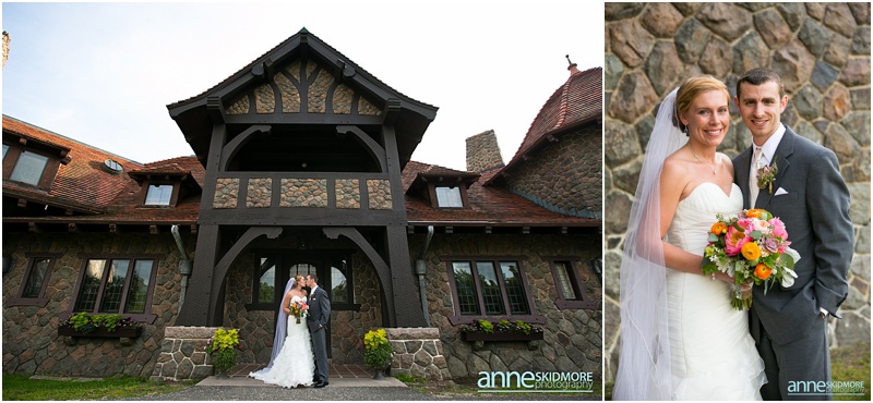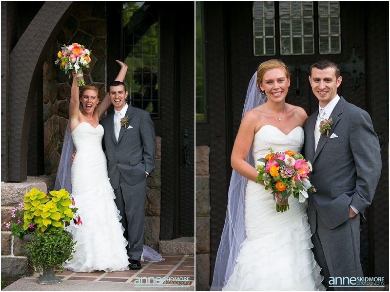 Whoa! So many beautiful images from such a stellar wedding! What a day Josh and Jill had on August 2nd, 2014. Their wedding day started off in Wolfeboro, New Hampshire. Jill chose to get ready at the Wolfeboro Inn while Josh was at The Inn On Main with his guys getting suited up! They both drove separately to Castle In The Clouds where their wedding day was being hosted. The old roads, paths, stone carriage house, castle style house and of course the views were all breathtaking! Josh and the guys quickly headed up in the trolley to the ceremony site and Jill and her ladies stayed at the lower carriage house to help Jill into her dress and to take portraits. And we have to mention how Jills bouquet from Lotus Floral Designs was stunning, simply stunning! Soon it was time for Jill and her ladies to take the trolley up and for Jill to get married! I mean this wedding ceremony location is epic! It’s just stunning, and they had such an impeccable day! They had a beautiful ceremony filled with laughter, tears of joy, a couple of readings, and sealed it with a proper smooch! Afterwards it was portrait time with family, the wedding party, and then, with just the two newlyweds. We did portraits up at the castle, and then walked our way back down to the reception. So many beautiful spots to stop and take photos! Next it was time to celebrate in the upstairs of the carriage house. DJ Nate Downs hosted the evening and added beautiful up lighting to add a wonderful ambiance to the reception room. His beats kept everyone dancing, and he even helped us make it possible to sneak in some incredible sunset shots back at the main castle! Thank you Nate, it was so worth it! Take a peek below, and you’ll see how awesome this wedding day was! Thank you Jill and Josh! Lea & I had a blast capturing your wedding day!