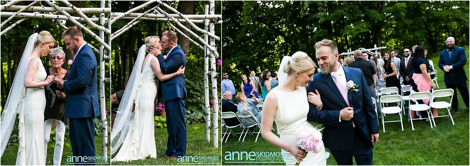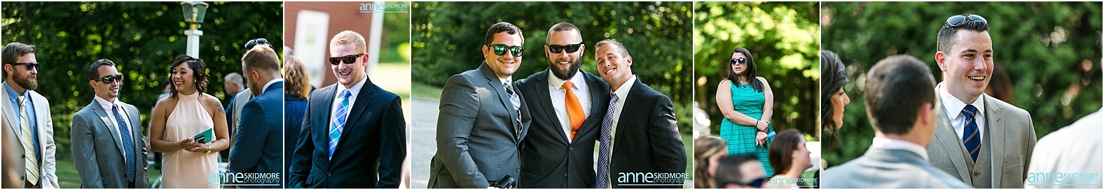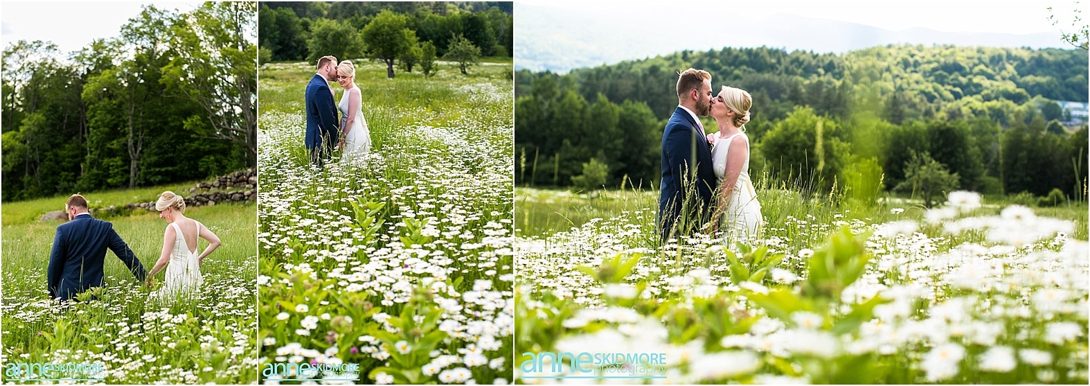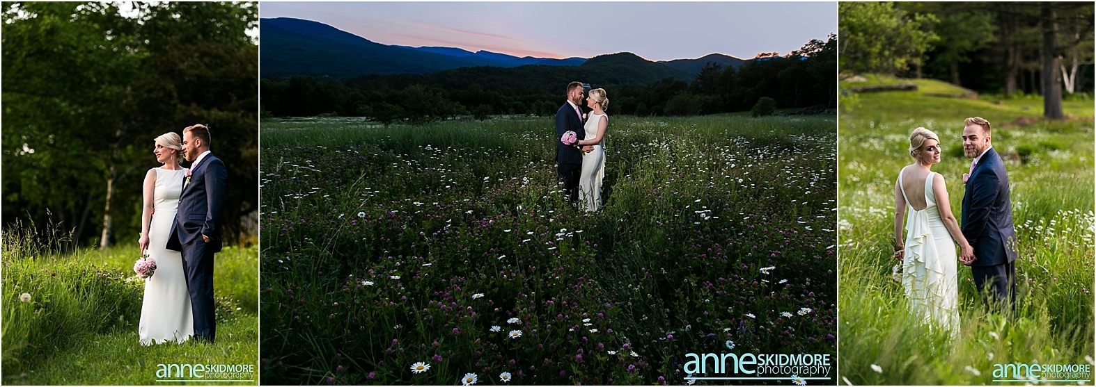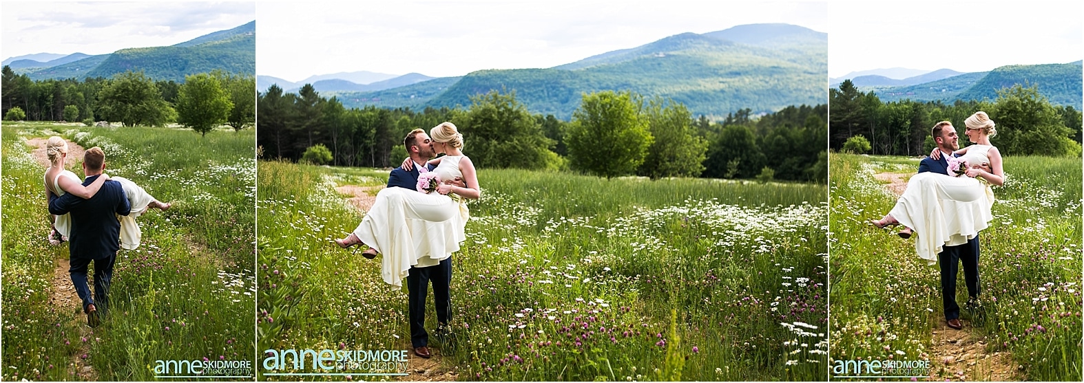 Here we have a beautiful couple who wed this past June at one of our favorite venues in Jackson, New Hampshire known as The Christmas Farm Inn. The mountainous and wooded backdrop of Jackson fit exactly what they envisioned for the location of their wedding day. The rustic charm of the inn, particularly the barn, and its location up in the White Mountains made Kyle and Shannon fall head over heels with The Christmas Farm Inn. Their ultimate vision was to have an intimate wedding, in an outdoorsy location with their closest friends and family. Kyle got ready in “The Barn”, while Shannon was in the “Sugar Shack” just around the corner. They had their ceremony outside on the front lawn, and included a very sweet tree planting ceremony. As soon as their ceremony was over we bopped around the Christmas Farm Inn property for portraits and we also went to a couple of incredible spots (with special permission) in Jackson, New Hampshire. These two were so fun to work with, and Kyle even swooped Shannon off her feet (without any prompting from us or her!) and carried her down the trail to the field of wildflowers. What a guy! We were obviously swooning over Shannon’s BHLDN dress and Kyle was looking very sharp is his blue-grey suit, we loved their impeccable style! The evening was full of laughter, love, dancing, toasts, and to round it out we snuck out for some sunset portraits. Thank you Shannon & Kyle, we loved capturing your beautiful wedding day!