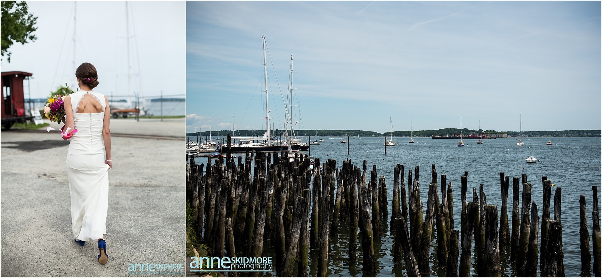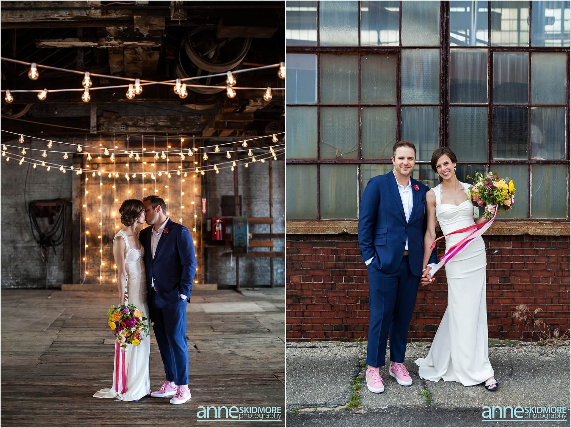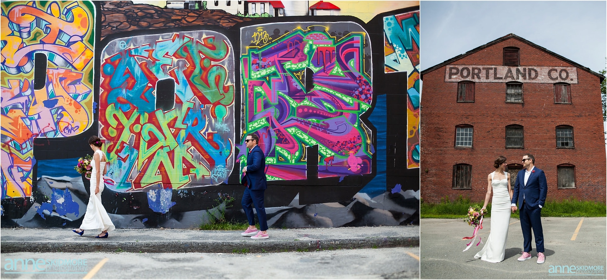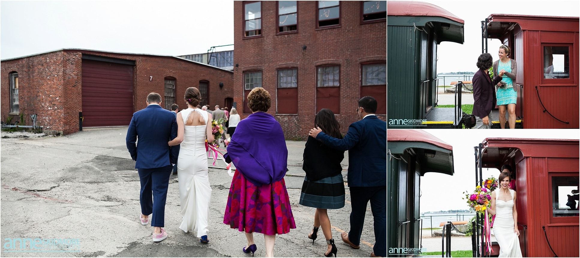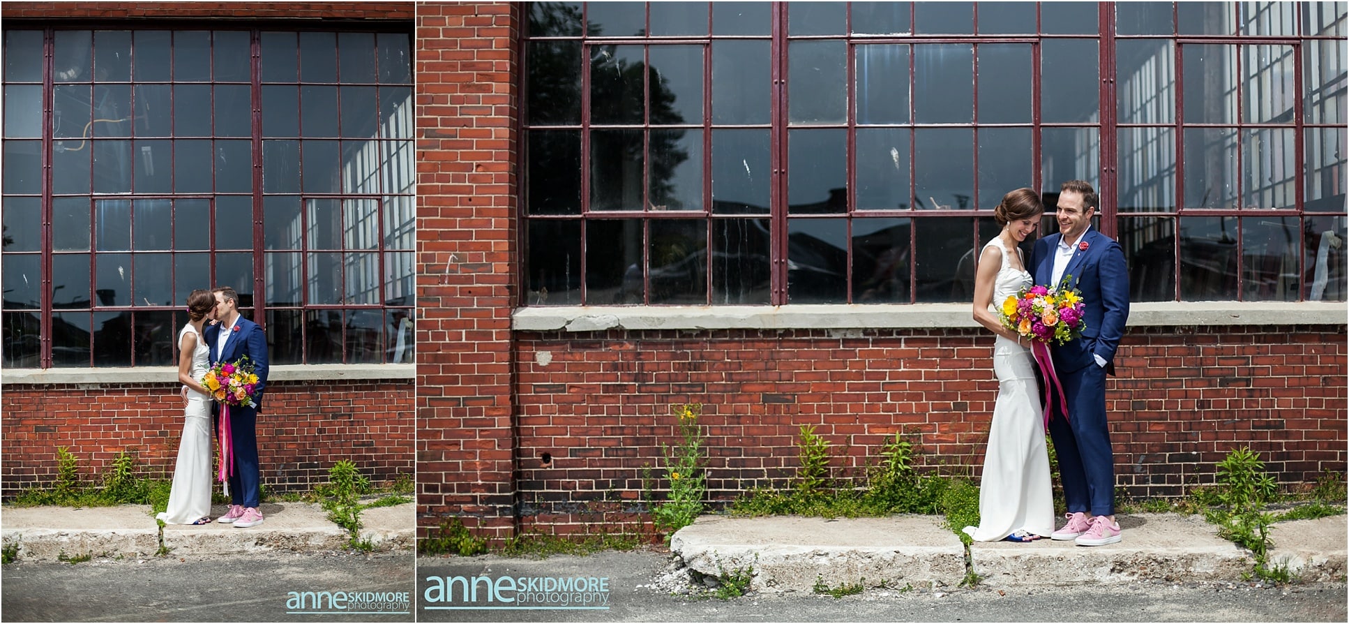 On June 27th, 2015, Megan and Tyler were married on the Eastern Promenade at Fish Point in Portland, Maine. What makes this wedding so unique was Megan and Tyler’s vision on all the moving parts of the day. There were two cocktail hours, a train to take guests to the ceremony location, an incredibly inspiring reception location and the best spot for a first look I’ve encountered thus far. The entire wedding as a whole really utilizes everything that makes Portland, Maine so special. While Tyler was lacing his pink sneakers at an undisclosed location, I met Megan at the Portland Regency Hotel in downtown Portland as the finishing touches of her make-up were wrapping up. Her Nicole Miller dress was a stunner as she slipped into it with her mom and sister’s help. I love how much joy the bright and colorful bouquet brought her as she first held it with her dress on. There is a corner tucked away in downtown Portland that has been spray painted on an entire wall. This is where Megan envisioned the first look location to be held. She had no idea that Tyler was going to be wearing his pink sneakers with his suit. It was all coincidence that the pink ribbon on the bouquet matched his sneakers that matched the Portland graffiti wall. After a few portraits downtown we drove to the Portland Company Complex, where the reception was held. What a venue! Rooms upon rooms all left in their original industrial form with incredible lighting pouring through the windows. We spent some time walking around the interior and exterior of the Complex, utilizing all the best spots for portraits. Guests started to arrive at the Portland Company Complex and each grabbed a drink before they stepped on the train. Clyde made sure each guest was accounted for a blew the final whistle. Off we all went down the tracks to Fish Point on the Eastern Promenade overlooking the sailboats in the harbor. Guests gathered informally for the ceremony and Megan and her dad were the last to disembark from the train. After the ceremony, some guests went for a quick train ride as other lingered on the Promenade. All aboard as we all rode back to the Portland Company Complex. Inside, a cocktail hour was held inside “the industrial room” with a beautiful lighting display. After, guests moved to the “Room with a View” for the dinner portion of the evening. A gourmet menu, served family style, was a great was to introduce why Portland has become so well known for its food. Toasts were followed by dancing and the night of celebration was underway. I’ll always remember this wedding and I was so inspired to be a part of it. Megan and Tyler, thank you so much for asked Brian and I to capture it. Enjoy these images! Wishing you two all the best in your new adventure together out west.