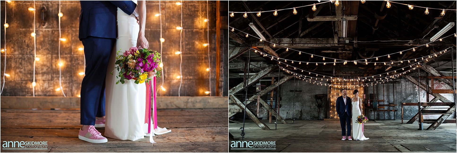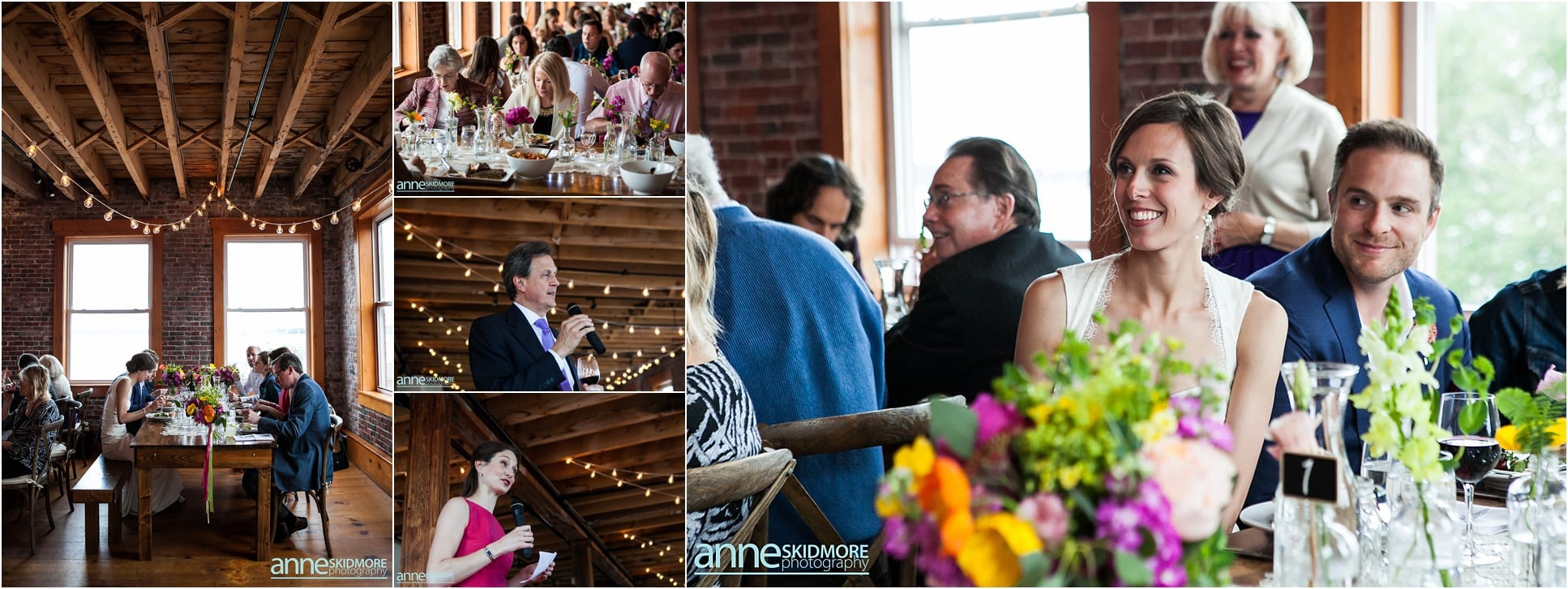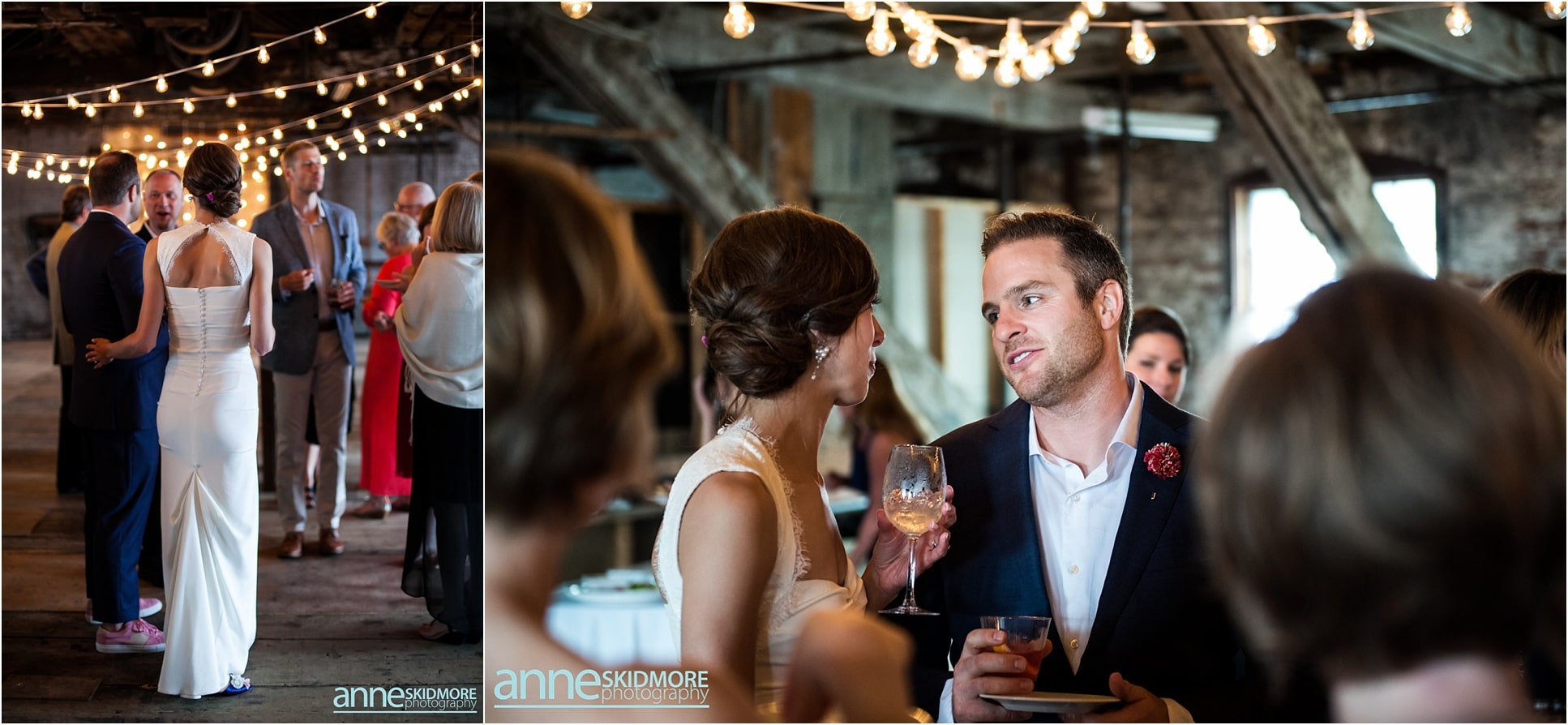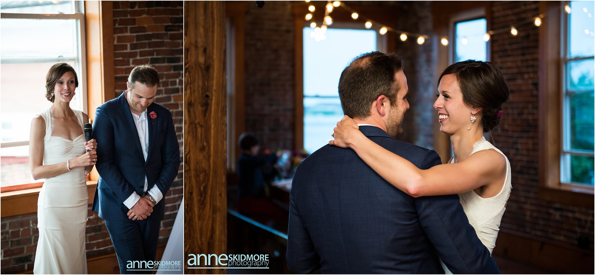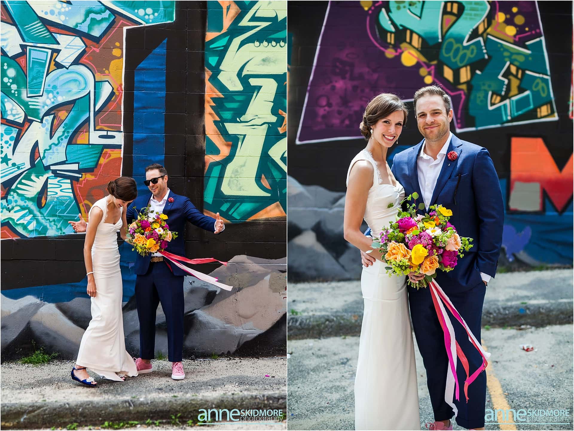 On June 27th, 2015, Megan and Tyler were married on the Eastern Promenade at Fish Point in Portland, Maine. What makes this wedding so unique was Megan and Tyler’s vision on all the moving parts of the day. There were two cocktail hours, a train to take guests to the ceremony location, an incredibly inspiring reception location and the best spot for a first look I’ve encountered thus far. The entire wedding as a whole really utilizes everything that makes Portland, Maine so special. While Tyler was lacing his pink sneakers at an undisclosed location, I met Megan at the Portland Regency Hotel in downtown Portland as the finishing touches of her make-up were wrapping up. Her Nicole Miller dress was a stunner as she slipped into it with her mom and sister’s help. I love how much joy the bright and colorful bouquet brought her as she first held it with her dress on. There is a corner tucked away in downtown Portland that has been spray painted on an entire wall. This is where Megan envisioned the first look location to be held. She had no idea that Tyler was going to be wearing his pink sneakers with his suit. It was all coincidence that the pink ribbon on the bouquet matched his sneakers that matched the Portland graffiti wall. After a few portraits downtown we drove to the Portland Company Complex, where the reception was held. What a venue! Rooms upon rooms all left in their original industrial form with incredible lighting pouring through the windows. We spent some time walking around the interior and exterior of the Complex, utilizing all the best spots for portraits. Guests started to arrive at the Portland Company Complex and each grabbed a drink before they stepped on the train. Clyde made sure each guest was accounted for a blew the final whistle. Off we all went down the tracks to Fish Point on the Eastern Promenade overlooking the sailboats in the harbor. Guests gathered informally for the ceremony and Megan and her dad were the last to disembark from the train. After the ceremony, some guests went for a quick train ride as other lingered on the Promenade. All aboard as we all rode back to the Portland Company Complex. Inside, a cocktail hour was held inside “the industrial room” with a beautiful lighting display. After, guests moved to the “Room with a View” for the dinner portion of the evening. A gourmet menu, served family style, was a great was to introduce why Portland has become so well known for its food. Toasts were followed by dancing and the night of celebration was underway. I’ll always remember this wedding and I was so inspired to be a part of it. Megan and Tyler, thank you so much for asked Brian and I to capture it. Enjoy these images! Wishing you two all the best in your new adventure together out west.