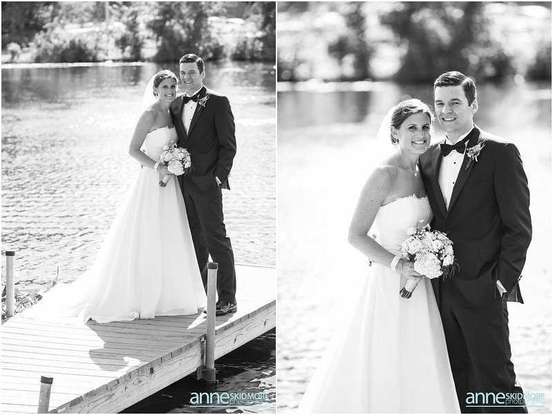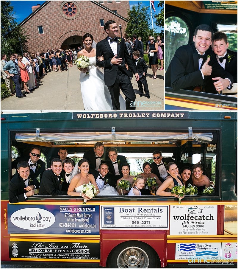 How charming is the Wolfeboro area? Yes, so cute and so much character! I was very excited to capture Kevin and Melissa’s wedding day at the Wolfeboro Inn on August 10th, 2013. I arrived as Melissa stepped out on her porch and greeted me with a big wave! They both got dolled up at the inn, each with their bridesmaids and groomsmen. At Melissa’s request, we did a quick photo with her and Kevin on seperate porches, and made sure Kevin didn’t peek at Melissa. The groomsmen rode Molly The Trolley to St. Katharine Drexel Church with friends and family shortly arriving after them. They had a lovely traditional church wedding and eagerly hopped back on the Wolfeboro Trolley and headed to the Wolfeboro Inn. Melissa and Kevin started their portrait session at the inn but then opted for some unique spots in Wolfeboro to mix it up. It is great to take some classic shots where your wedding is being held, but it is also inspiring to mix it up and shoot a few off site! Kevin and Melissa were such a fabulous, fun, and gorgeous couple to work with but, what stood them apart, is their great sense of humor! This was apparent with the beer koozies they had for their guests and the character in which they danced into the tent when they were formally announced. Then their first dance was a fast tempo-ed fun one, 500 Miles! I love that song, and they had so much fun during their first dance as husband and wife! Wonderful toasts were given by Melissa’s father, maid of honor, best man, and a blessing by Kevin’s father. We snuck out for some dusk photos with the “Winnipisaukee Belle” in the background. Oh la la! The evening was filled with high energy dancing under beautiful clear evening skies. Congrats you two! What a day!