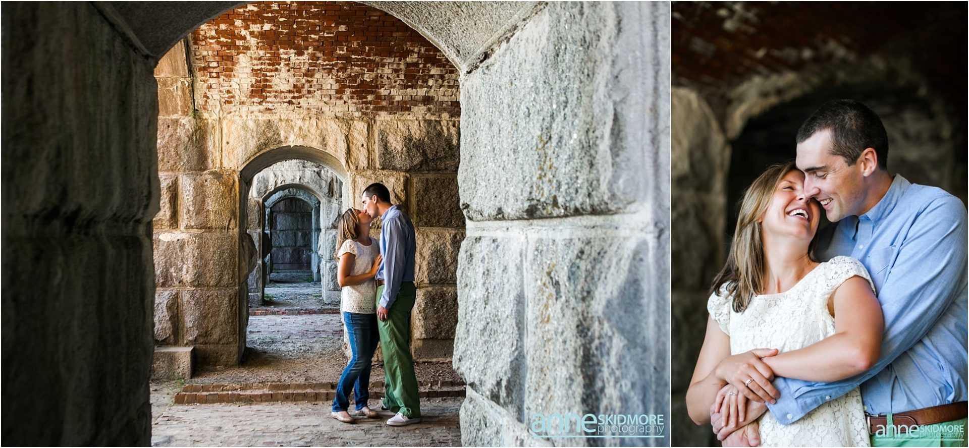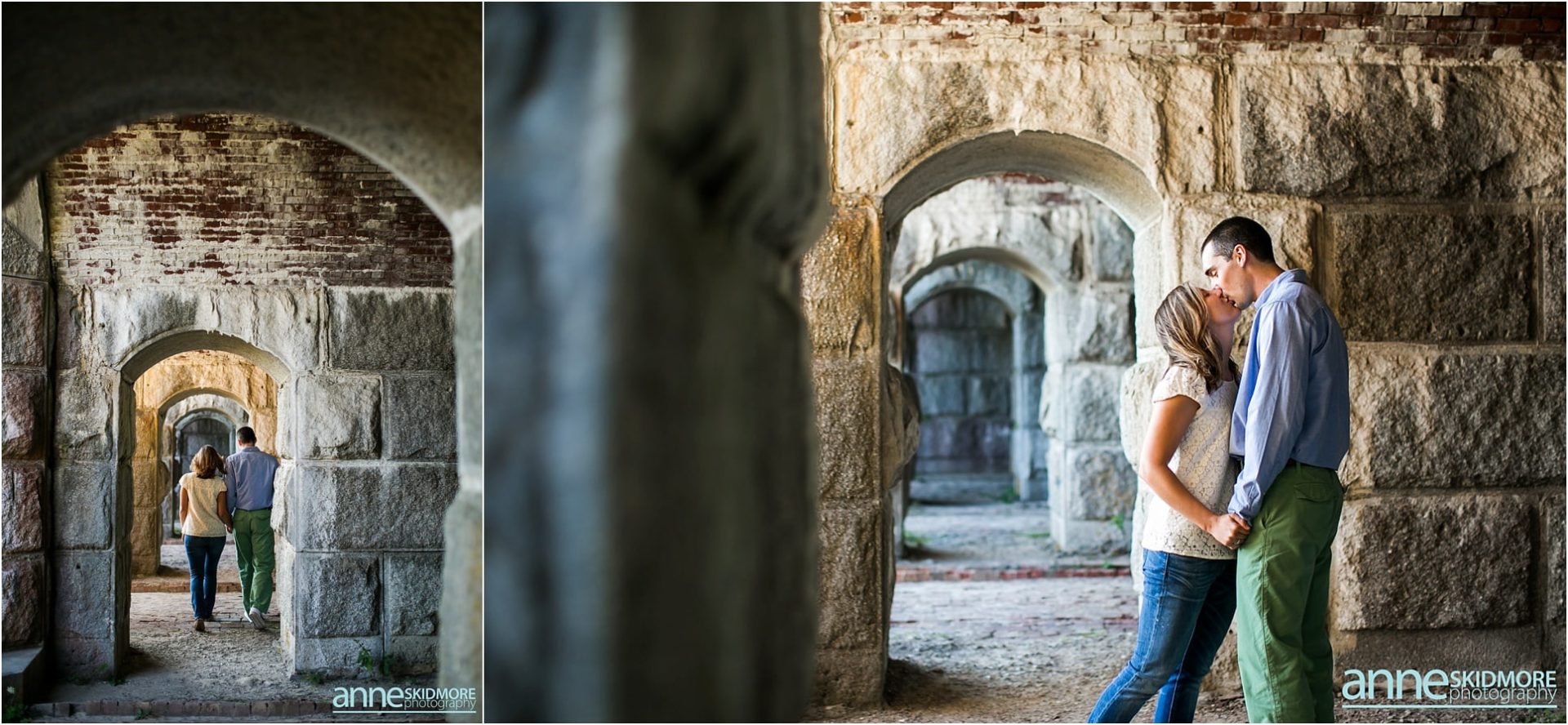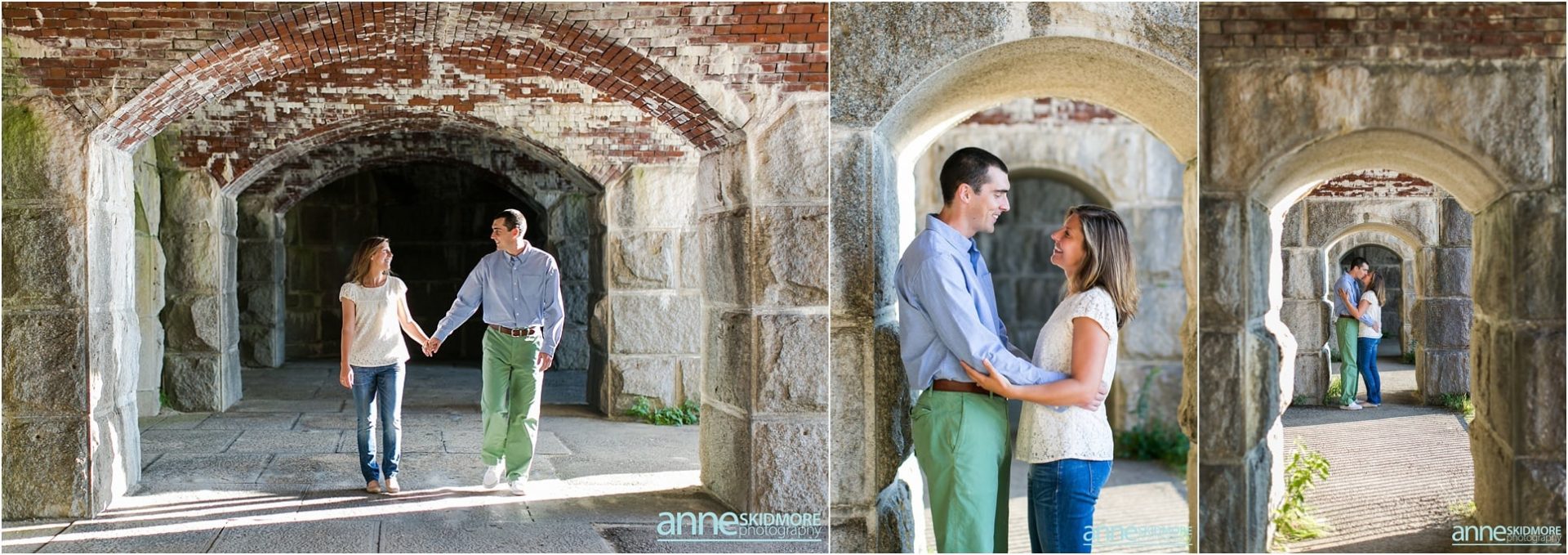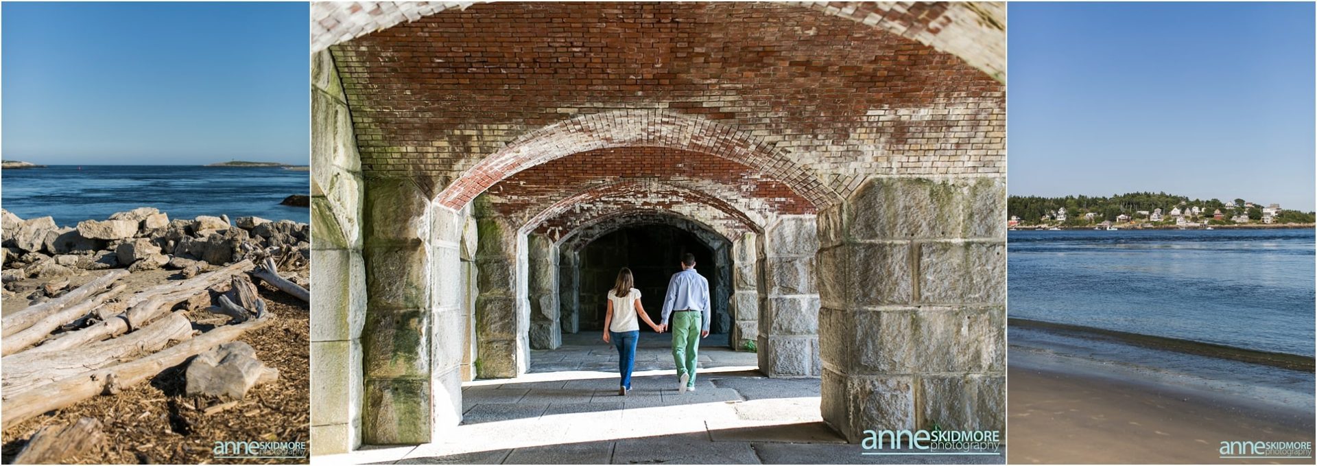 Pat and Becca will be hosting their wedding next June at the Coastal Maine Botanical Gardens in Boothbay, Maine. We are so excited to be there to capture their beautiful wedding and we are also so excited for their engagement photos. Pat and Becca chose Popham Beach State Park to take their engagement photos as it’s a place they frequent often. It was such a pleasure to visit the Maine coastline and utilize the historic fort, as well as the water, for many of their photos. We started the session in Fort Popham meandering around the stairwells and all the different archways. Making our way down to the water, we stopped for some pictures along the driftwood before venturing into the ocean. Pat and Becca were so dynamic to photograph, as they sang songs to each other (mostly Becca did the singing) and continuously would burst out laughing. They will have such a fun life together, that’s for sure! I’m so glad we were gifted with a beautiful sunset over the Kennebec River to end the evening. Thank you two for being so awesome! We can’t wait to photograph your wedding next year!