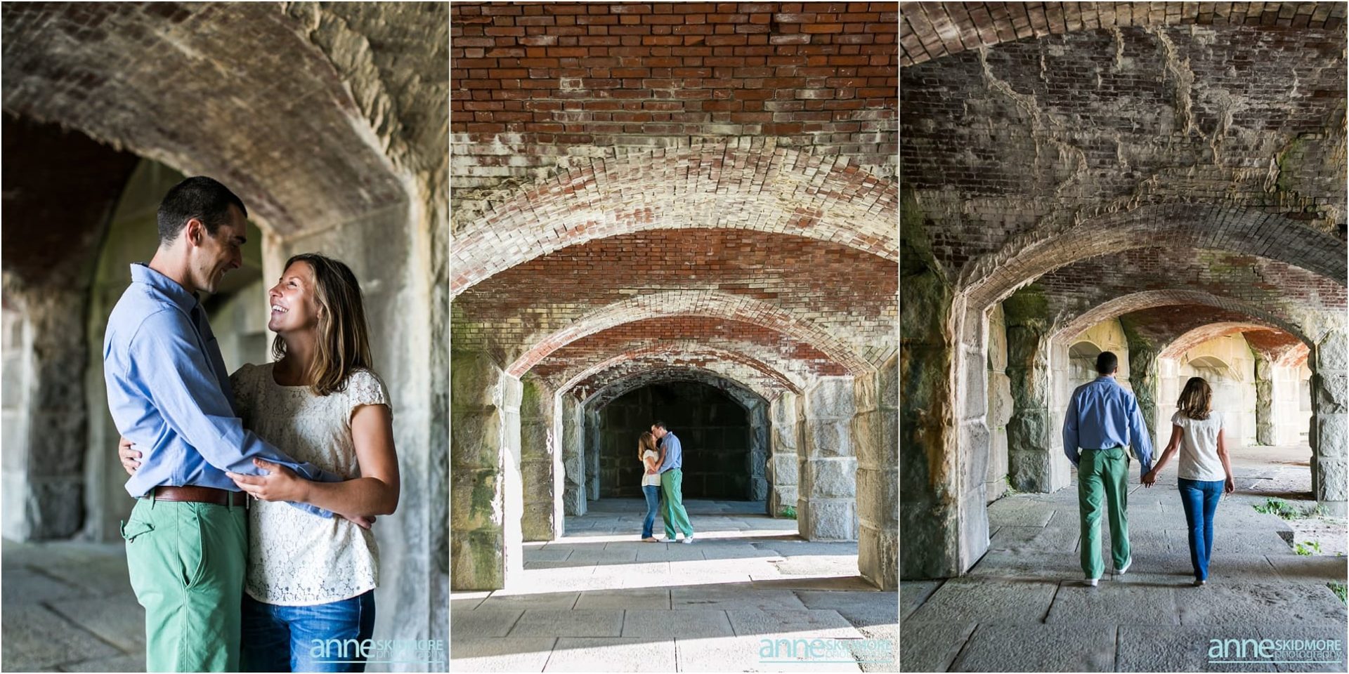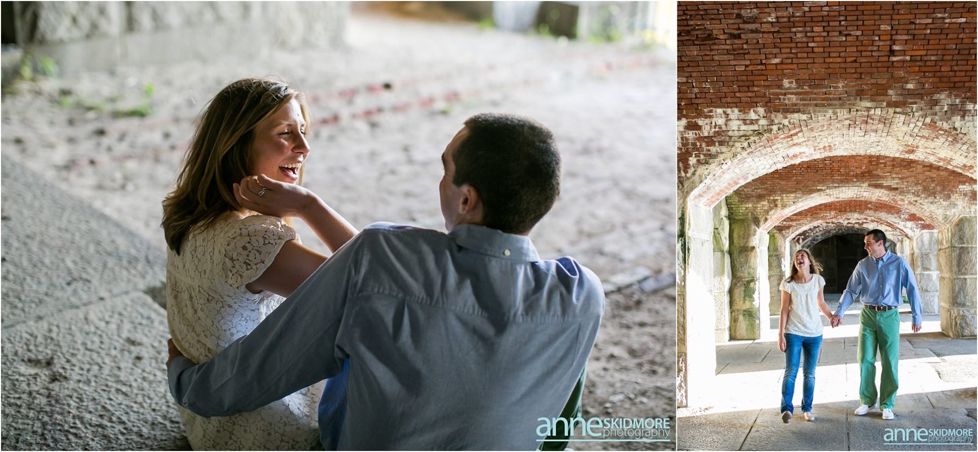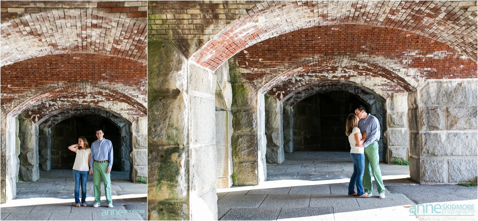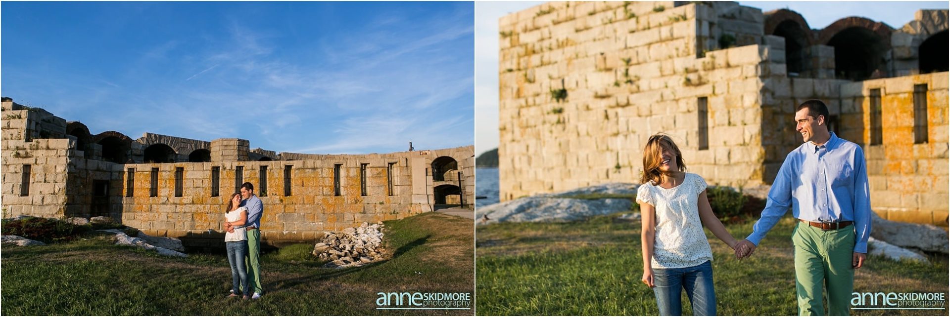 Pat and Becca will be hosting their wedding next June at the Coastal Maine Botanical Gardens in Boothbay, Maine. We are so excited to be there to capture their beautiful wedding and we are also so excited for their engagement photos. Pat and Becca chose Popham Beach State Park to take their engagement photos as it’s a place they frequent often. It was such a pleasure to visit the Maine coastline and utilize the historic fort, as well as the water, for many of their photos. We started the session in Fort Popham meandering around the stairwells and all the different archways. Making our way down to the water, we stopped for some pictures along the driftwood before venturing into the ocean. Pat and Becca were so dynamic to photograph, as they sang songs to each other (mostly Becca did the singing) and continuously would burst out laughing. They will have such a fun life together, that’s for sure! I’m so glad we were gifted with a beautiful sunset over the Kennebec River to end the evening. Thank you two for being so awesome! We can’t wait to photograph your wedding next year!