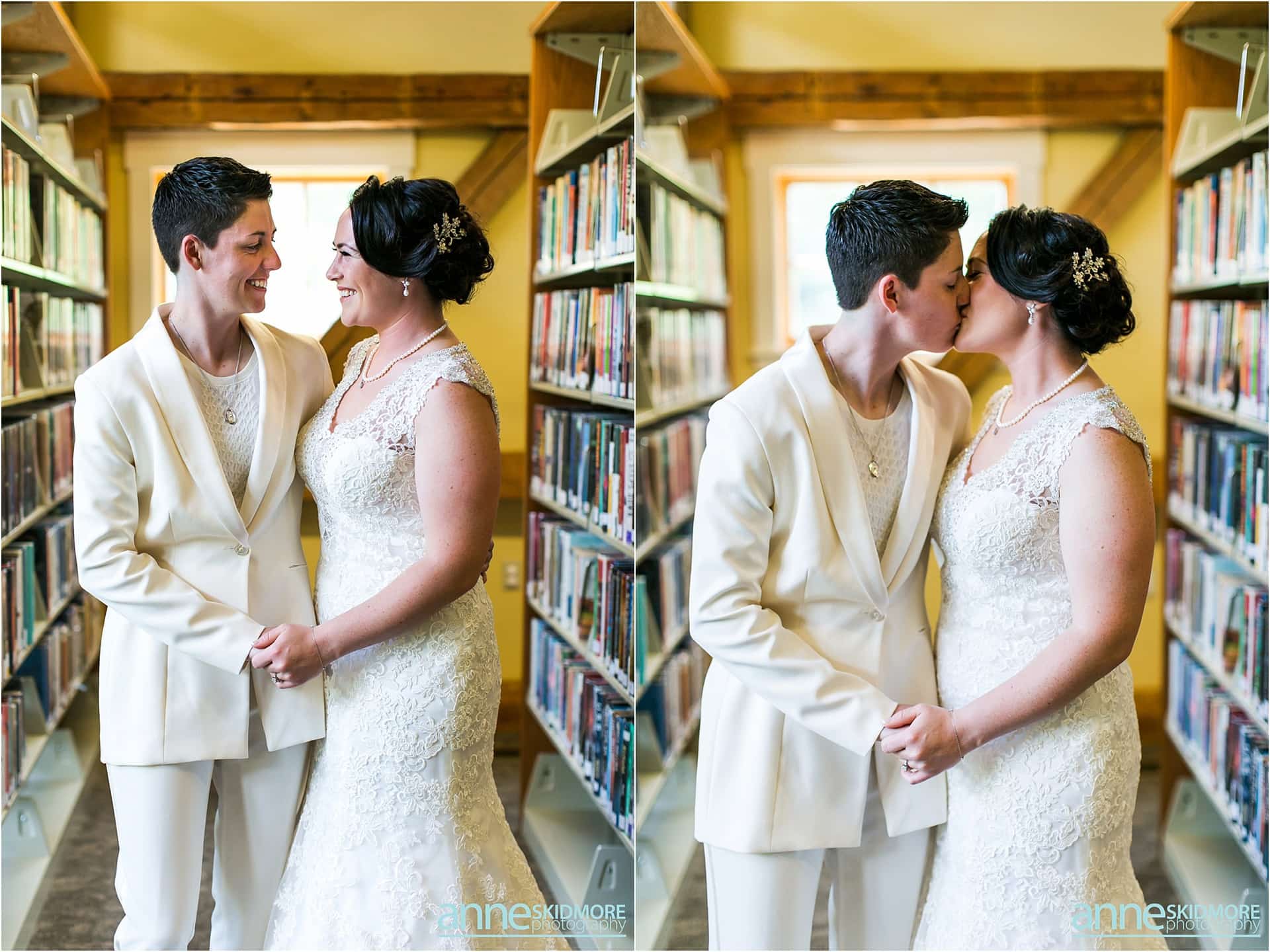 Amy and Nichole were married on the second of July, just as they would have hoped. They celebrated their love in a unique way, always on the second of each month. Their first date was on July 2nd, five years ago. They were engaged on December 2nd and often, Nichole would continue to surprise Amy with something most months, always on the second. Luckily, July 2nd, 2016 fell on a Saturday- a chilly one for the usually holiday weekend. A cold front moved through, bringing such a refreshing breeze and some really dramatic cloud cover off in the distance. Nichole loves to read and it was their fitting idea to have their first look in the Jackson Public Library. After the girls both got ready on opposite floors of the Eagle Mountain House, Nichole awaited Amy’s arrival with her four bridesmaids. Nichole’s bridesmaids wore a darker shade of blue while Amy’s wore a bright bold blue color. Each of the girls got to pick out their own favorite Tom’s shoe to wear, a gift from Amy and Nichole. Amy arrived at the library and all the girls started bawling. The emotions in the library were so high and it was so neat to have all the bridesmaids witness their first look. Amy and Nichole each grabbed a book, stepped out into the aisle and faced each other, with the books still covering their faces. On their count of three, they lowered the books. Tears! Everyone was crying! We spent the next hour visiting different locations around downtown Jackson taking portraits and having an absolute blast. These girls are all so special. Guests started arriving back up at the Eagle Mountain House- the ceremony was about to begin! Amy and Nichole were each walked down the aisle by their parents. A unique ceremony, centered around the love of each other as well as their community, was followed by their fist kiss as brides! A skip down the aisle and these two snuck out to the bridge just below the ceremony site for a quite moment alone. Cocktail hour back up on the veranda welcomed the guests and we were able to spend much of the time taking details of the tent and fun portraits of the guests enjoying themselves. Speeches, followed by a wonderful dinner in the tent, was a prelude to all the dancing that was about to come. Luckily, I was able to sneak Amy and Nichole away for a few more portraits down the road. I’m so glad we did! They were even more adorable than before and we were able to utilize the beautiful evening light. I stayed for some fun, classic dance moves- Britney Spears definitely brought some people to the middle of the dance floor. Thank you two for asking us to document your special day. Amy and Nichole- you two are so special to us and we are so glad we were there to witness it all. All the best in the world!!