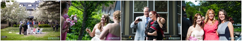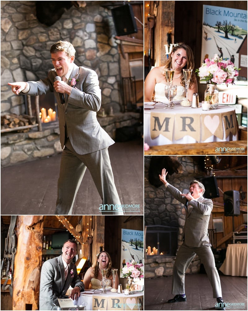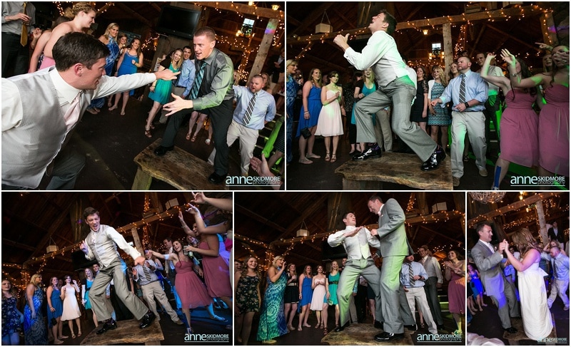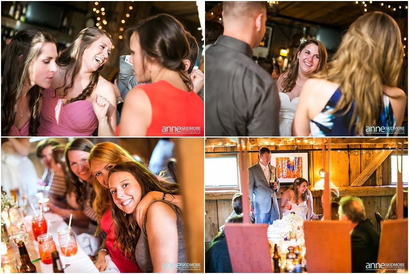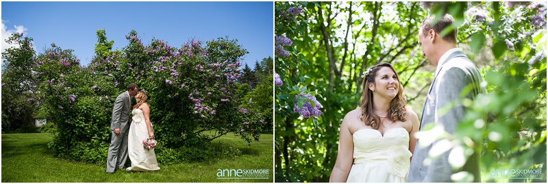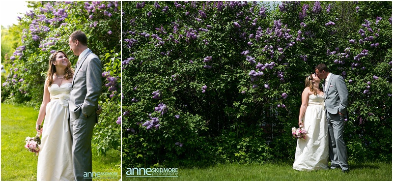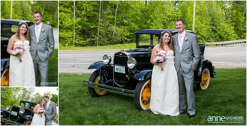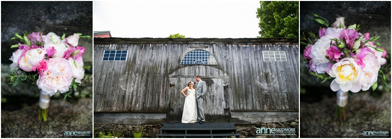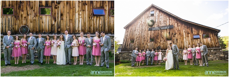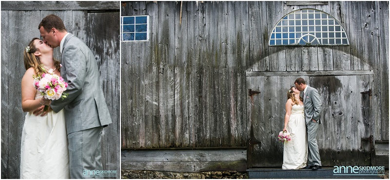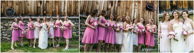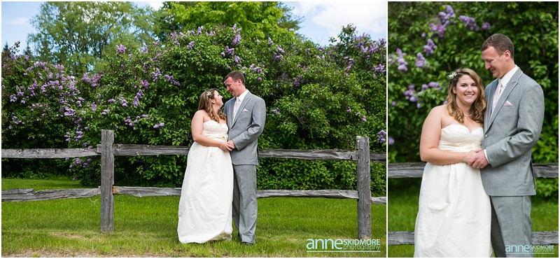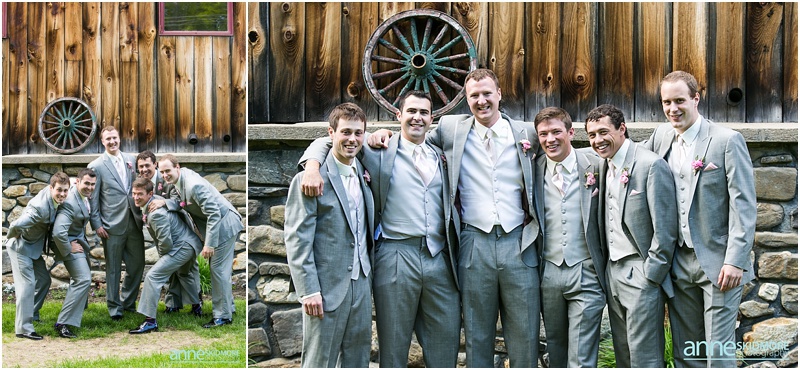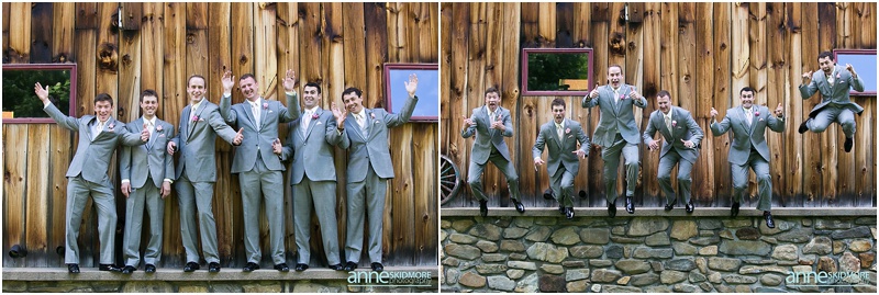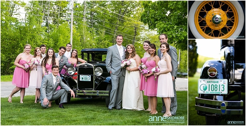 Wow, this was truly a beautiful day! Max and Kelly wed on May 31st, 2014 at the classic Whitney’s Inn and Shovel Handle Pub! We love this venue, it’s tucked up in the mountains of Jackson, New Hampshire, yet you can easily sneak into downtown Jackson to do even more photos! Which is just what we did! Kelly and Max got ready at the inn (love Kelly’s J.Crew wedding dress!), and had a sweet first look moment off site in Jackson. It was lightly sprinkling at the beginning of their first look moment, but this did not phase Kelly one bit. Before we knew it the rain stopped, and the sun came out! We wandered to these incredibly huge lilac bushes that were in perfect bloom, and lilacs are the New Hampshire state flower, so this was an impeccable backdrop! Next we went to the beautiful Jackson covered bridge, and our final stop was at the Jackson Falls before heading back up to the inn for their “I Do’s”. They had a lovely ceremony which was officiated by one of our favorites, Kimberly Steward, just outside of the inn and right below Black Mountain. After the ceremony it was time to do portraits over by the barn! Kelly’s bridesmaids were in beautiful pinks, while the guys were is sharp looking grey suits. And this bridal party was a riot! The guys flagged down a man who happened to be driving his vintage car by us, and we were able to do some photos with this car! And the groomsmen insisted in doing a photo with them jumping off the barn stone wall! Thankfully no one was hurt, so it was totally worth it and everyone was able to dance into the wee hours of the evening. And did they dance! You’ll see below! Thank you Kelly & Max, we had so much fun capturing your wedding day!