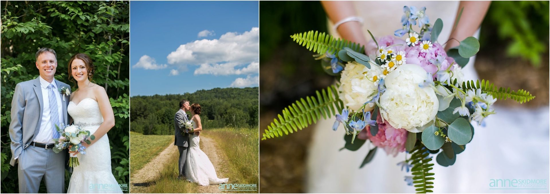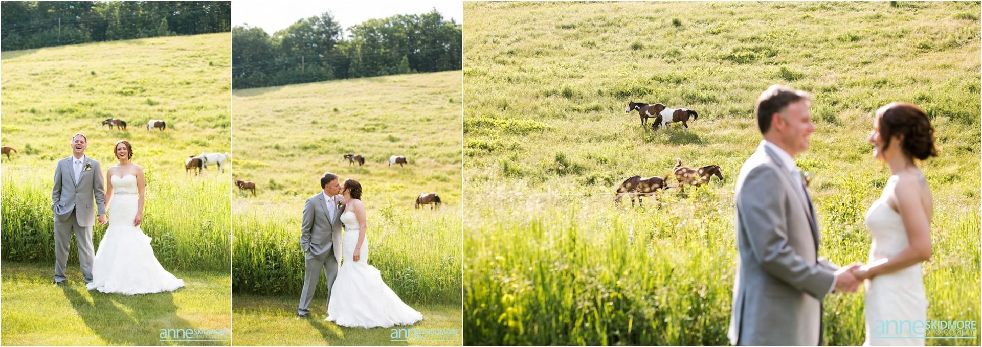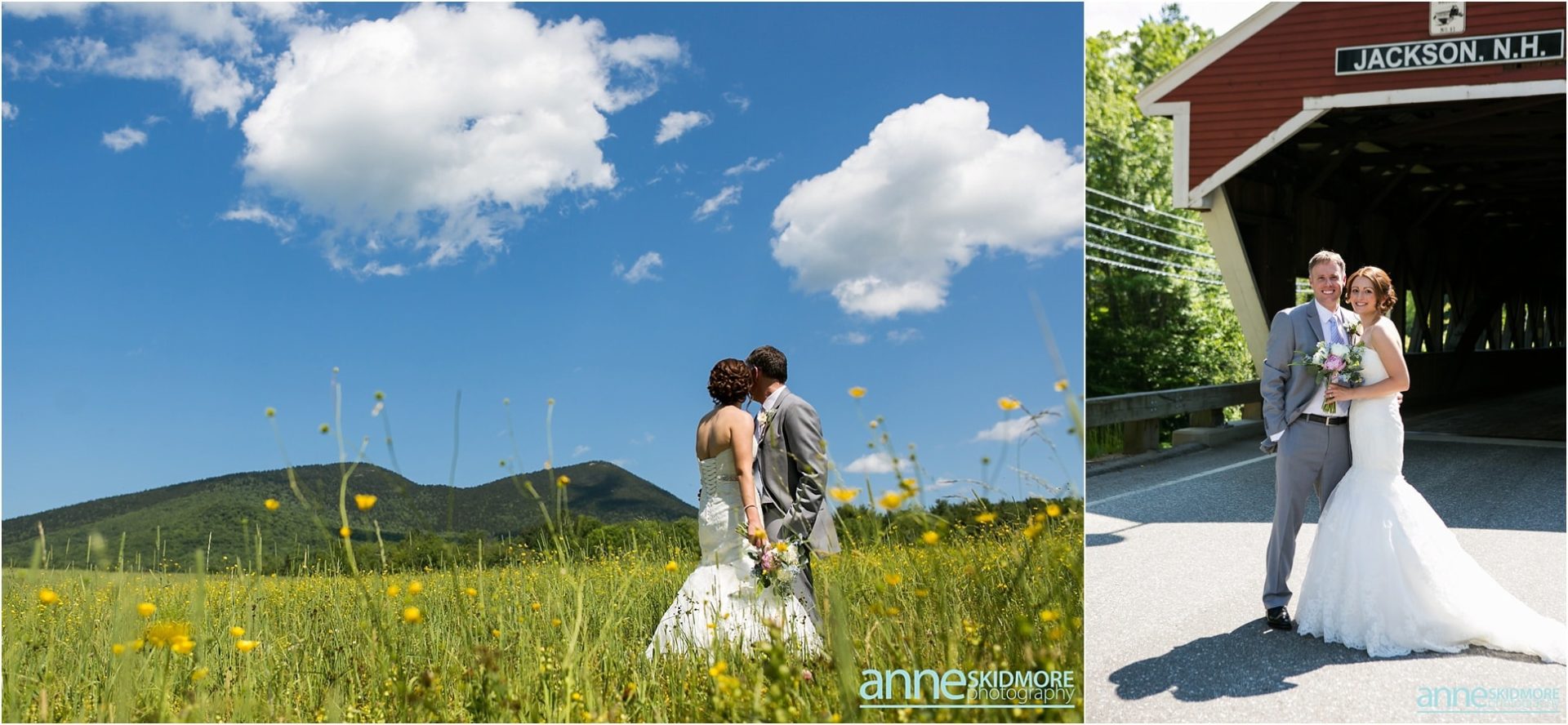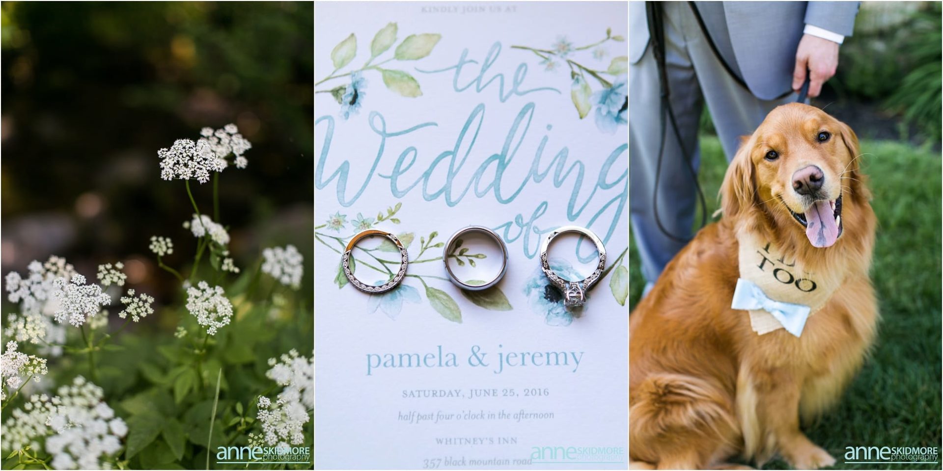 Pam and Jeremy were married on the most beautiful bluebird day at the Whitney’s Inn in Jackson, NH on June 25th, 2016. They expressed from the beginning how important it was for them to include their adorable golden retriever, Dakota, in the day surrounded by their best friends and family. I’m so glad the weather held and all their guests were able to see a typical New Hampshire summer day. Pam and Jeremy opted for a first look and Pam guessed it for sure…there were tears! We were able to utilize the open fields right down the road from the Whitney’s Inn for some portraits. The fields were blooming with yellow flowers which really popped against the blue sky. We made a special trip down to the covered bridge before returning back to the Whitney’s Inn for family portraits and bridal party portraits. The ceremony was held in the new woodland site across the street in the woods. Really beautiful vows were said followed by the first kiss! The light was hitting just right during cocktail hour and the horses roamed over across the fields to say hello. A wonderful reception in the Shovel Handle Pub was lively and full of happy tears and lots of love. I’m so glad we were able to drive up to an overlook for the sunset. It’s such a special way to spend the last moments of daylight on your wedding day. Matt Spofford had everyone on the dance floor all night long! What a fun wedding you two had! Wishing you all the best in the world 🙂
