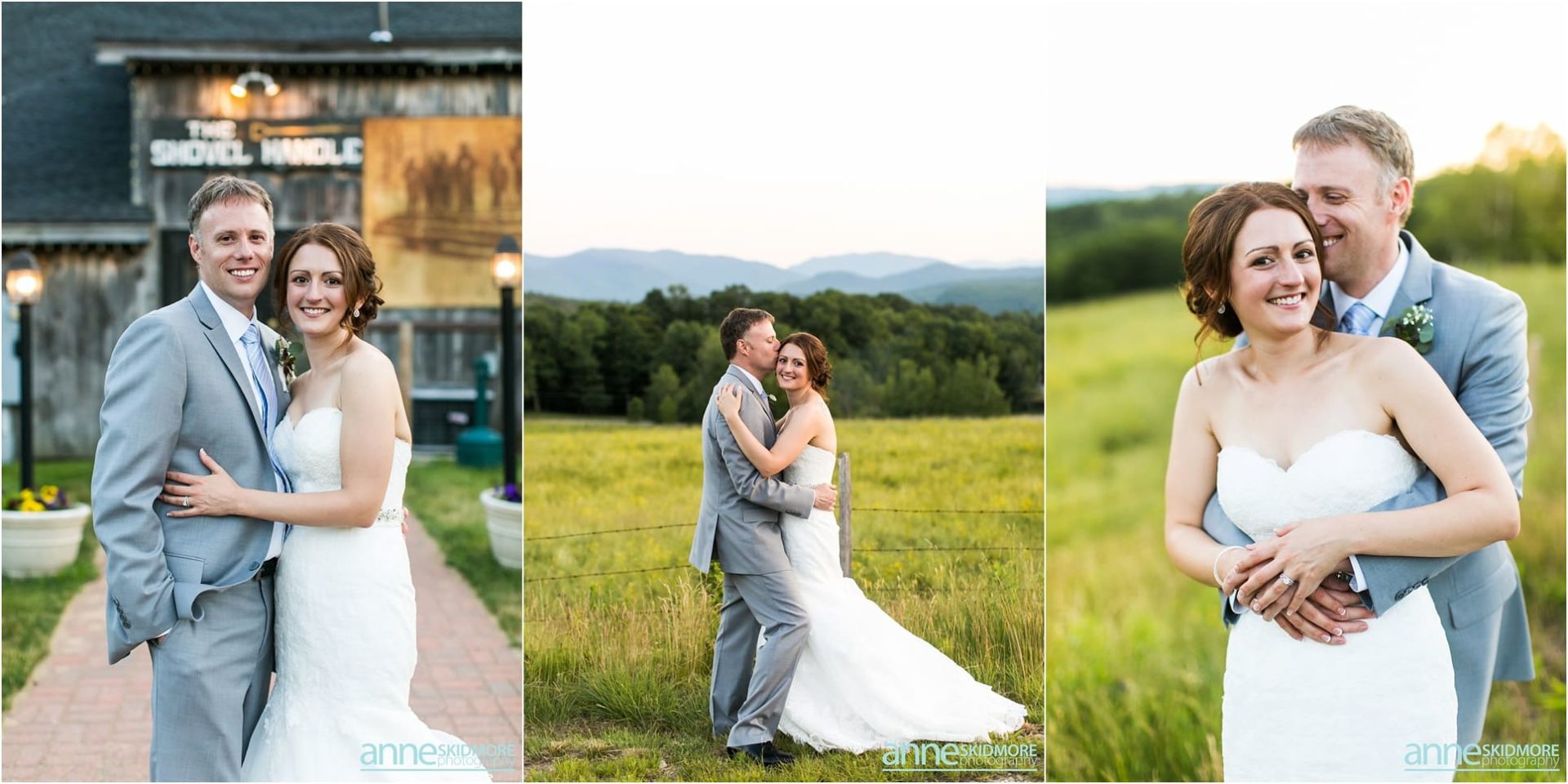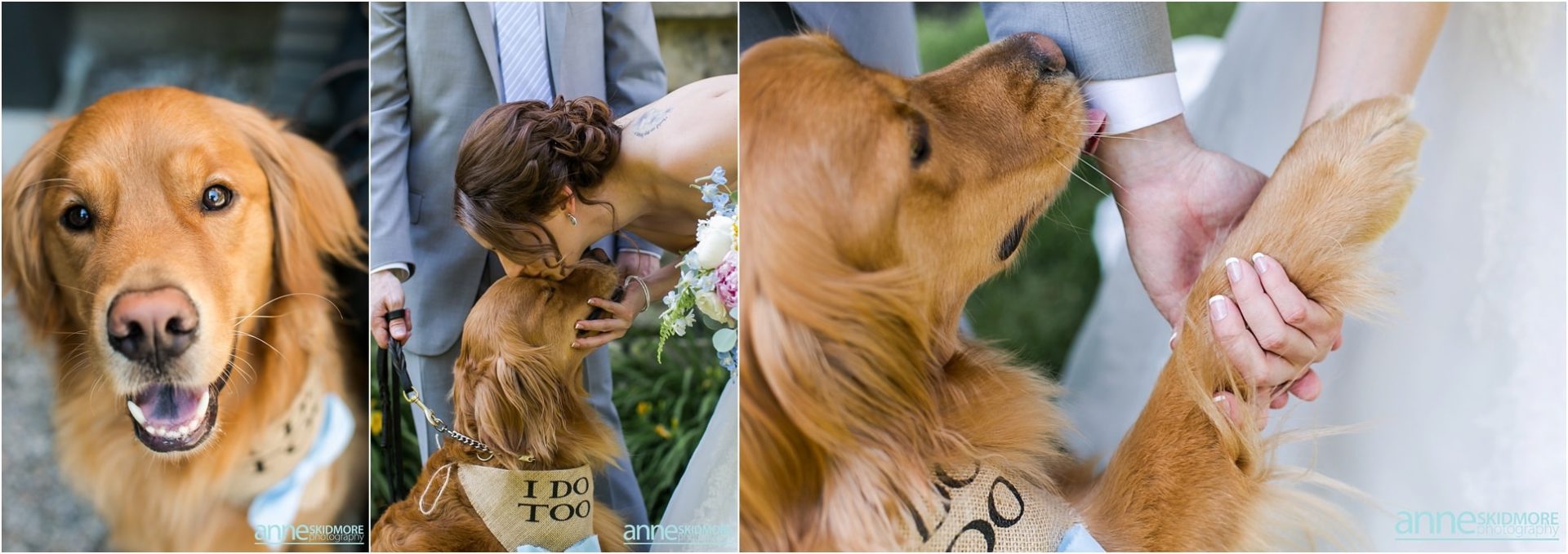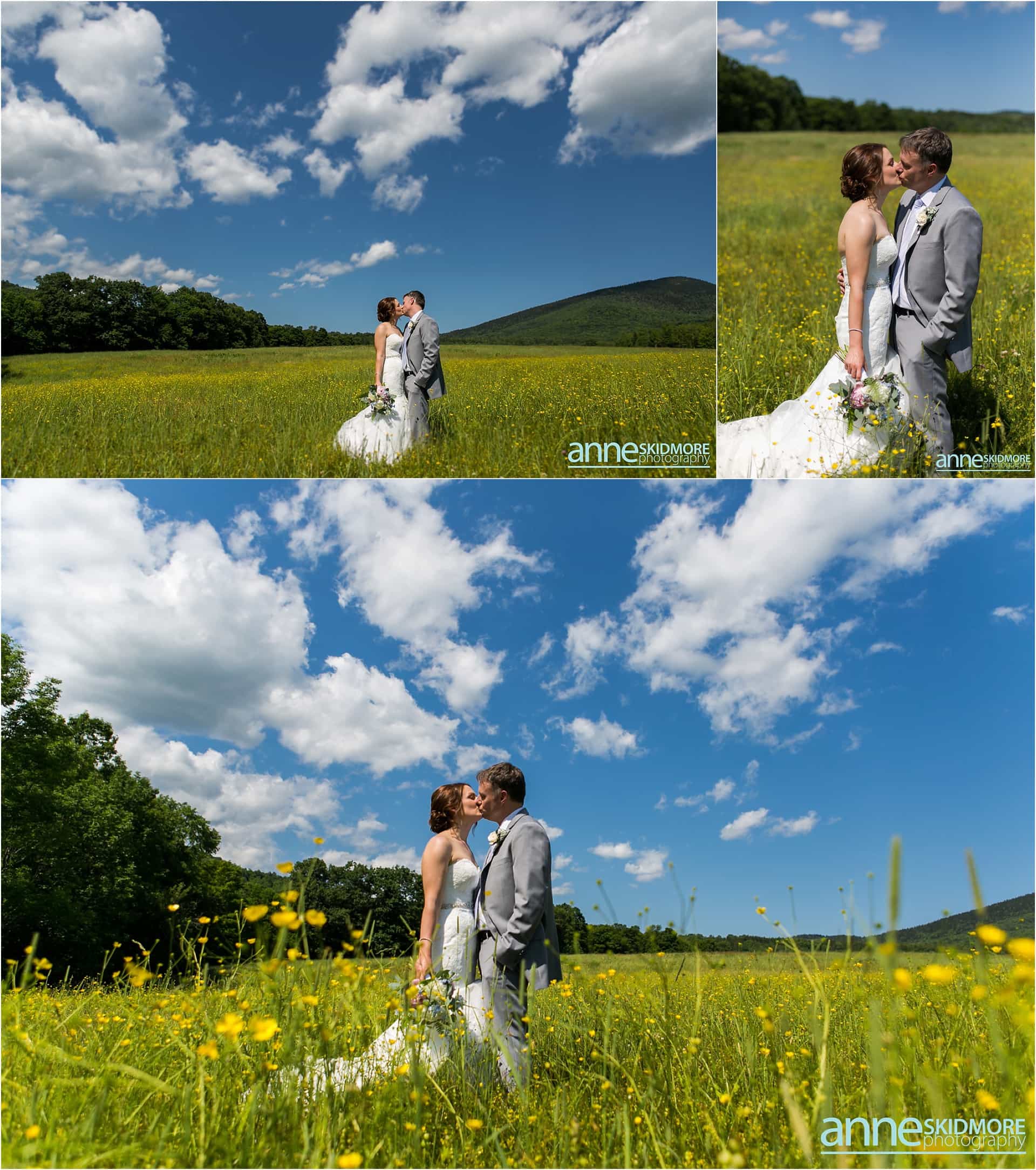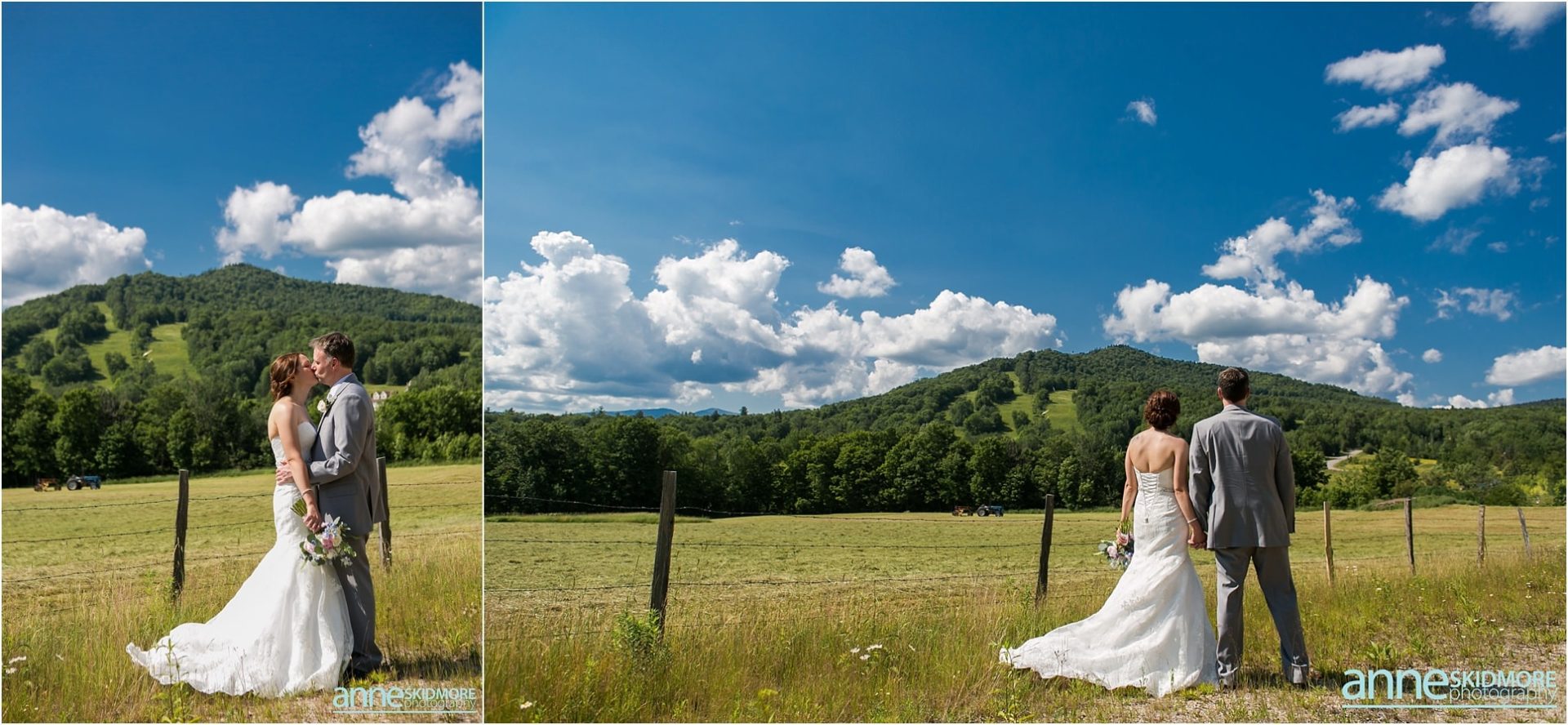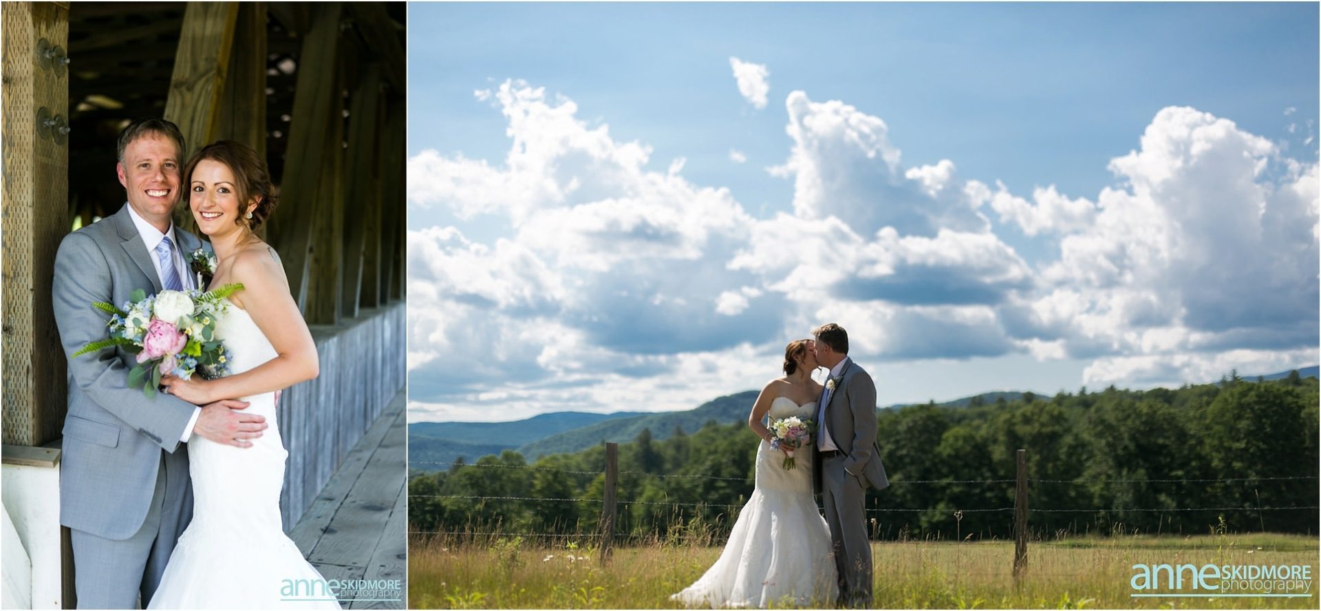 Pam and Jeremy were married on the most beautiful bluebird day at the Whitney’s Inn in Jackson, NH on June 25th, 2016. They expressed from the beginning how important it was for them to include their adorable golden retriever, Dakota, in the day surrounded by their best friends and family. I’m so glad the weather held and all their guests were able to see a typical New Hampshire summer day. Pam and Jeremy opted for a first look and Pam guessed it for sure…there were tears! We were able to utilize the open fields right down the road from the Whitney’s Inn for some portraits. The fields were blooming with yellow flowers which really popped against the blue sky. We made a special trip down to the covered bridge before returning back to the Whitney’s Inn for family portraits and bridal party portraits. The ceremony was held in the new woodland site across the street in the woods. Really beautiful vows were said followed by the first kiss! The light was hitting just right during cocktail hour and the horses roamed over across the fields to say hello. A wonderful reception in the Shovel Handle Pub was lively and full of happy tears and lots of love. I’m so glad we were able to drive up to an overlook for the sunset. It’s such a special way to spend the last moments of daylight on your wedding day. Matt Spofford had everyone on the dance floor all night long! What a fun wedding you two had! Wishing you all the best in the world 🙂