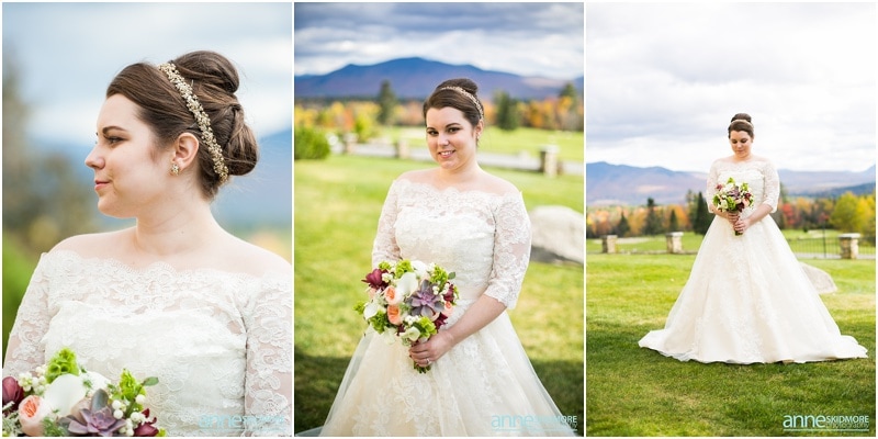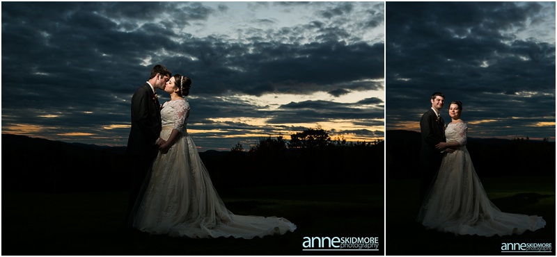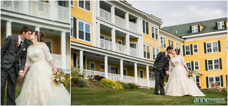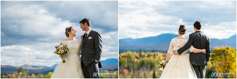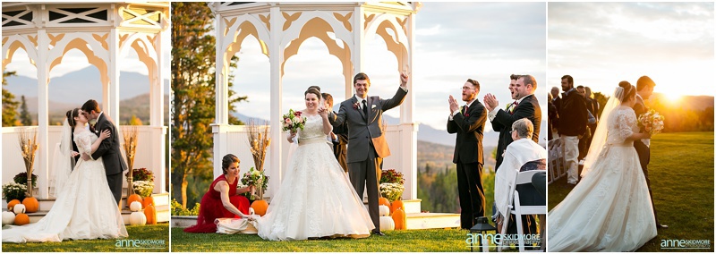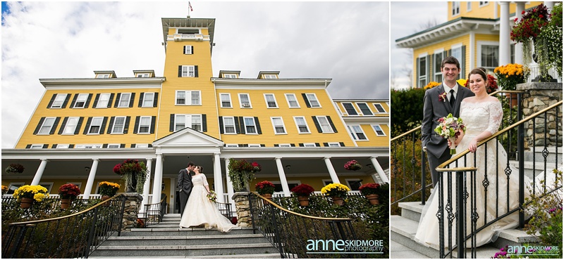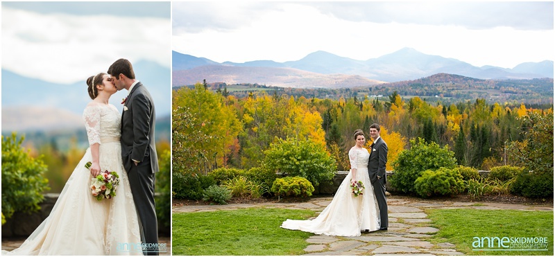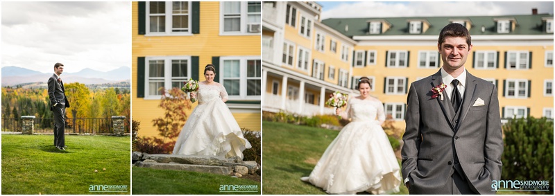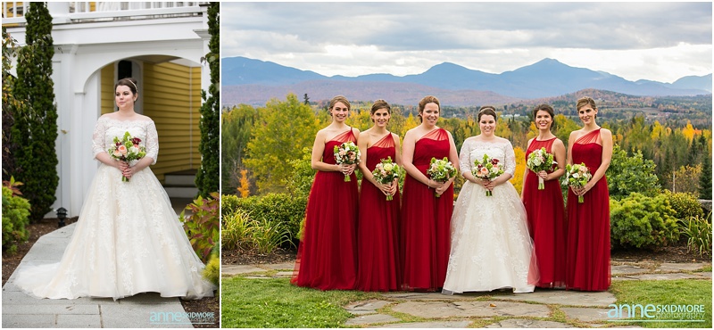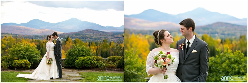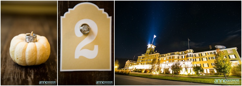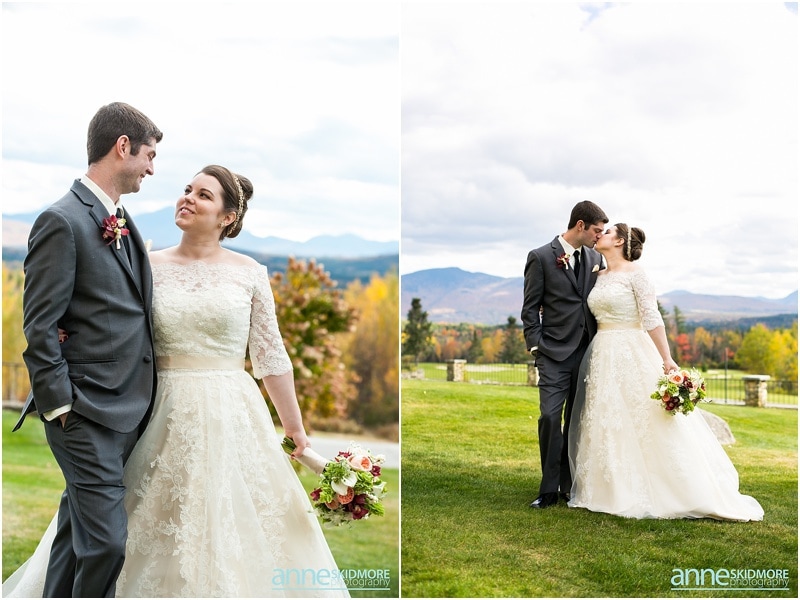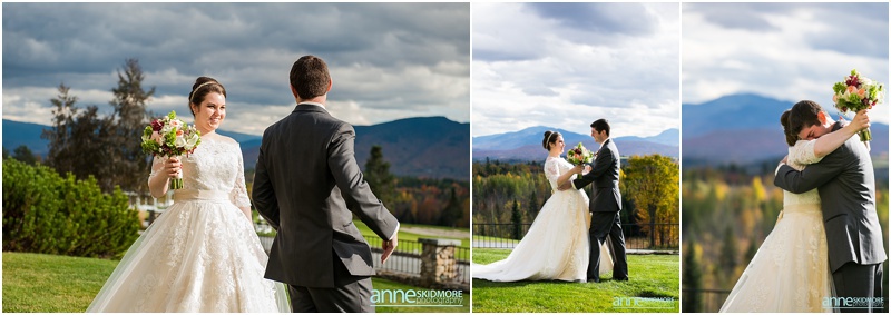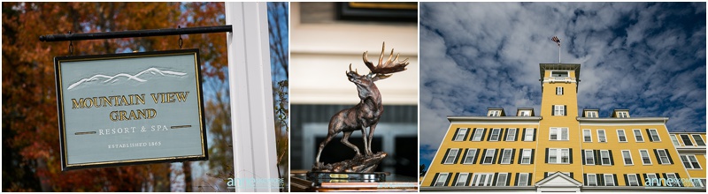 Fall is always a special time in New Hampshire, but it is especially beautiful up at the classic and historic hotel, The Mountain View Grand. Michael and Rachael wed there on October 11th, 2015 on a stunning and slightly overcast fall day. The slight overcast is a dream come true there, for when the sun is filtered, the mountains and the colors just seem to “pop” even more than usual! Michael and Rachael both got ready with the wedding parties inside the inn, and opted for an incredibly sweet first look moment. Michael could barely keep it together when he saw his bride in her brillant vintage-esque wedding gown. Right after their intimate moment, all of Rachael’s bridesmaids were out on a porch be hind them waving and giggling with excitement, so cute! We wondered all around the eloquent Mountain View Grand for their couple photos. It seemed like every time we turned around there was another beautiful spot, and the light was working with us perfectly. Oh, and the temperature was just perfect for a fall wedding day! After their portraits we met up with the bridal party and also family to do take those photos as well. Then it was almost sunset, which meant it was time for Michael and Rachael to get married on the Overlook Lawn with the sun, mountains, friends and family surrounding them. They had a beautiful ceremony, sealed it with a kiss, and were ready to celebrate with all that had traveled to be with them on their special day! There were dances, toasts, and more dancing that filled the evening. We even took a few special portraits right after the sun had just gone down. Wowza! What a day! Thank you Michael and Rachael! We LOVED capturing your beautiful day, and feel so lucky to have had the opportunity to work with such a lovely and sweet couple!