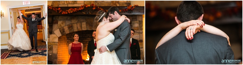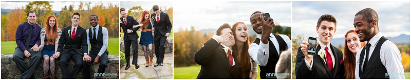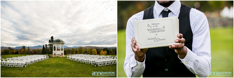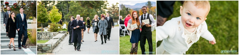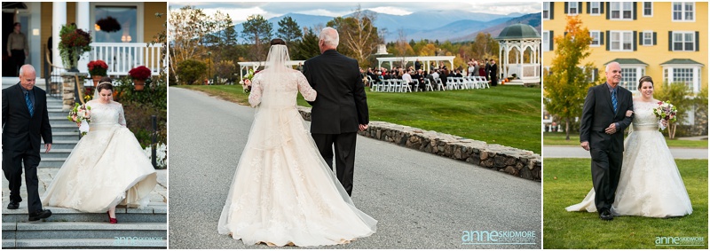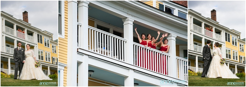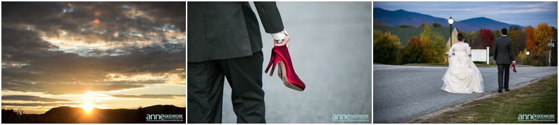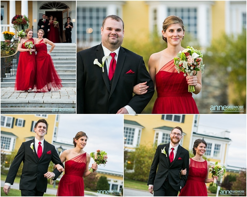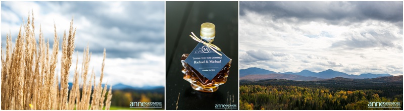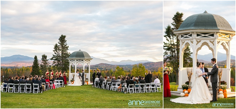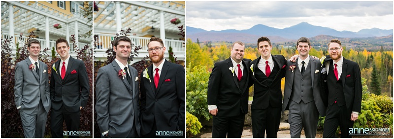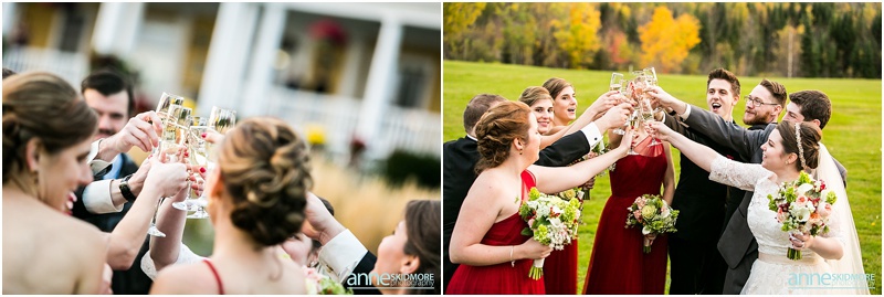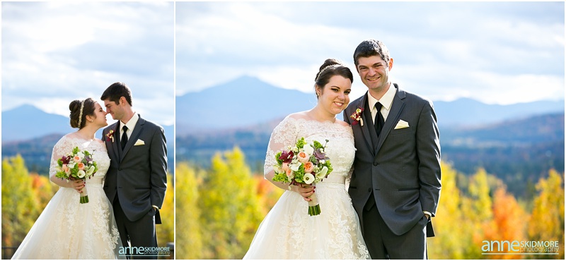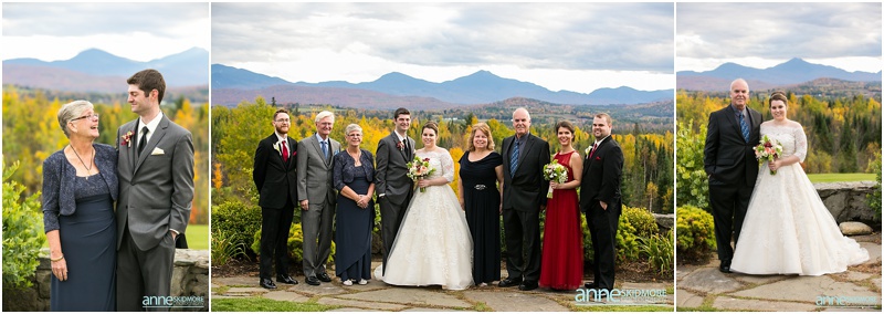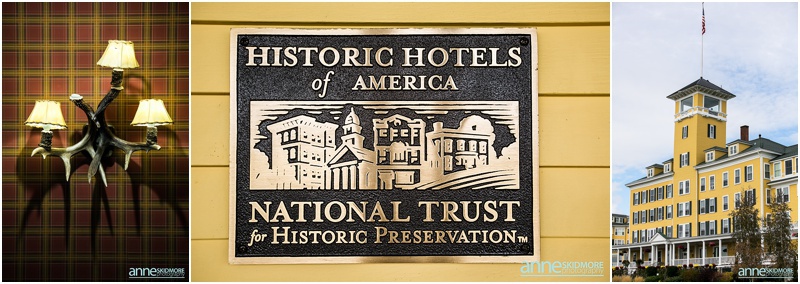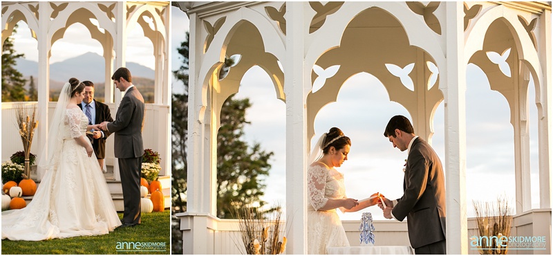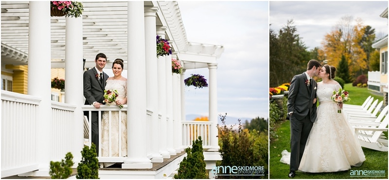 Fall is always a special time in New Hampshire, but it is especially beautiful up at the classic and historic hotel, The Mountain View Grand. Michael and Rachael wed there on October 11th, 2015 on a stunning and slightly overcast fall day. The slight overcast is a dream come true there, for when the sun is filtered, the mountains and the colors just seem to “pop” even more than usual! Michael and Rachael both got ready with the wedding parties inside the inn, and opted for an incredibly sweet first look moment. Michael could barely keep it together when he saw his bride in her brillant vintage-esque wedding gown. Right after their intimate moment, all of Rachael’s bridesmaids were out on a porch be hind them waving and giggling with excitement, so cute! We wondered all around the eloquent Mountain View Grand for their couple photos. It seemed like every time we turned around there was another beautiful spot, and the light was working with us perfectly. Oh, and the temperature was just perfect for a fall wedding day! After their portraits we met up with the bridal party and also family to do take those photos as well. Then it was almost sunset, which meant it was time for Michael and Rachael to get married on the Overlook Lawn with the sun, mountains, friends and family surrounding them. They had a beautiful ceremony, sealed it with a kiss, and were ready to celebrate with all that had traveled to be with them on their special day! There were dances, toasts, and more dancing that filled the evening. We even took a few special portraits right after the sun had just gone down. Wowza! What a day! Thank you Michael and Rachael! We LOVED capturing your beautiful day, and feel so lucky to have had the opportunity to work with such a lovely and sweet couple!
