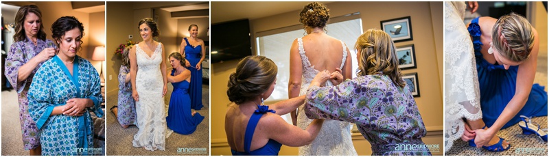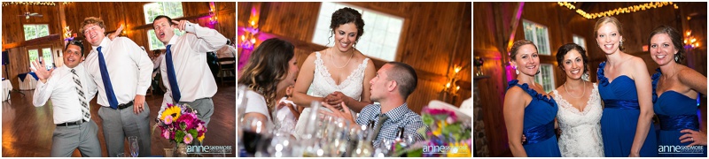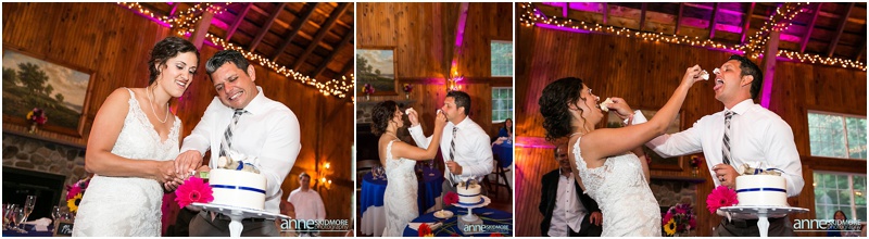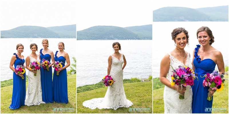 Newfound Lake is a beautiful body of water here in New Hampshire, and this lake for Brie and Eric was extra special as Brie’s parents have a home right on the lake itself. With this connection it was the obvious choice for them to have their wedding day! Brie got ready at her parents home, and Eric was right next door at another lakeside house. Brie, her bridesmaids and her mother wore beautiful floral robes as they were getting ready, so pretty! And speaking of pretty, Brie’s flowers were simply stunning and done by Mary of Lotus Floral Designs. Portraits on the lake were a must prior, and they set up to have the ceremony in the backyard of Brie’s parents home! Their sweet nieces carried signs to present the bride, and Brie’s father walked her down the aisle to Eric. They had a sweet and simple ceremony there, and sealed it with a kiss! After the ceremony we took a few more portraits by the lake with family members and the bridal party, and then it was time for a few special portraits of the newly weds. Then it was celebration time back at The Inn on Newfound Lake. What a beautiful place! The inn is classic and their barn for the wedding celebration is stunning inside! Bold blues accented the barn and guests even received homemade blueberry jam as favors. Toasts, dancing and a hilarious cake cutting episode filled the evening with laughter. We even snuck away for a beautiful sunset portrait to top off the day! Congratulations Eric & Brie, what a beautiful a wedding it was and thank you to Dominic Casserly for second shooting with us for the day!