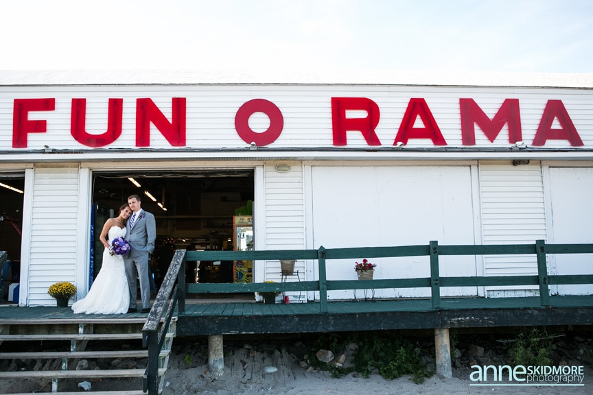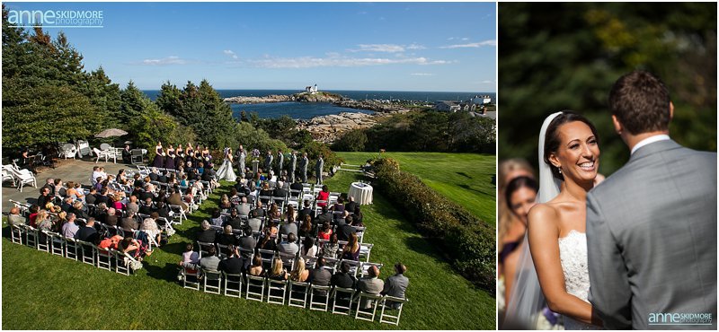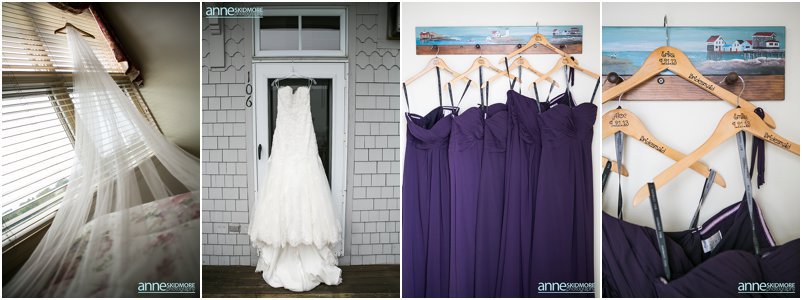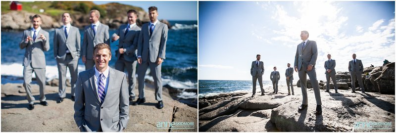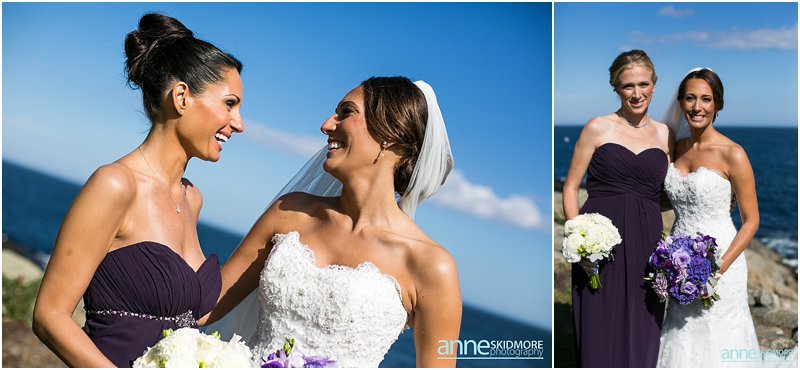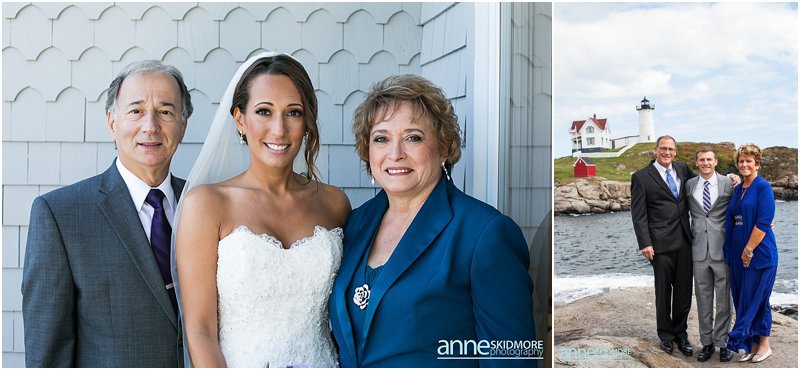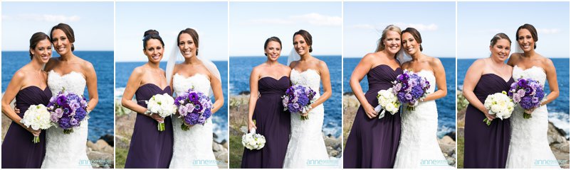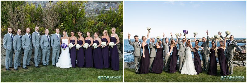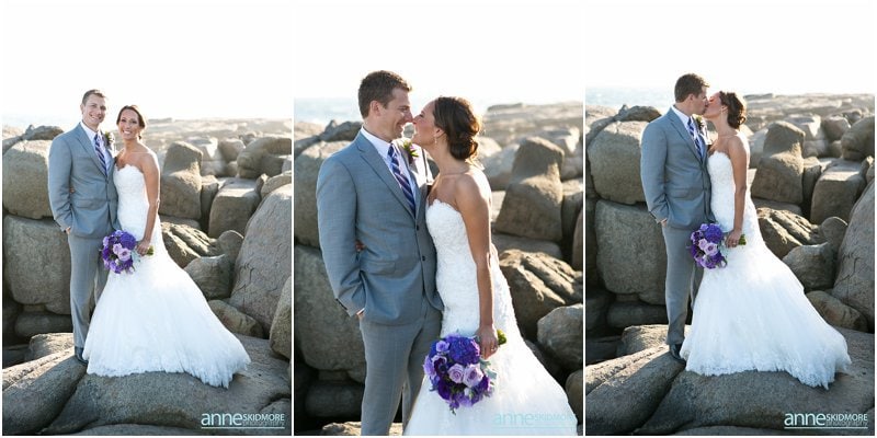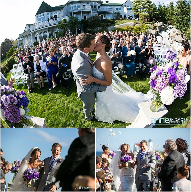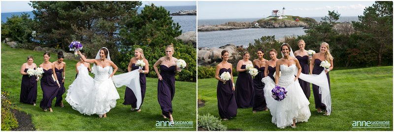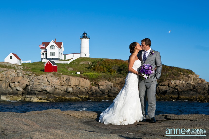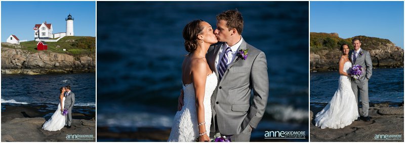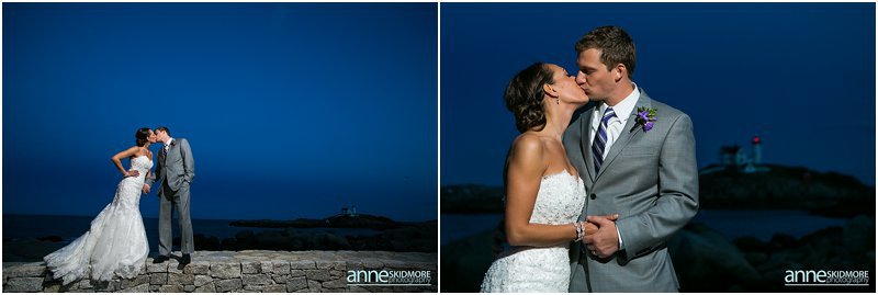 The sun broke through the clouds at 11 am on September 21st, 2013, turning a cold and foggy morning into a beautiful wedding day for Dan and Kristen at the View Point Hotel. Kristen and her six bridesmaids dressed in a beautiful suite as they got ready for the day. Dan was just across the street with his groomsmen and promptly headed to the Nubble Lighthouse for portraits with his family and groomsmen before the ceremony. The porch outside of Kristen’s suite offered beautiful light for portraits but also took many of her portraits down by the ocean. It was then time for Kristen to hide, as friends and family were starting to arrive for the ceremony! They had a gorgeous ceremony on the upper lawn of the hotel and were officiated by their close friend, Ben. Dan and Kristen asked that I capture their first kiss as husband and wife with all their friends and family cheering them on in the background. What a fun image! After the ceremony, we took family and bridal party photographs and it was then time for Dan and Kristen’s newlywed photos. They hopped in my blue Subaru Impreza and we drove off to the Nubble Lighthouse on Cape Neddick. The lighthouse, the rocks, and the ocean…..it was all stunning. Next, we headed towards the boardwalk of York, Maine. Such a historic area with lots of character! To top it off, an old golden retriever made his way to Dan & Kristen on the boardwalk, and plopped himself right in between them! These two dog lovers were as smitten as was I! After a few more photos, and a good bye to the ol’ pup, we headed back for the celebration. It was filled with dances, toasts, wonderful food, and yep, more dancing. We even were able to sneak out at dusk to grab some beautiful dusk photos with the Nubble Lighthouse in the background. It was such a gorgeous day! At the end of the evening as I was leaving, Kristen sadly asked, “So, this means I’ll never see you again?” I promised to stay in touch and meet her in Portsmouth for a drink sometime. Congrats you two! We simply LOVED you two and your wedding day!