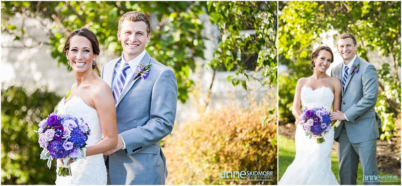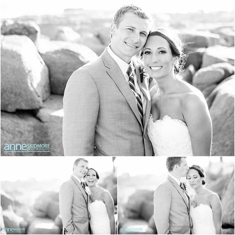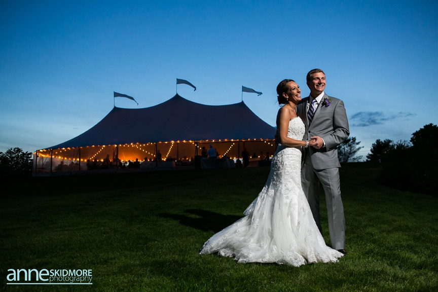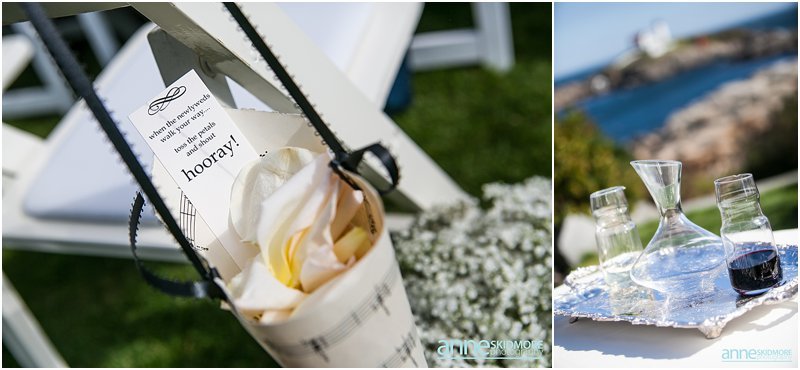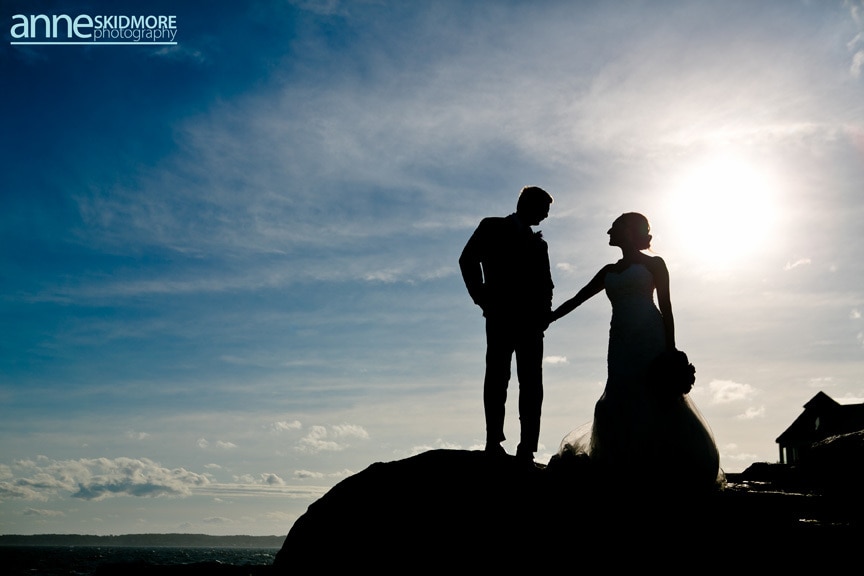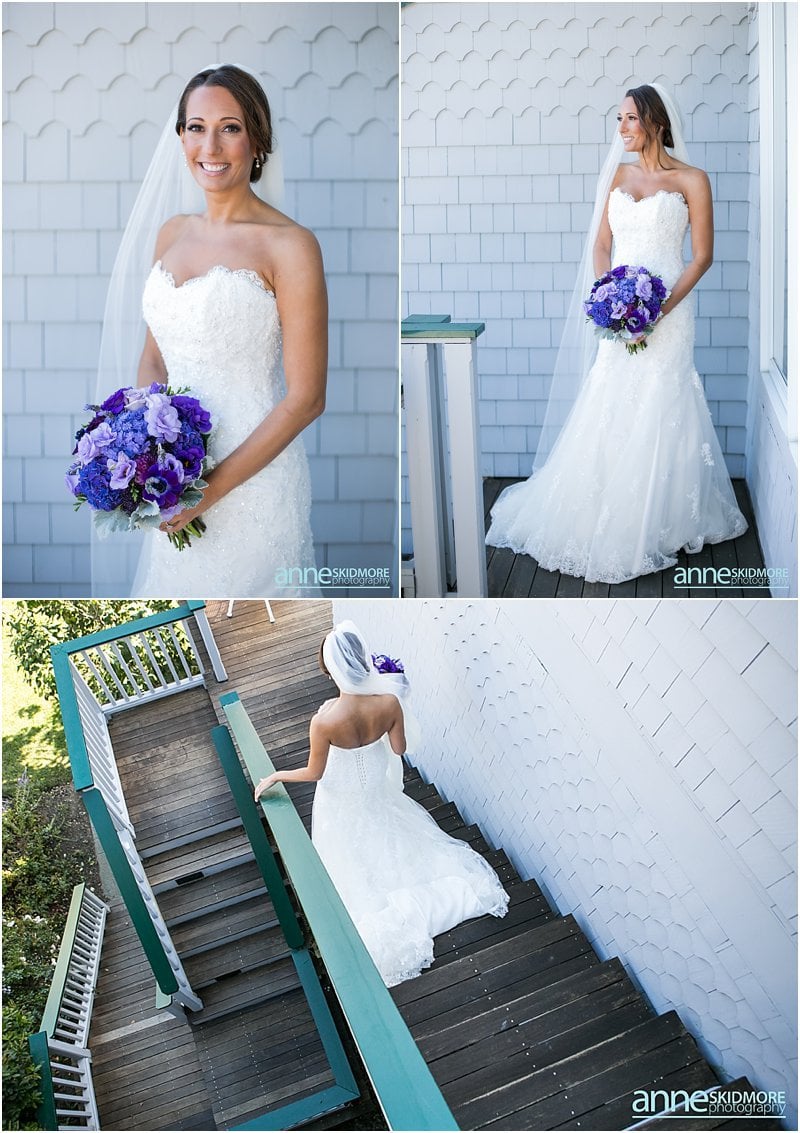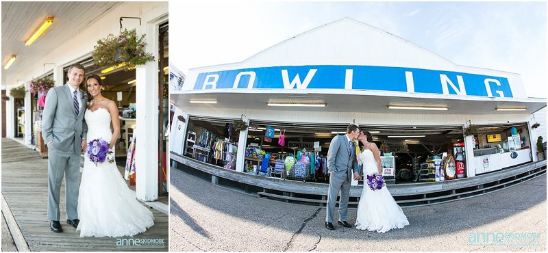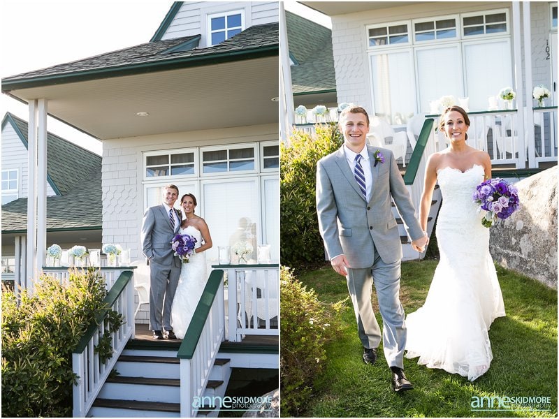 The sun broke through the clouds at 11 am on September 21st, 2013, turning a cold and foggy morning into a beautiful wedding day for Dan and Kristen at the View Point Hotel. Kristen and her six bridesmaids dressed in a beautiful suite as they got ready for the day. Dan was just across the street with his groomsmen and promptly headed to the Nubble Lighthouse for portraits with his family and groomsmen before the ceremony. The porch outside of Kristen’s suite offered beautiful light for portraits but also took many of her portraits down by the ocean. It was then time for Kristen to hide, as friends and family were starting to arrive for the ceremony! They had a gorgeous ceremony on the upper lawn of the hotel and were officiated by their close friend, Ben. Dan and Kristen asked that I capture their first kiss as husband and wife with all their friends and family cheering them on in the background. What a fun image! After the ceremony, we took family and bridal party photographs and it was then time for Dan and Kristen’s newlywed photos. They hopped in my blue Subaru Impreza and we drove off to the Nubble Lighthouse on Cape Neddick. The lighthouse, the rocks, and the ocean…..it was all stunning. Next, we headed towards the boardwalk of York, Maine. Such a historic area with lots of character! To top it off, an old golden retriever made his way to Dan & Kristen on the boardwalk, and plopped himself right in between them! These two dog lovers were as smitten as was I! After a few more photos, and a good bye to the ol’ pup, we headed back for the celebration. It was filled with dances, toasts, wonderful food, and yep, more dancing. We even were able to sneak out at dusk to grab some beautiful dusk photos with the Nubble Lighthouse in the background. It was such a gorgeous day! At the end of the evening as I was leaving, Kristen sadly asked, “So, this means I’ll never see you again?” I promised to stay in touch and meet her in Portsmouth for a drink sometime. Congrats you two! We simply LOVED you two and your wedding day!