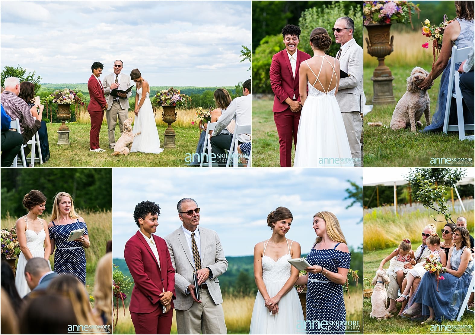 Let’s start from the top! We were so fortunate to meet Margie & Talicia through Margie’s sister Gina, who runs an amazing farm (Hancock Family Farm) where we receive our CSA veggies from every summer and early fall. When Gina explained to us that her sisters wedding was on her parents beautiful farm in Maine, it sounded picture perfect. We met Talicia & Margie at the Honeyhill Farm, and the was just as beautiful and homey as we envisioned. These two fabulous ladies wed on a beautiful summers day in July, where everyone chipped in to help make their day so magical. Margie’s father was putting up garland and running around setting up decorations, Gina did all the flowers with flowers from her farm, Margie’s close girlfriends were helping her get ready and stay calm, while Talicia’s mother and brother were helping her get ready in the barn. These two brides were just glowing through and through, and their beautiful smiles were contagious! Before their ceremony they hosted a cocktail hour for their guests to enjoy and get acquainted with the property. When it was time for the ceremony, Margie’s twin nieces who were the flower girls threw their flowers down the aisles, and then both Talicia & Margie’s mothers walked them both down the aisle. Their ceremony was personal and sweet, with one of the family pups coming up to the alter for a visit and giving everyone a good laugh. Soon the girls sealed their marriage with a kiss and it was time to celebrate. Cocktails on the lawn followed the ceremony while we did portraits. An amazing Maine lobster meal catered by The Bread & Butter Catering Co. was thoroughly enjoyed by all! After dinner the the evening was filled with catching up with friends, evening sunset portraits, toasts, and dancing with music by DJ DeVanity. Wow! What a day it was and we were so very honored to capture the marriage of two amazing women!