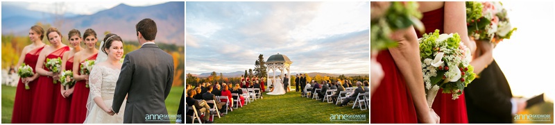Fall is always a special time in New Hampshire, but it is especially beautiful up at the classic and historic hotel, The Mountain View Grand. Michael and Rachael wed there on October 11th, 2015 on a stunning and slightly overcast fall day. The slight overcast is a dream come true there, for when the sun is filtered, the mountains and the colors just seem to “pop” even more than usual! Michael and Rachael both got ready with the wedding parties inside the inn, and opted for an incredibly sweet first look moment. Michael could barely keep it together when he saw his bride in her brillant vintage-esque wedding gown. Right after their intimate moment, all of Rachael’s bridesmaids were out on a porch be hind them waving and giggling with excitement, so cute! We wondered all around the eloquent Mountain View Grand for their couple photos. It seemed like every time we turned around there was another beautiful spot, and the light was working with us perfectly. Oh, and the temperature was just perfect for a fall wedding day! After their portraits we met up with the bridal party and also family to do take those photos as well. Then it was almost sunset, which meant it was time for Michael and Rachael to get married on the Overlook Lawn with the sun, mountains, friends and family surrounding them. They had a beautiful ceremony, sealed it with a kiss, and were ready to celebrate with all that had traveled to be with them on their special day! There were dances, toasts, and more dancing that filled the evening. We even took a few special portraits right after the sun had just gone down. Wowza! What a day! Thank you Michael and Rachael! We LOVED capturing your beautiful day, and feel so lucky to have had the opportunity to work with such a lovely and sweet couple!