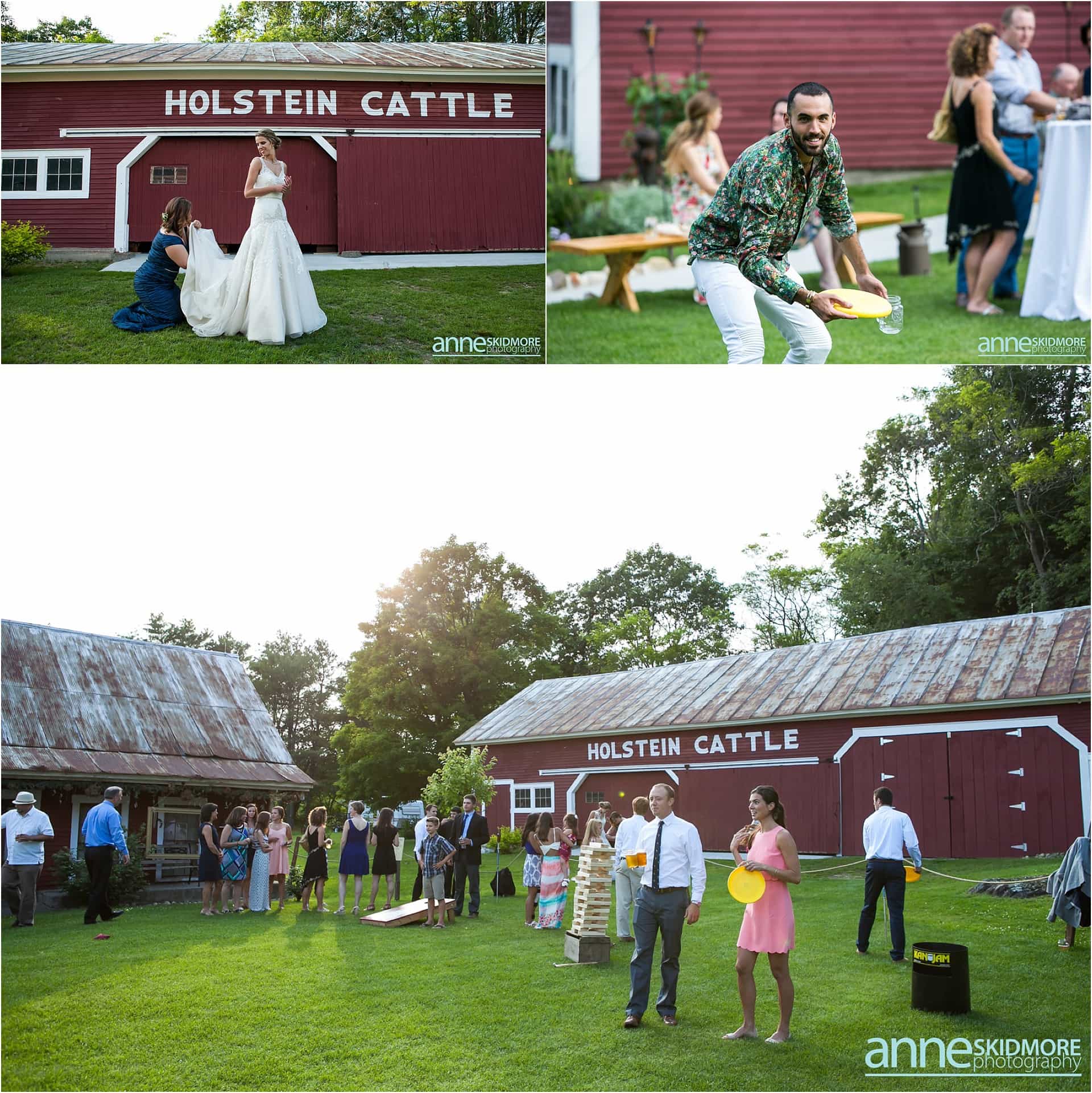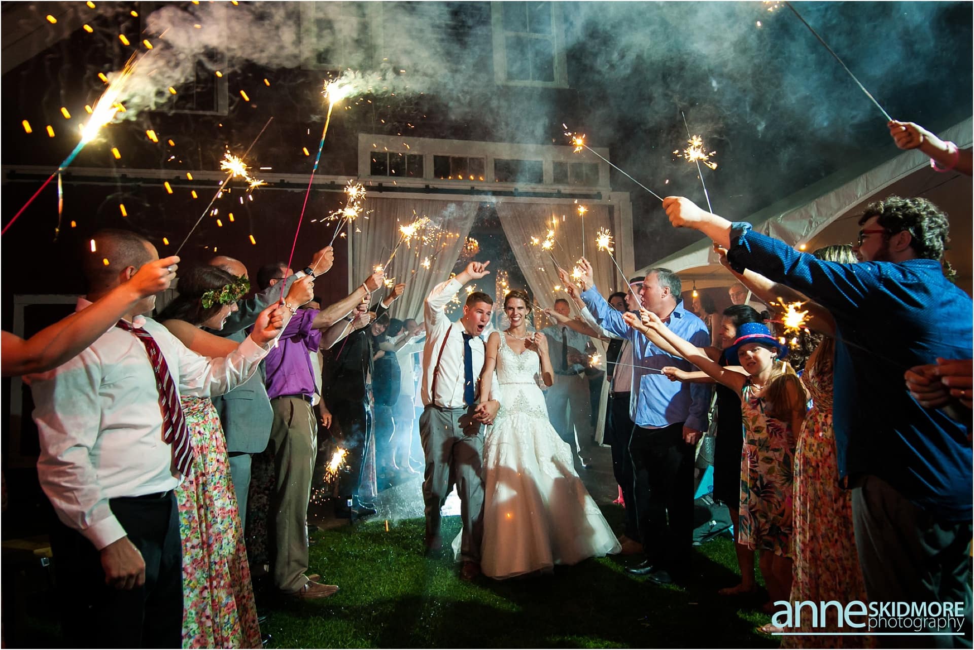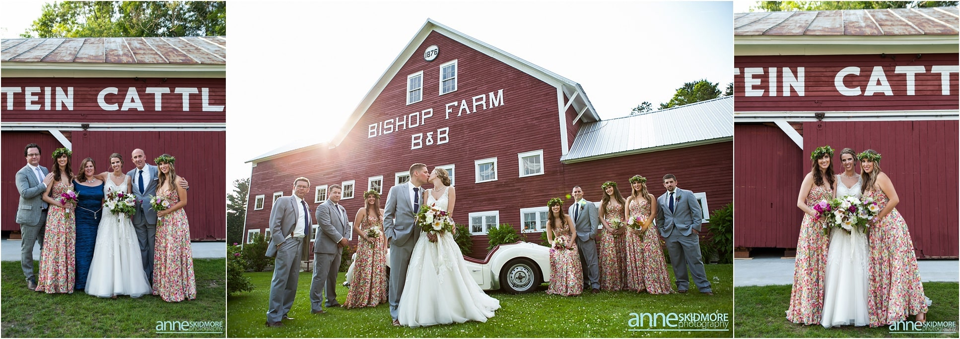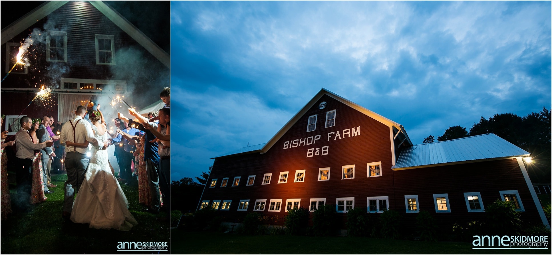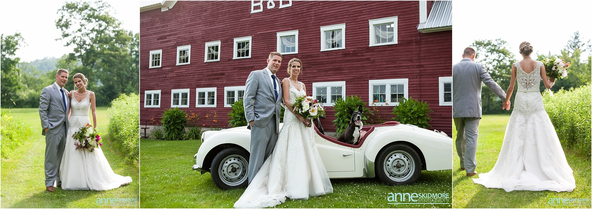 Independence Day, for many Americans, is a day to celebrate the kick-off of summer with barbecues, fireworks, music, picnics and family. More importantly, it represents a new beginning. I find it quite perfect that Kelly and James chose to marry each other on this monumental day: July 4th, 2015. Not only will they enjoy anniversaries on a celebratory holiday each year but they can confidently move forward into their new life together and have their own new beginning. I was introduced to Kelly through our good friend and fellow colleague, Tara, who expressed this wedding was going to be a special one. I would go beyond special and say it was absolutely amazing. Gorgeous flowers, a rustic venue, an elegant dress, a restored car, sparklers, and truly happy and loving people all graced the grounds at the Bishop Farm in Lisbon, New Hampshire. Kelly explained to me she had no official wedding colors and pieced together patterns and textures of all sorts to create this bold and unique environment. I’m so glad you did! I think it worked perfectly. Hops and Hera, Kelly and James’s two dogs, were a vital part of the day. They roamed the farm and were constantly checking in on Kelly as she was getting ready in the barn. Overall, the day was so free-flowing; utilizing the entire property, guests wandered as they wished and were so happy doing so. After the ceremony up on the hill, cocktail hour began on the lawn outside the main barn. A classic July 4th meal, composed of the barbecue necessities, allowed people to rejoice in their summertime favorites. The evening hours and the beginning of nightfall kicked off the many interesting (I mean, inspirational!) dance moves. No one held back on the dance floor, that’s for sure! You can’t end a Fourth of July wedding without a grand sparkler exit. There was even a light sprinkle of rain as they exited the barn. Kelly and James, we will never forget this wedding day. We hope these images bring you so much joy in the many years to come! Happy Fourth!