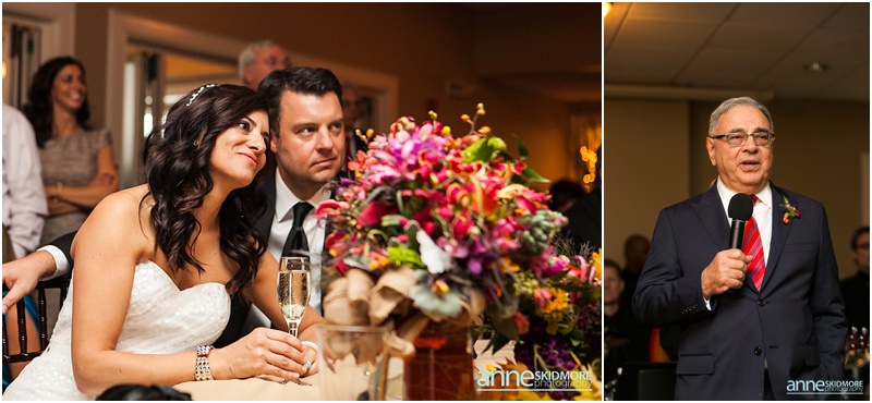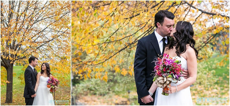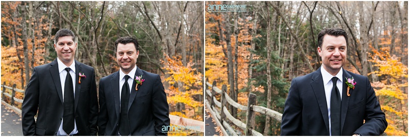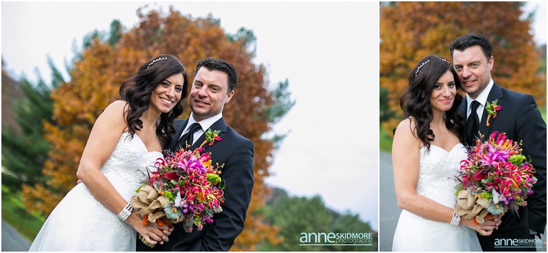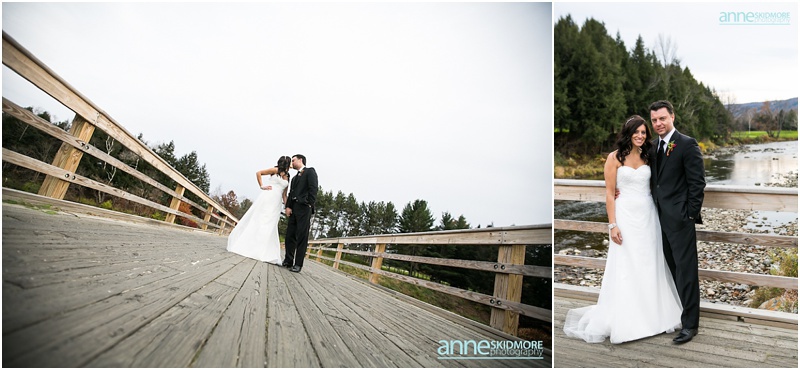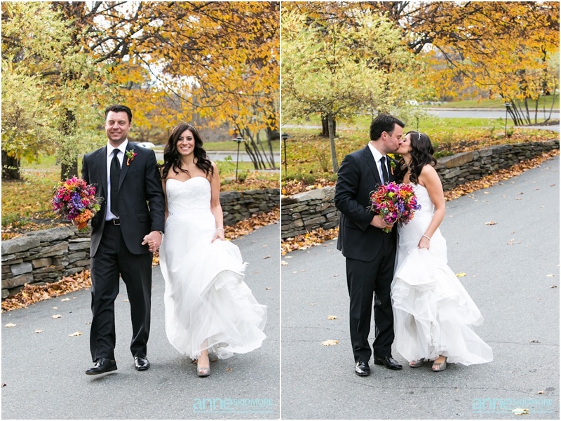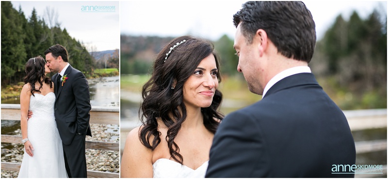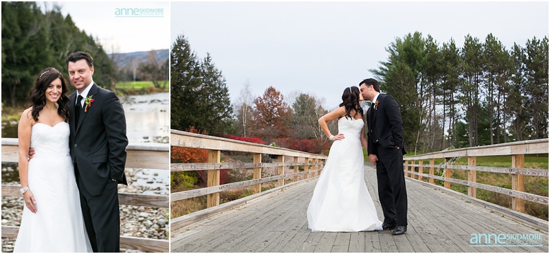 The 26th of October was a proper brisk fall day on Jeff & Kim’s wedding at the Quechee Club in Vermont. However, the day started at the Woodstock Inn, just a few miles down the road, where Kim got ready for her big day. This entire area of Vermont is just lovely. It is filled with so much character, charm and history! We took a few family photos at the Woodstock Inn and bopped around for a few special portraits of Kim in quaint Woodstock, Vermont. Jeff was back at the Quechee Club getting suited up for his big day. Soon Kim stepped into her limo and we were off to the Quechee Club for the ceremony. The ceremony room was filled with one hundred and eighty friends and family. They had a lovely ceremony with Kim’s nieces were her bridemaids, special family readings, and sealed it will a kiss! Family portraits were taken out on the porch of the Club, and then Kim and Jeff were ready to brave the cool temperatures for their intimate portraits. The Quechee Club is quite beautiful with the rolling Green Mountains in the background, and ponds and bridges and more surrounding you. After their portraits they were ready to warm up and join all their guests inside the club house. The evening was simply fantastic from there on out. Beautiful toasts, first dances, a special song sung by Kim’s dear friend Pam, and non stop fun and music by the band New York Edge Music. Thank you so much Kim & Jeff, it was such a beautiful way to say goodbye to October!