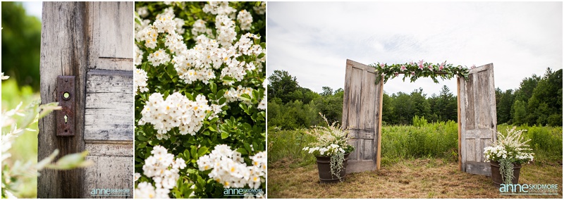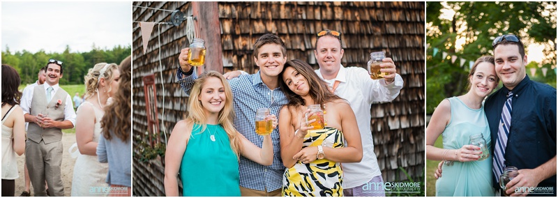 Set in the hills of Tamworth, New Hampshire, Tearyn wed Jamie at a private residence on June 28th, 2014 overlooking the White Mountains. With a newly built barn, flowers everywhere, blooming fields and unending details, guests of the wedding were definitely in for a treat! It was such a laid back and casual wedding, however, not lacking in style one bit. Beautiful flowers dressed the tables, a hand-built door arbor stood amongst the fields, the barn was hung with lights and signs, the garden was watered and the sun was shining- the stage was set for a perfect day for a wedding. Tearyn slipped into her wedding dress with her bridesmaids at The Darby Field Inn. I was able to capture some portraits of her in the natural light of the afternoon. What a beautiful bride! Jamie finished setting up the last remaining details with his groomsmen and was quick to get ready (as they always are) just in time to greet guests as they walked up the dirt road. Guests were handed a personalized mason mug and offered a drink to walk up the mowed path in the fields behind the farmhouse. The ceremony site couldn’t have been any more picturesque. Jamie hand-made the door arbor himself and had been mowing the fields and pruning trees for months before the wedding. Despite the 80-degree hot summer day, guests filled with joy as they watched the high school sweethearts finally say “I Do”. After capturing a fun group shot, Tearyn and Jamie slipped away and focused on themselves as we took portraits around the farmhouse and fields. A Mediterranean themed dinner was served, beer was poured, toasts were given and the laughter and dancing soon began. I loved how free all the guests were to roam around the property during the day. People were socializing throughout the barn, farmhouse, and fields, walking around, thoroughly enjoying the afternoon and being outside amongst New Hampshire’s beauty. Tearyn and Jamie were up for sunset portraits, in the natural light and in the final darkness of the evening overlooking the mountains. We had the most wonderful time at your wedding Tearyn and Jamie. Thank you for giving me the opportunity to capture such a beautiful day. Congratulations you two!!