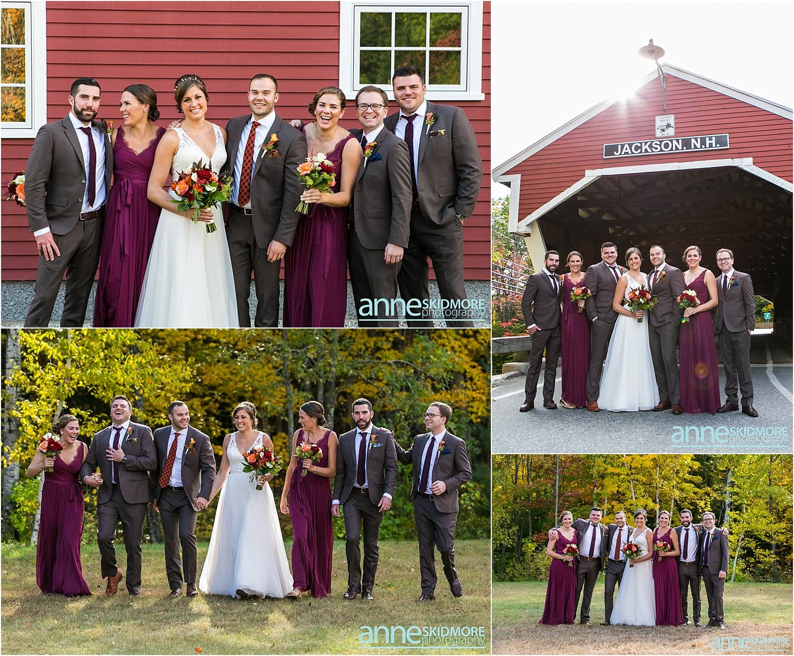 If you love beautiful fall weddings with impeccable color, this wedding is for you! Allie and Nick wed this past October at the Whitney’s Inn, in Jakson, New Hampshire. The Whitney’s Inn is one of our favorite places to shoot, as it is surrounded by the White Mountains and has one of the most stunning barns. All the tree colors were exploding and the sun warmed their October day perfectly! To top it off, we were also lucky enough to have the talented Dominic Casserly from Little Outdoor Giants second shooting with us on this fine fall day. Allie and Nick got ready separately and had their sweet first look moment in front of the old Shovel Handle Ski Lift Shack. Allie looked stunning in her flow lace gown with her sweet gold leaf headpiece while Nick was looking sharp in his dark brown suit with orange accents. We wandered all over Jackson to make sure we captured the essence of their fall mountain wedding day. And did we find color, it was bursting everywhere! We met their bridal party at the Jackson Covered Bridge for a few photos as well, and then it was time for this couple to officially get married. Their wedding ceremony was held on the grounds next to the Whitney’s Inn, and after their “I Do’s” their cocktail hour was hosted on the lawn right in front of the inn. It truly was the perfect October day! The rest of the evening was hosted inside the quintessential barn and was filled with toasts, special dances, laughter, and great music by DJ Jeff Erwin of ReThink The DJ. And we even snuck for a few stunning sunset portraits too! What a day! Thank you Nick & Allie, it was such an incredibly beautiful day, and an honor to capture it.