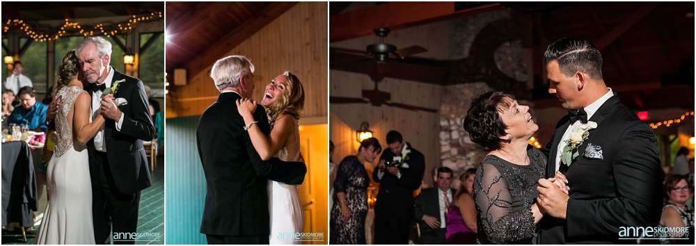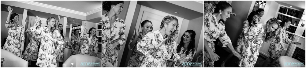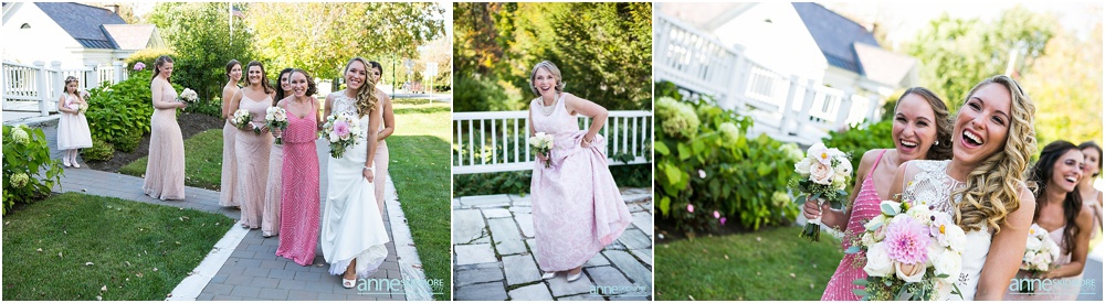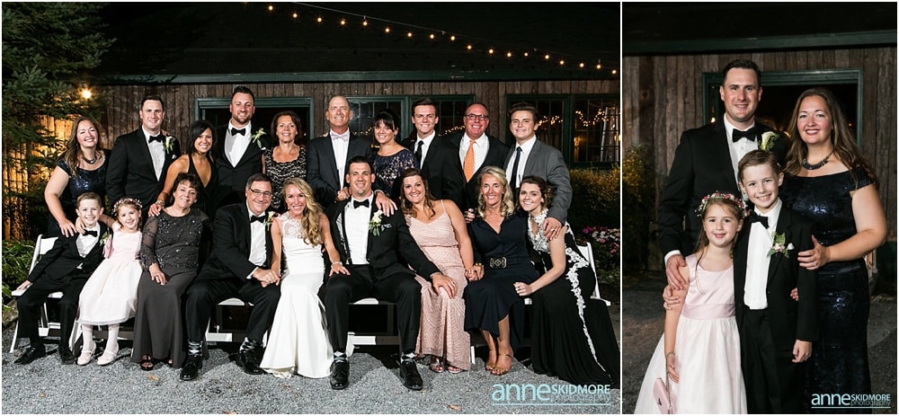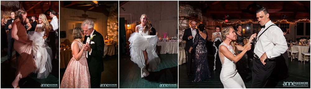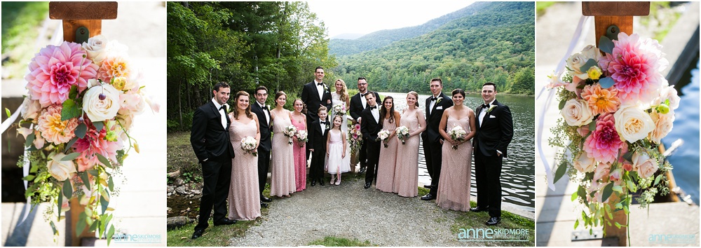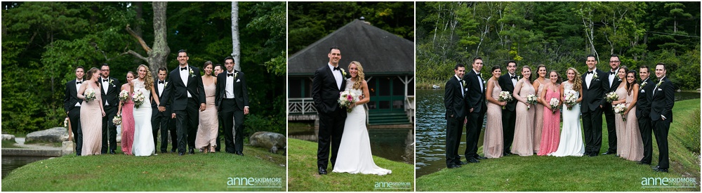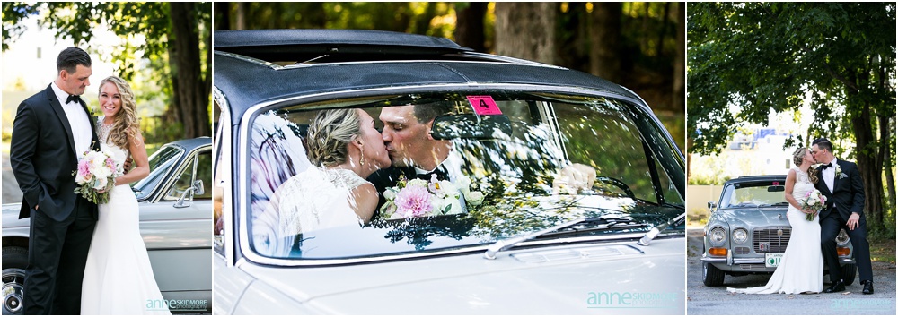 Manchester is in the heart of The Green Mountains of Vermont, and The Equinox Resort hotel itself is absolutely stunning with it’s stark white columns contrasting the green mountains and blue skies. To start their day of right, Justine and her girls had a special yoga session at the resort while Greg and the guys played some golf. Greg and his guys got ready all together at the Equinox while Justine and her ladies got all dolled up at the quaint Charles Orvis Inn of The Equinox Resort. Justine and her ladies wore adorable matching robes as they had their hair and makeup done with some sips of champagne. Greg and his men suited up in their classic black and white tuxedos and were soon off to the church. Justine wore an incredible Lela Rose wedding dress that was complimented perfectly with a pair of incredibly jeweled Badgley Mischka shoes and a stunning bouquet created by Flowers By Cara! We did some fun portraits of Justine and her girls at the inn, and it was an easy walk across the street to get to her “I Do’s” at the First Congregational Church. They had a lovely ceremony in the classic white steepled church, sealed it with a kiss, and exited with all their friends and family waving batons of ribbon in the air! An antique Jaguar awaited these newly weds when they exited the church, so they hopped in and zoomed away! We took stunning portraits with the antique car and also on the grounds of The Equinox Resort, but we also wanted to be sure to get some up at the Pond Pavilion, where their reception was being hosted. What an absolutely incredible spot! Located at the base of Mt. Equinox, this pond-side Pavilion has beautiful wooden details and awe inspiring views of the mountains. It was the perfect evening for a wedding with cocktails outside and dinner inside the beautifully Pavilion decorated with blush pink florals and gold accents. The night was filled with laughter, heartfelt toasts, lovely first dances, special group photos and then some darn right fun foot stompin’ dancing! We were even able to sneak in a few portraits right at the tail end of dusk! Thank you SO much Justine and Greg, it was a a dream to work with you two and absolute honor to document such a beautiful wedding day for such an absolutely wonderful couple! This is one we will cherish forever!