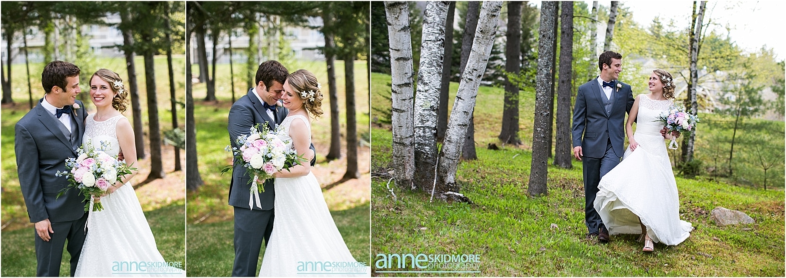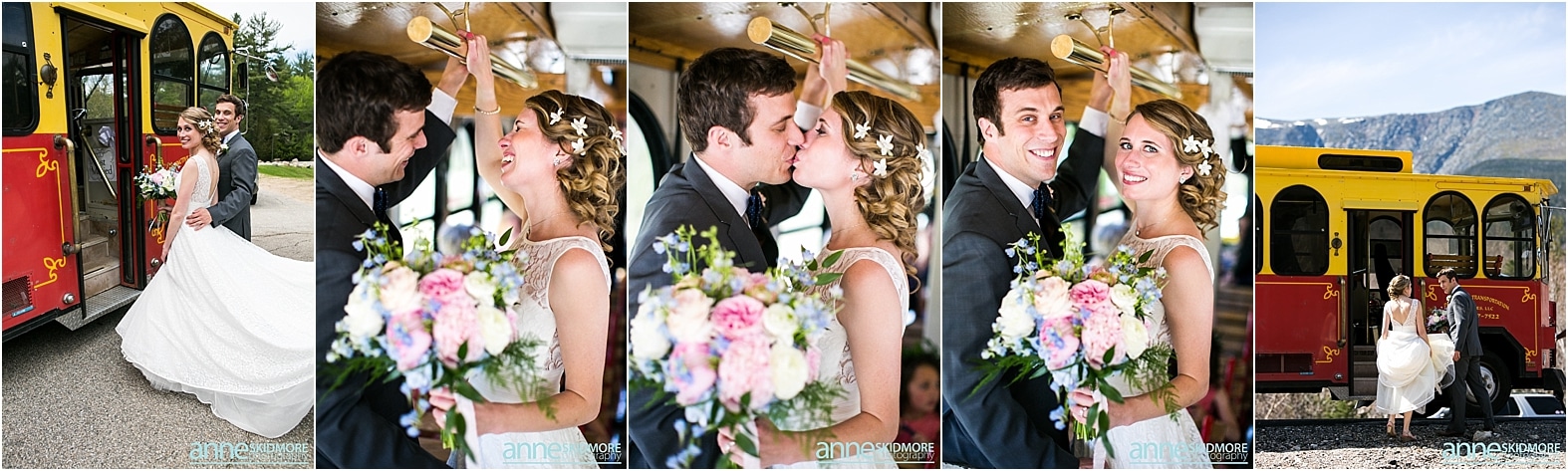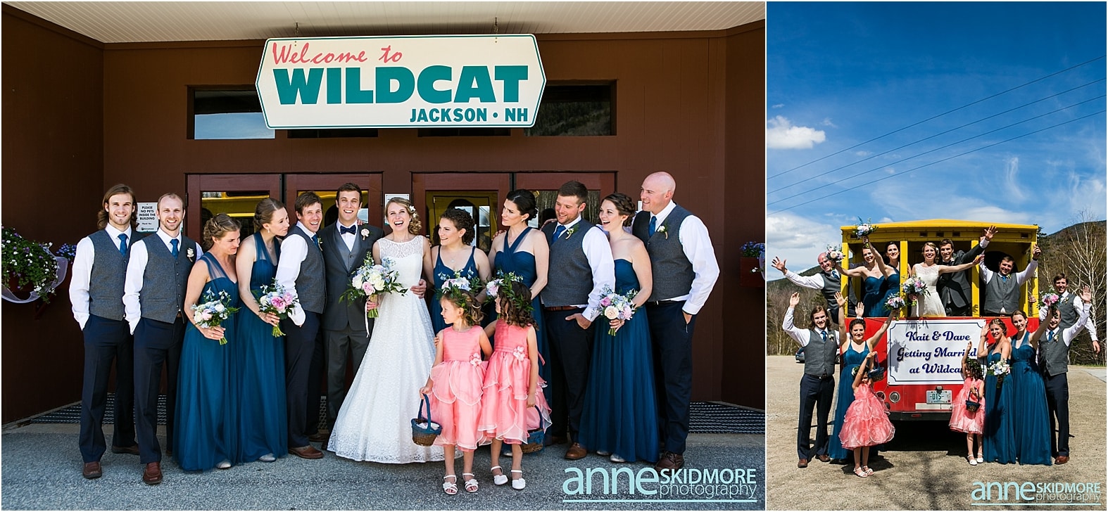 Dave and Kaitlyn’s wedding day was nothing short of awesome! It started at Attitash Mountain, with portraits in Pinkham Notch, their wedding at Wildcat Mountain, a few more portraits at the summit of Wildcat with Mount Washington in the background, and then skiing down on the very last bits of snow! Wow! Lets start from the beginning with these two love birds. Dave and Kaitlyn began their wedding day over at the Attitash Grand Summit with their bridal party and family. There they had a very sweet first look moment under the pines trees, and then hopped on Molly The Trolley to make their way to Wildcat Mountain for their wedding. But we had to make some stops along the way for some portraits. We pulled over for the classic “Welcome to the White Mountain National Forest” sign and then did another quick stop at the Beaver Ponds across from the Pinkham Notch visitors center. So pretty there with the most beautiful weathered wooden bridge. Last stop, Wildcat Mountain! The ceremony was held on a little peninsula of land that had streams running on either side of it, and white streamers were attached to the center aisle tree that lightly blew in the wind. Dutch Bloemen Winkel worked their magic on that one amazingly! Beautiful! After the ceremony, the fun really began! The bridal party loaded up on the gondolas and a select number of them had their skis all ready to join Kaitlyn and Dave down Wildcat. But first we had to take some portraits at the summit, and holy stunning with Mount Washington behind them in all its glory! Next, we documented Kait, Dave, and their skiing crew ripping it down on the very last snow at Wildcat! We’ll never forget Dave saying “that’s my wife” as he watched Kaitlyn shredding it down in her wedding dress! Now it was time to celebrate! The evening was hosted inside the main lodge and was filled with wonderful toasts and everyone dancing into the wee hours of the night! Thank you Dave & Kaitlyn! Your wedding was totally magnificent and unique, it was an absolute honor to capture it and get to know you two!