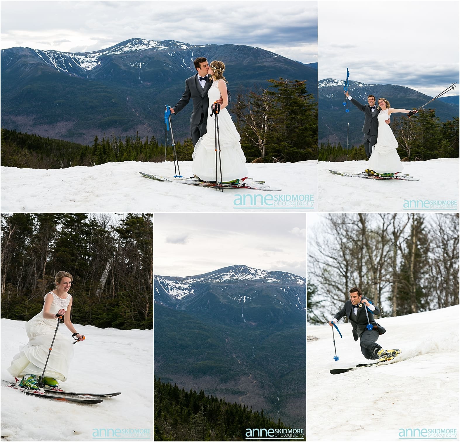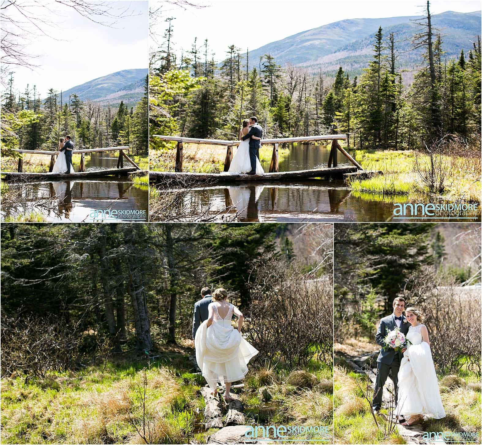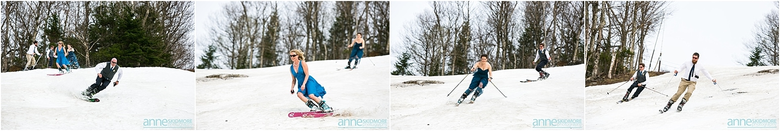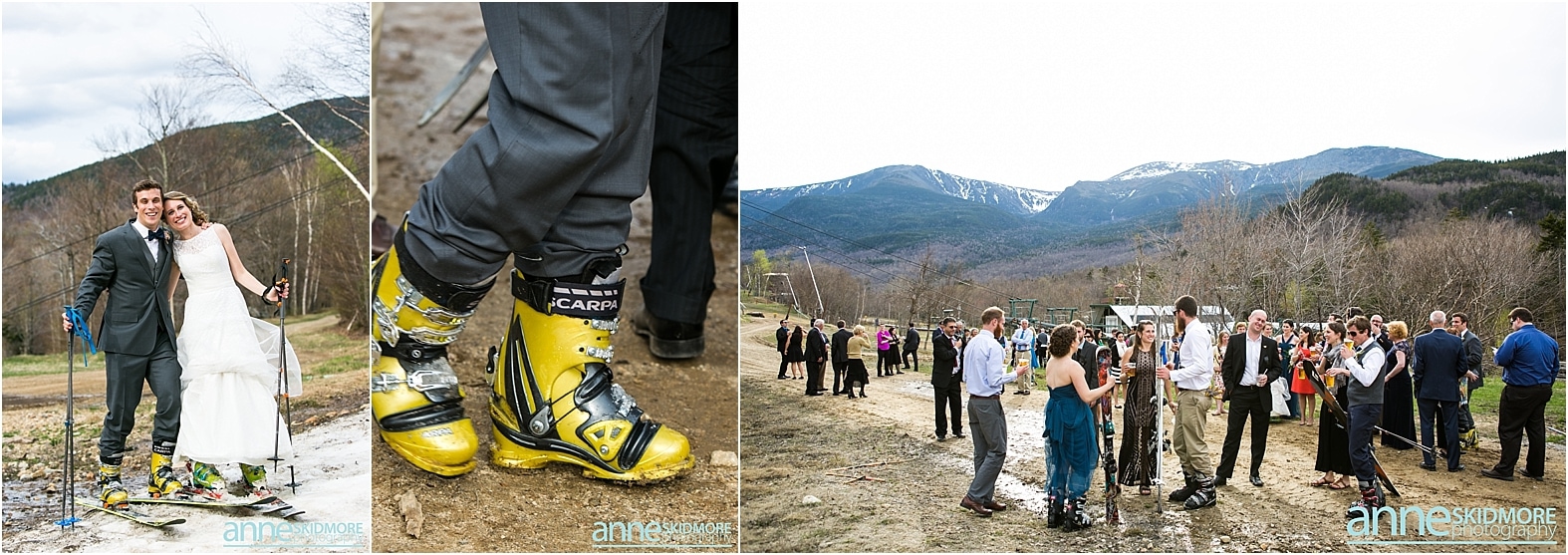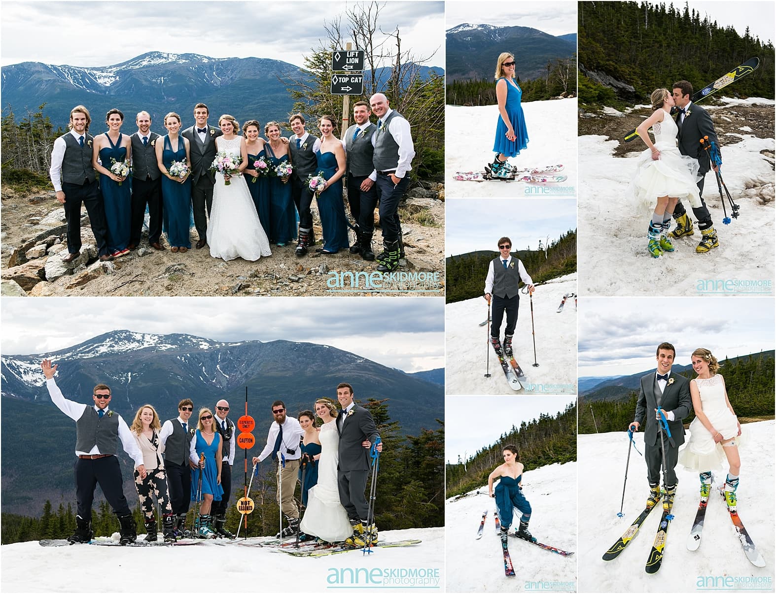 Dave and Kaitlyn’s wedding day was nothing short of awesome! It started at Attitash Mountain, with portraits in Pinkham Notch, their wedding at Wildcat Mountain, a few more portraits at the summit of Wildcat with Mount Washington in the background, and then skiing down on the very last bits of snow! Wow! Lets start from the beginning with these two love birds. Dave and Kaitlyn began their wedding day over at the Attitash Grand Summit with their bridal party and family. There they had a very sweet first look moment under the pines trees, and then hopped on Molly The Trolley to make their way to Wildcat Mountain for their wedding. But we had to make some stops along the way for some portraits. We pulled over for the classic “Welcome to the White Mountain National Forest” sign and then did another quick stop at the Beaver Ponds across from the Pinkham Notch visitors center. So pretty there with the most beautiful weathered wooden bridge. Last stop, Wildcat Mountain! The ceremony was held on a little peninsula of land that had streams running on either side of it, and white streamers were attached to the center aisle tree that lightly blew in the wind. Dutch Bloemen Winkel worked their magic on that one amazingly! Beautiful! After the ceremony, the fun really began! The bridal party loaded up on the gondolas and a select number of them had their skis all ready to join Kaitlyn and Dave down Wildcat. But first we had to take some portraits at the summit, and holy stunning with Mount Washington behind them in all its glory! Next, we documented Kait, Dave, and their skiing crew ripping it down on the very last snow at Wildcat! We’ll never forget Dave saying “that’s my wife” as he watched Kaitlyn shredding it down in her wedding dress! Now it was time to celebrate! The evening was hosted inside the main lodge and was filled with wonderful toasts and everyone dancing into the wee hours of the night! Thank you Dave & Kaitlyn! Your wedding was totally magnificent and unique, it was an absolute honor to capture it and get to know you two!