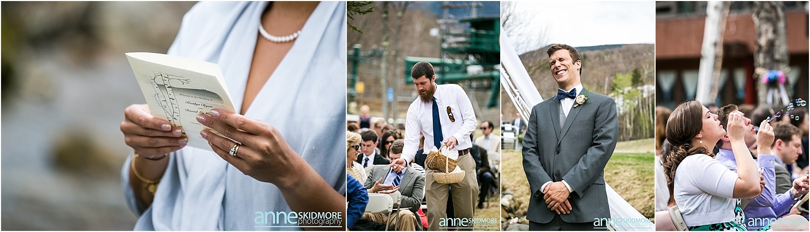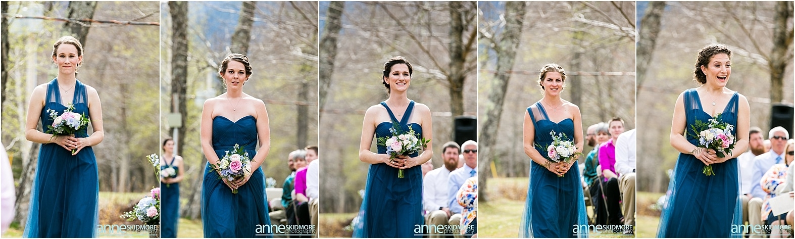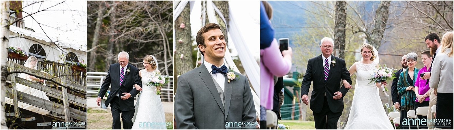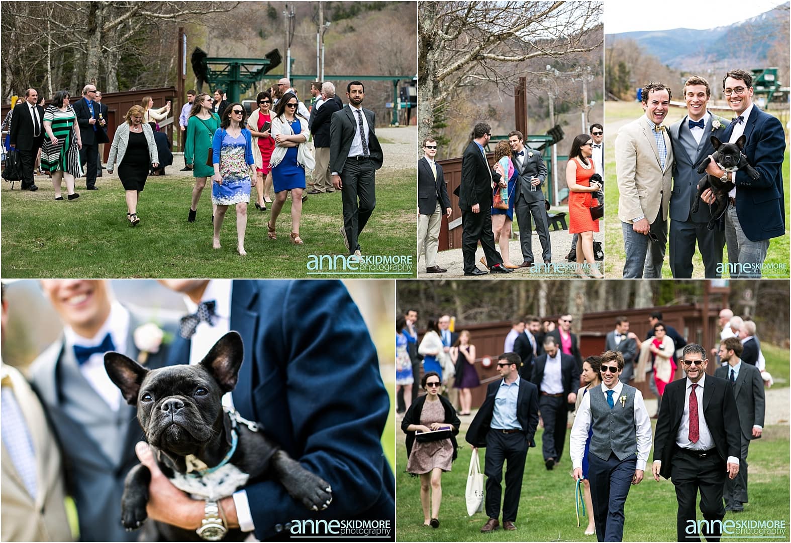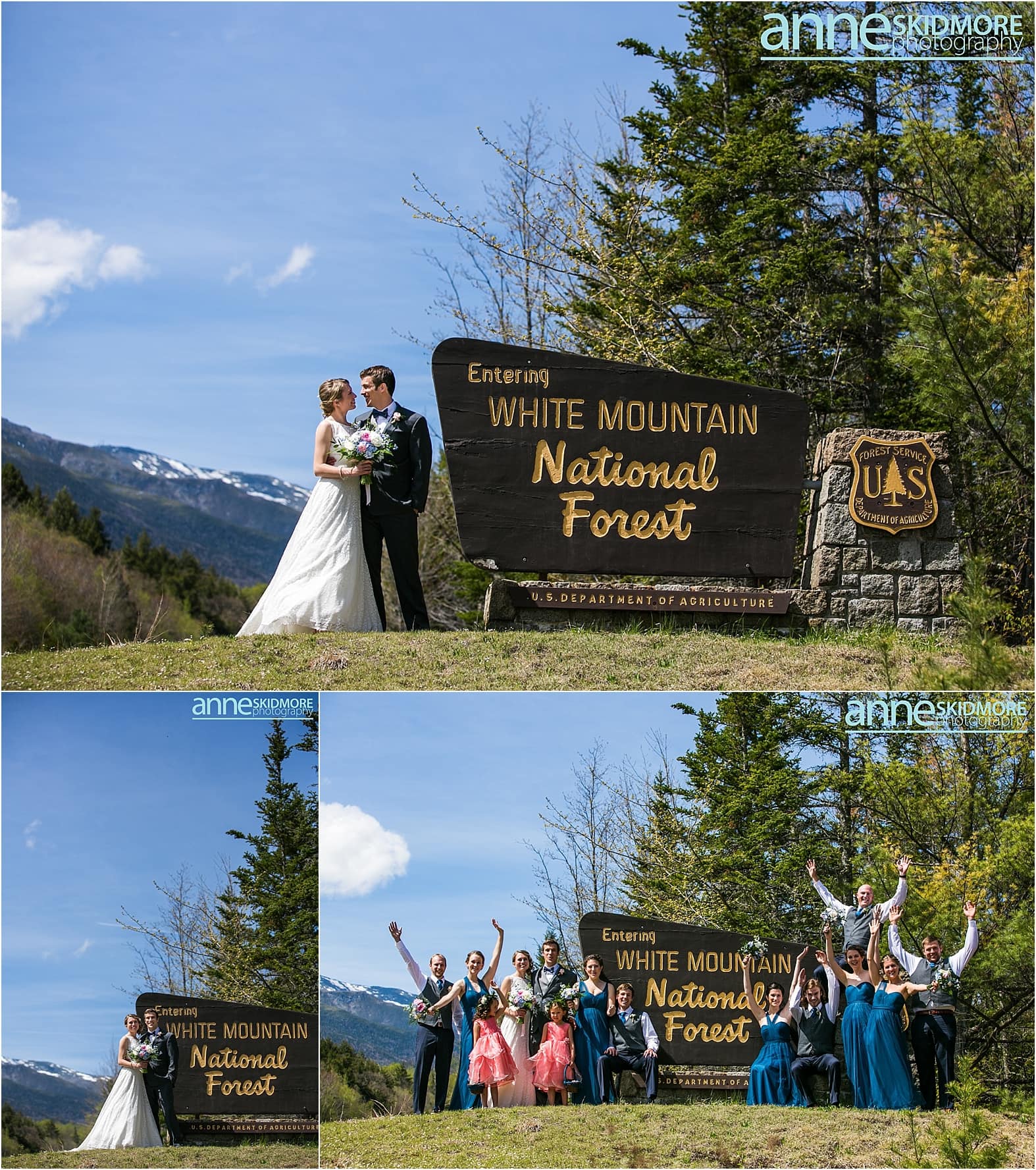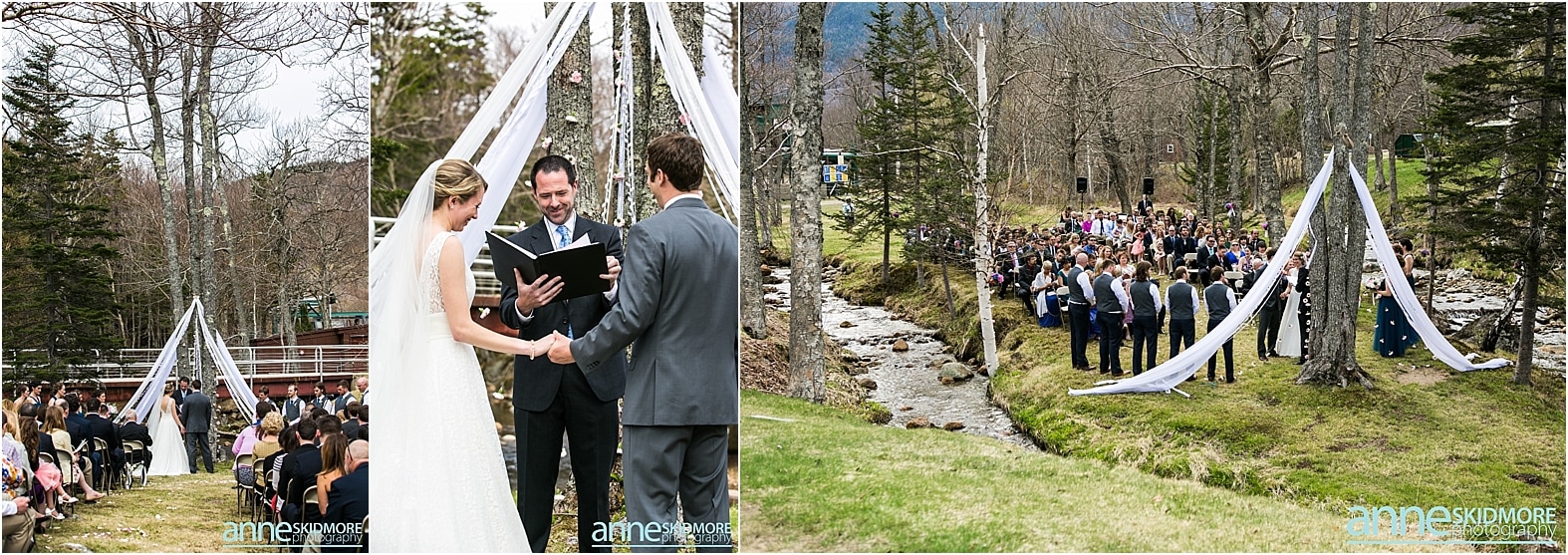 Dave and Kaitlyn’s wedding day was nothing short of awesome! It started at Attitash Mountain, with portraits in Pinkham Notch, their wedding at Wildcat Mountain, a few more portraits at the summit of Wildcat with Mount Washington in the background, and then skiing down on the very last bits of snow! Wow! Lets start from the beginning with these two love birds. Dave and Kaitlyn began their wedding day over at the Attitash Grand Summit with their bridal party and family. There they had a very sweet first look moment under the pines trees, and then hopped on Molly The Trolley to make their way to Wildcat Mountain for their wedding. But we had to make some stops along the way for some portraits. We pulled over for the classic “Welcome to the White Mountain National Forest” sign and then did another quick stop at the Beaver Ponds across from the Pinkham Notch visitors center. So pretty there with the most beautiful weathered wooden bridge. Last stop, Wildcat Mountain! The ceremony was held on a little peninsula of land that had streams running on either side of it, and white streamers were attached to the center aisle tree that lightly blew in the wind. Dutch Bloemen Winkel worked their magic on that one amazingly! Beautiful! After the ceremony, the fun really began! The bridal party loaded up on the gondolas and a select number of them had their skis all ready to join Kaitlyn and Dave down Wildcat. But first we had to take some portraits at the summit, and holy stunning with Mount Washington behind them in all its glory! Next, we documented Kait, Dave, and their skiing crew ripping it down on the very last snow at Wildcat! We’ll never forget Dave saying “that’s my wife” as he watched Kaitlyn shredding it down in her wedding dress! Now it was time to celebrate! The evening was hosted inside the main lodge and was filled with wonderful toasts and everyone dancing into the wee hours of the night! Thank you Dave & Kaitlyn! Your wedding was totally magnificent and unique, it was an absolute honor to capture it and get to know you two!